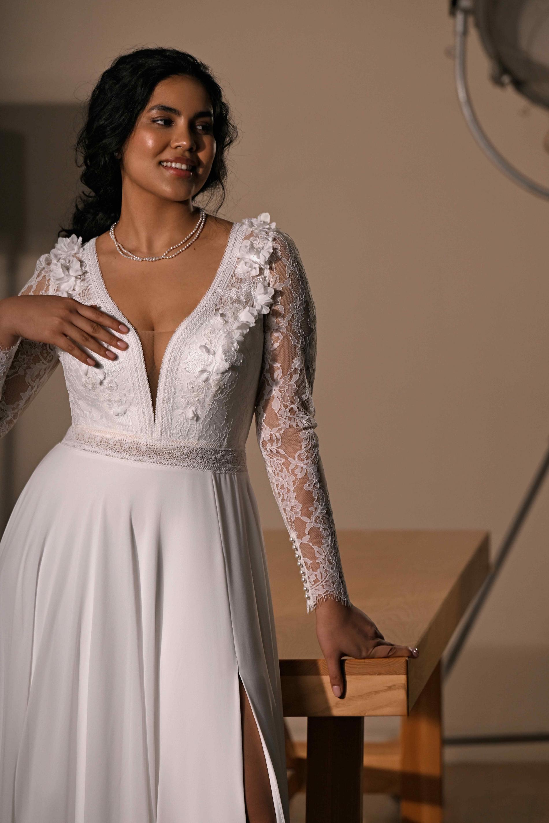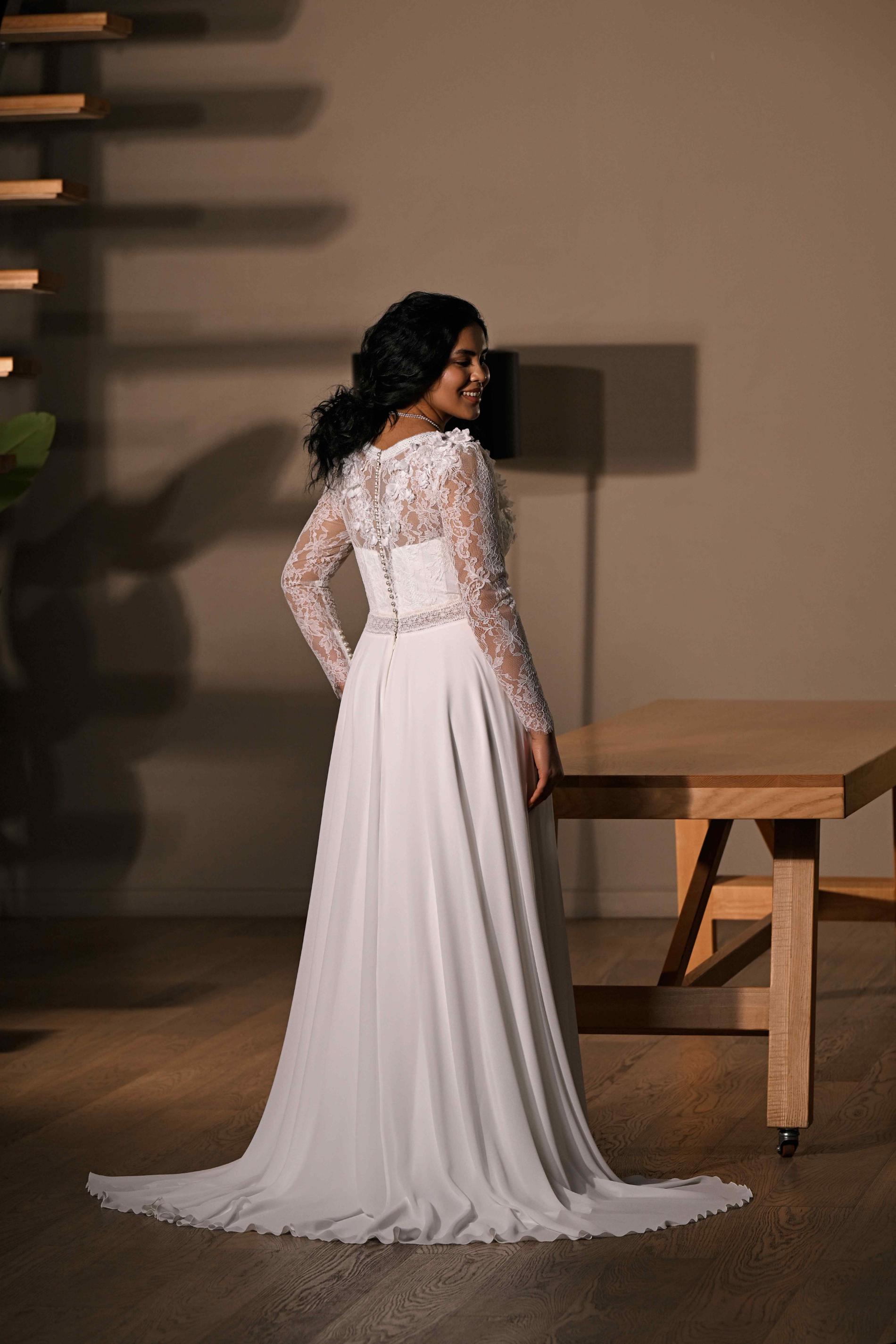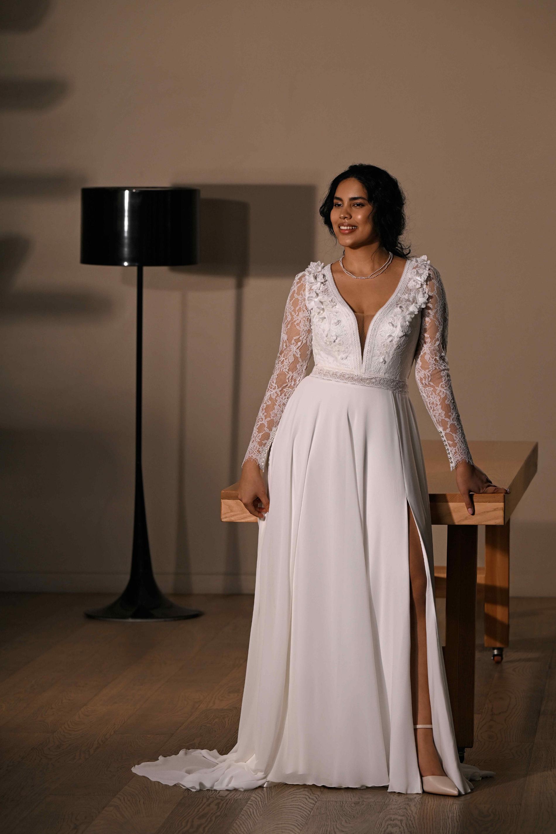 Свадебное платье с пышной летящей юбкой и высоким разрезом, который придает образу современный акцент. Лиф украшен фактурным кружевом и декоративными объемными цветами, гармонично переходящими на прозрачные длинные рукава. Талия подчеркнута кружевным поясом, V-образный вырез добавляет женственности и выразительности, делая наряд воздушным и эффектным.
