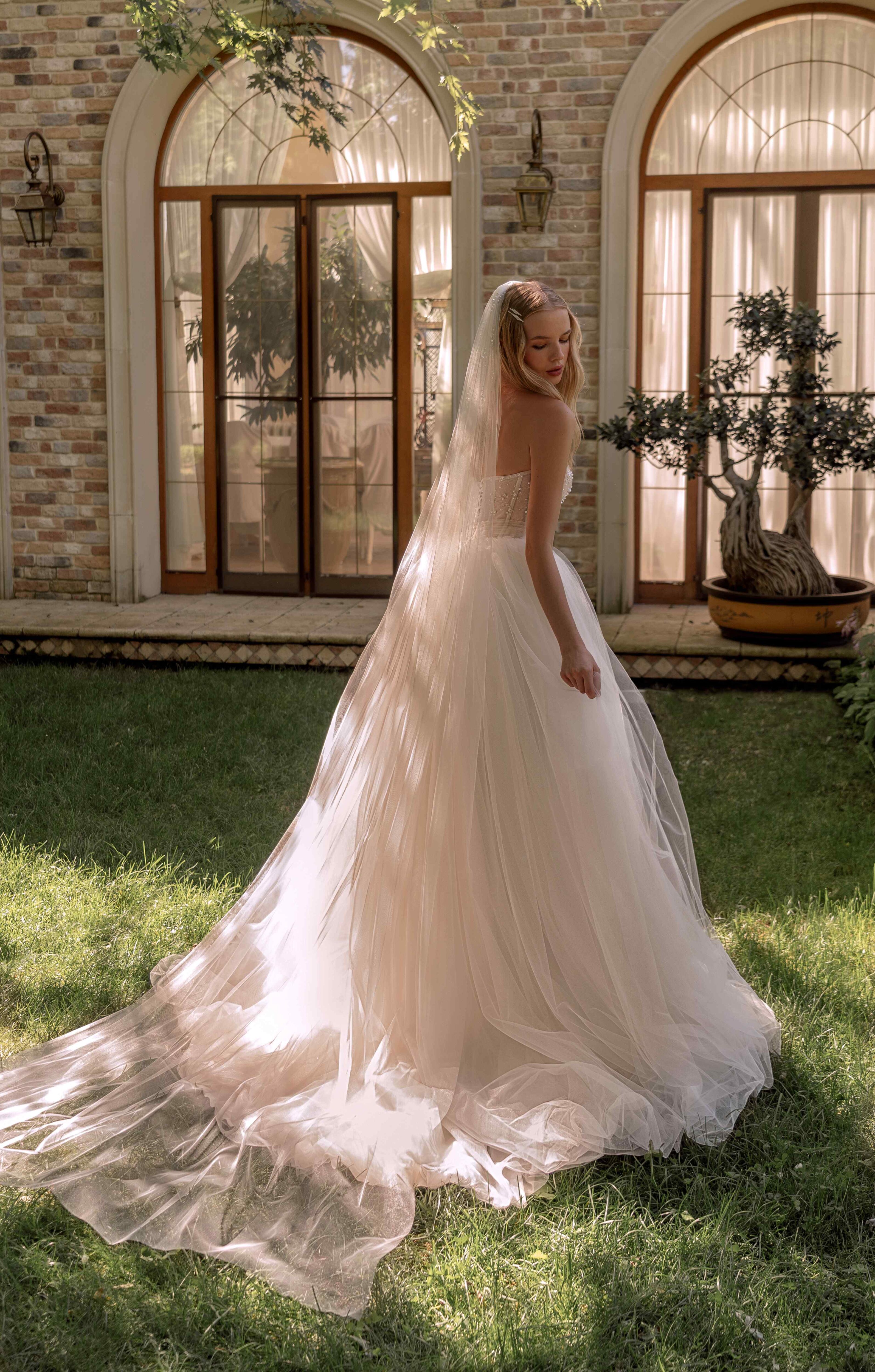 Свадебное платье — романтичное и воздушное: корсетный лиф с глубоким V-образным вырезом украшен прозрачными вставками и небольшими жемчужинами. Пышная многослойная юбка выполнена из легкого фатина, идеально сочетается с классической фатиновой фатой.