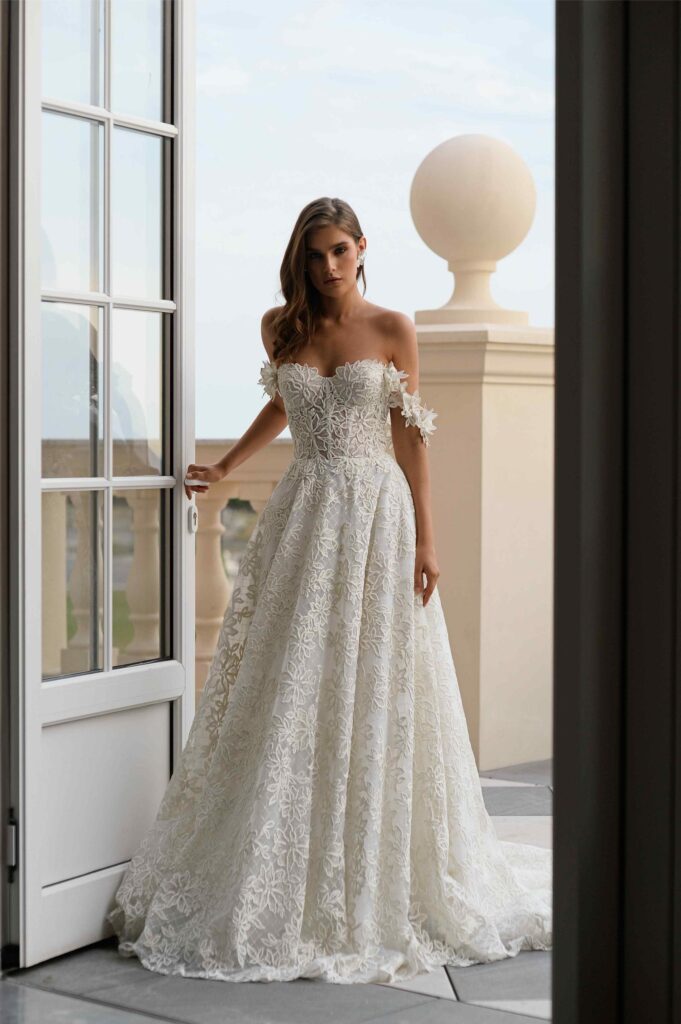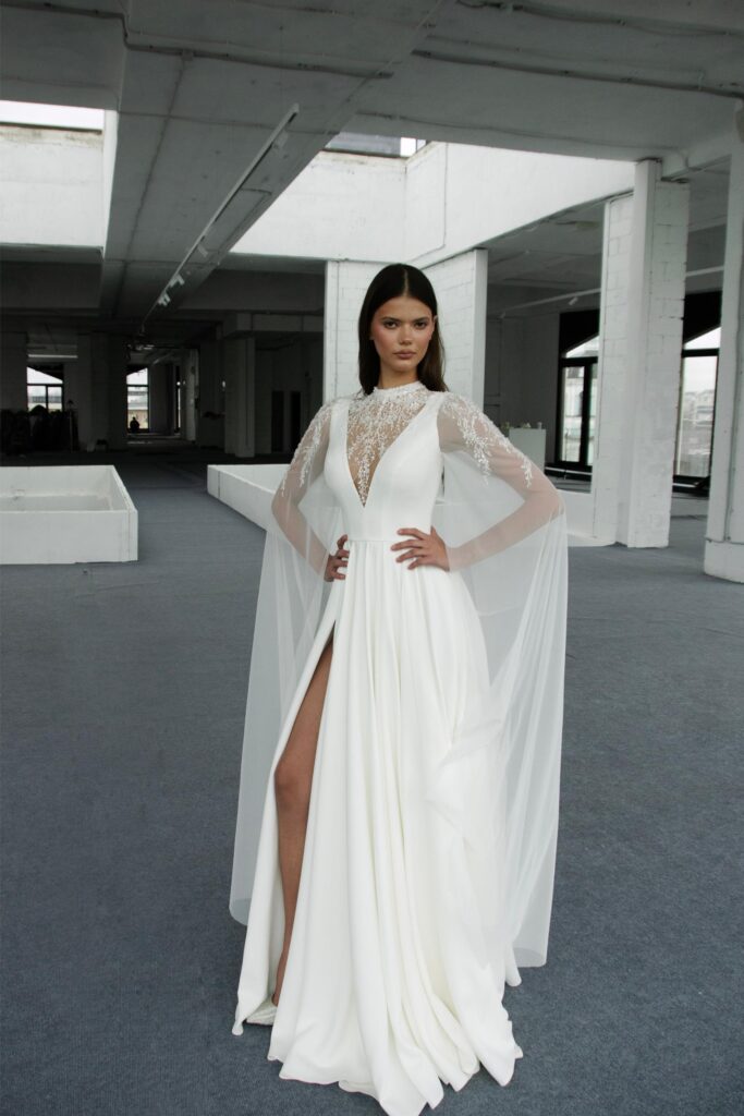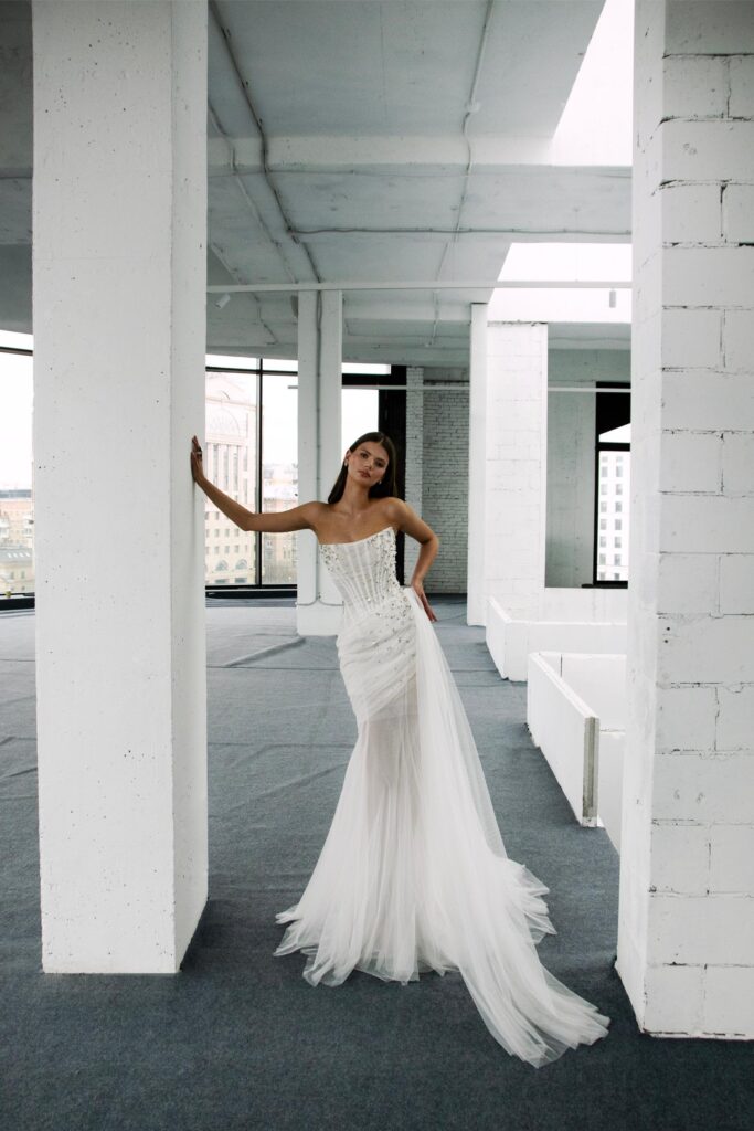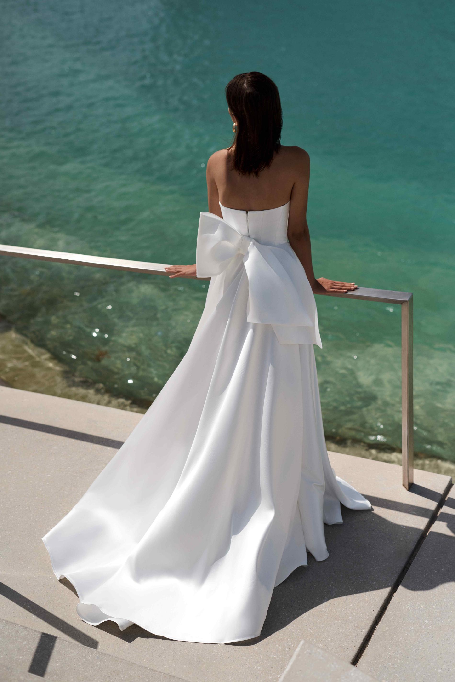 Свадебное платье-бандо с открытыми плечами, украшено крупным архитектурным бантом на талии и пышной асимметричной юбкой с разрезом.