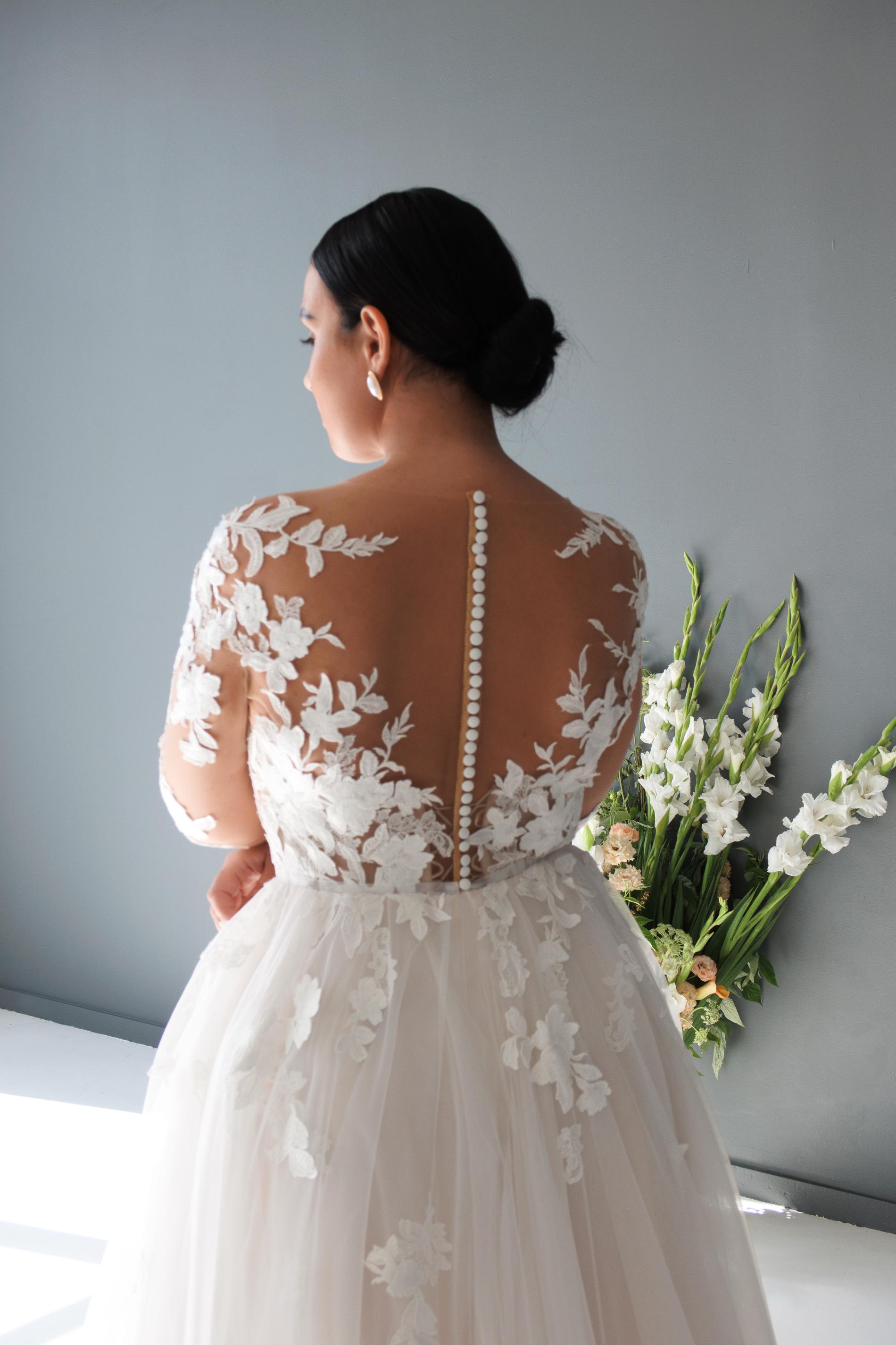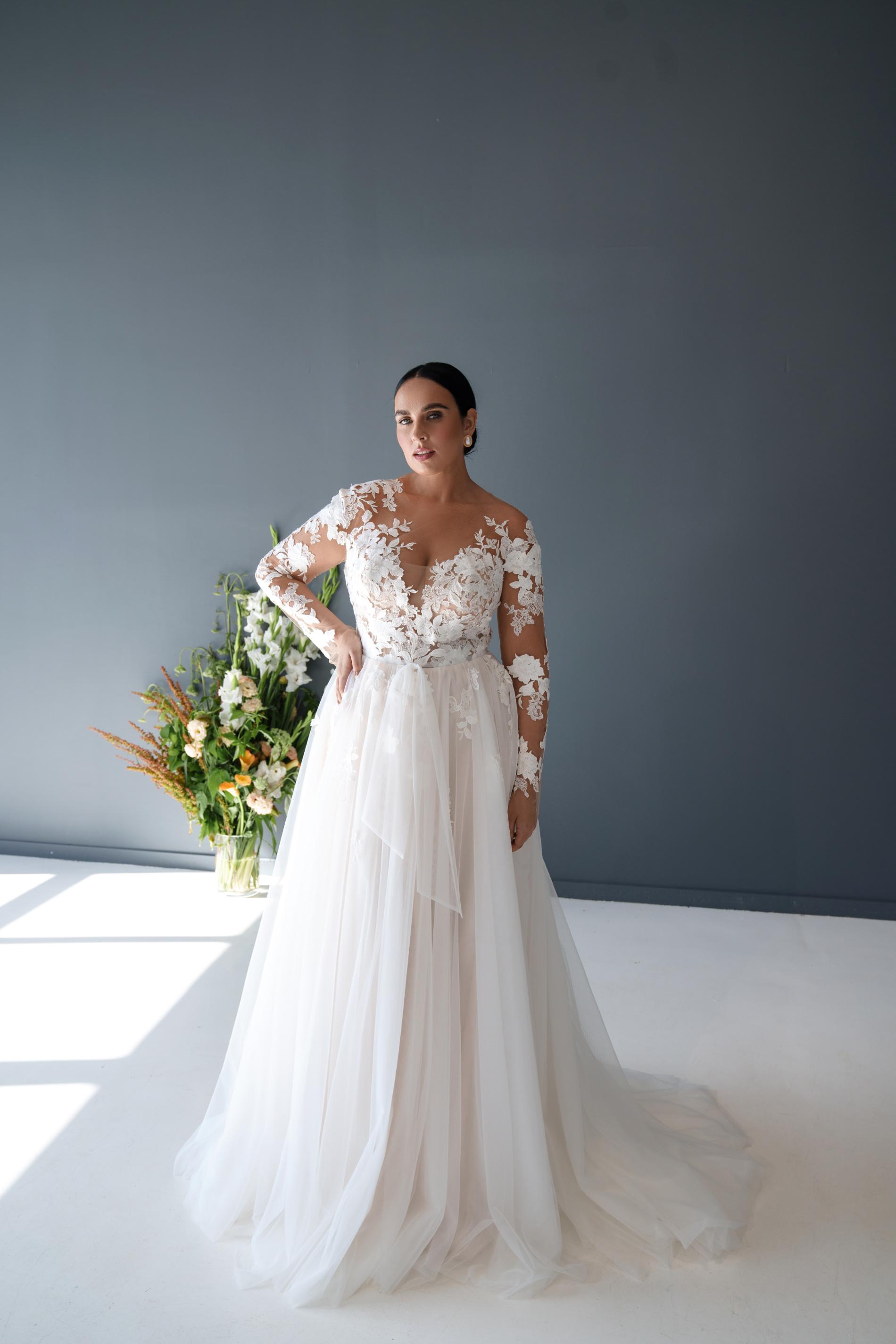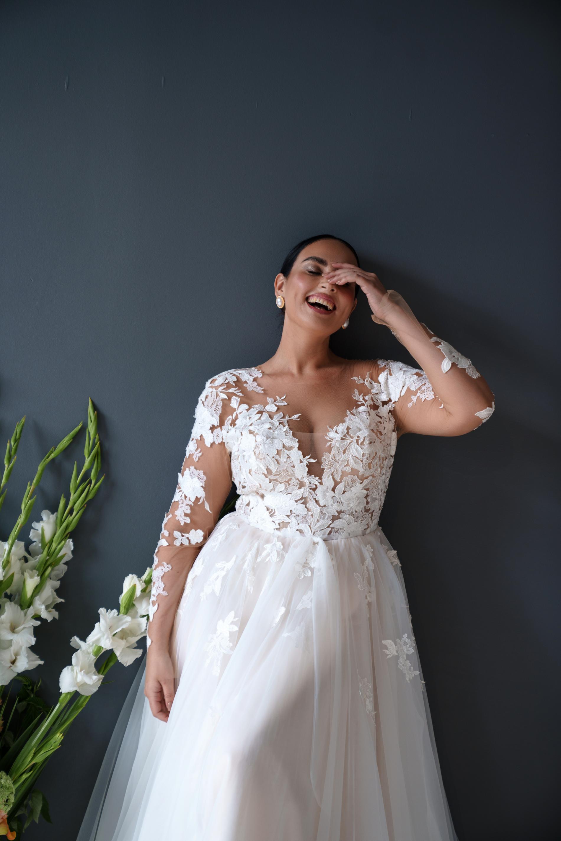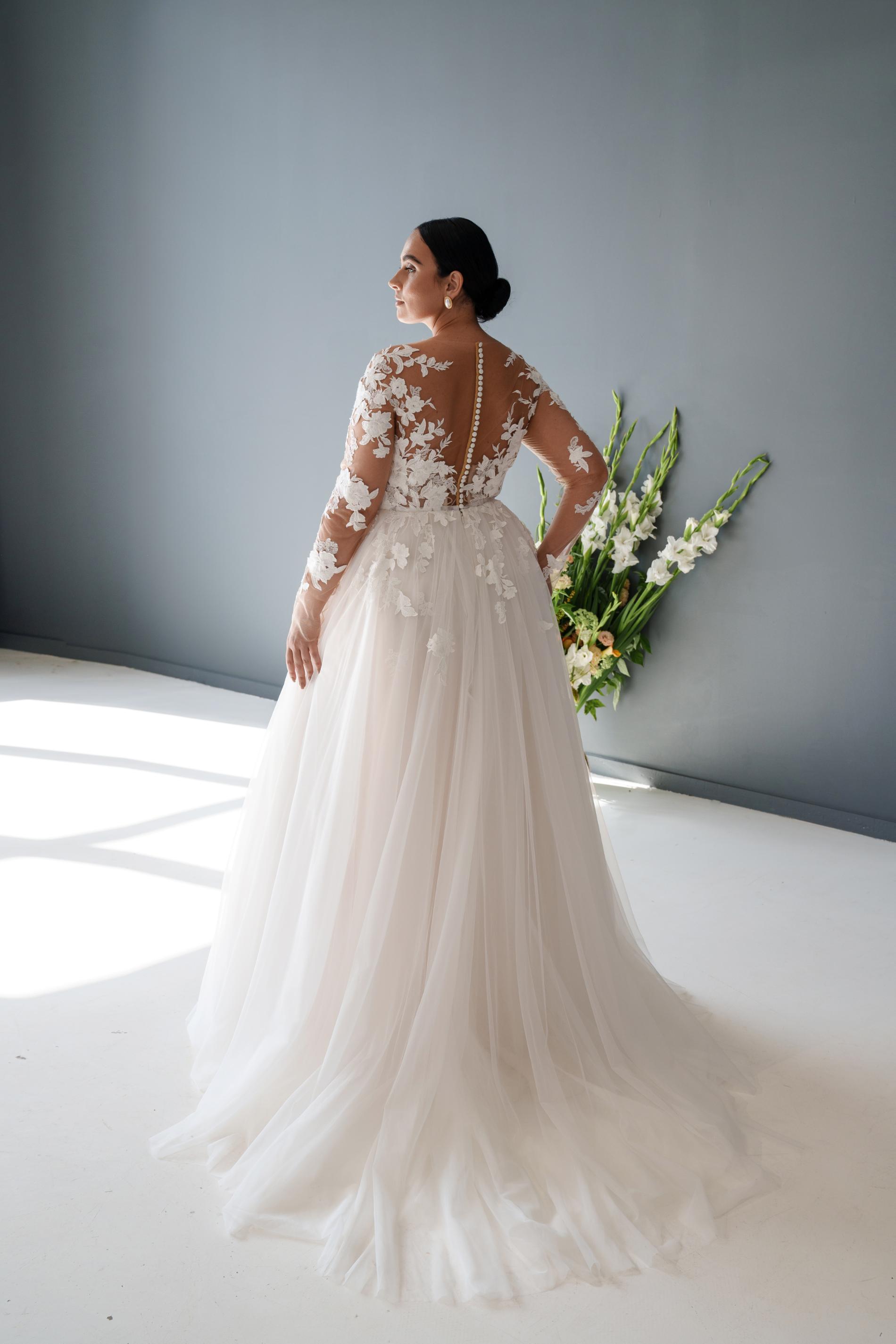 Свадебное платье выполнено из прозрачной ткани с вышивкой в виде цветочных узоров, покрывающей лиф и рукава. Платье имеет длинные рукава и глубокое декольте с чашками, украшенными кружевом. Юбка пышная и многослойная, создающая воздушный и легкий силуэт. Образ сочетает в себе нежность и изысканность благодаря прозрачности и детальной вышивке.