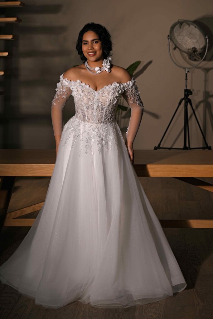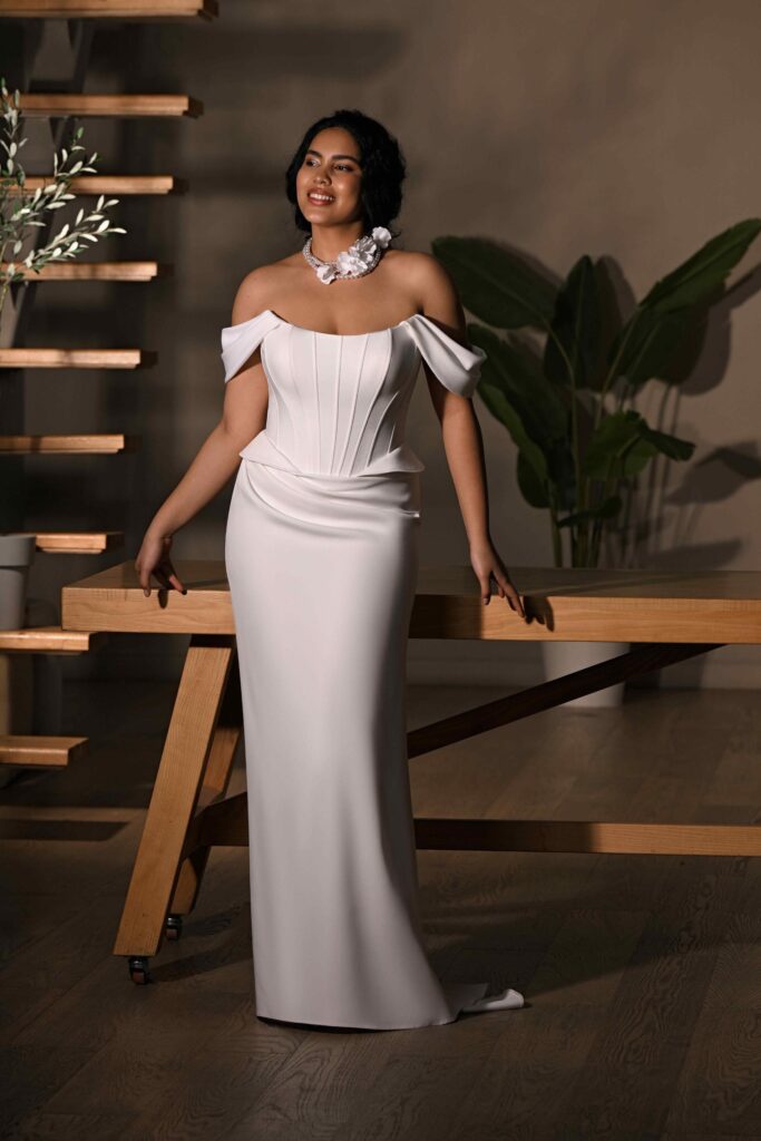 Свадебное мини-платье с корсетным верхом-бюстье. Поверхность наряда богато расшита кружевом, цветочными аппликациями и бисером. Дополняют образ объемные длинные съемные рукава-фата из тюля, которые можно приспустить на плечи или оставить ниспадающими.
