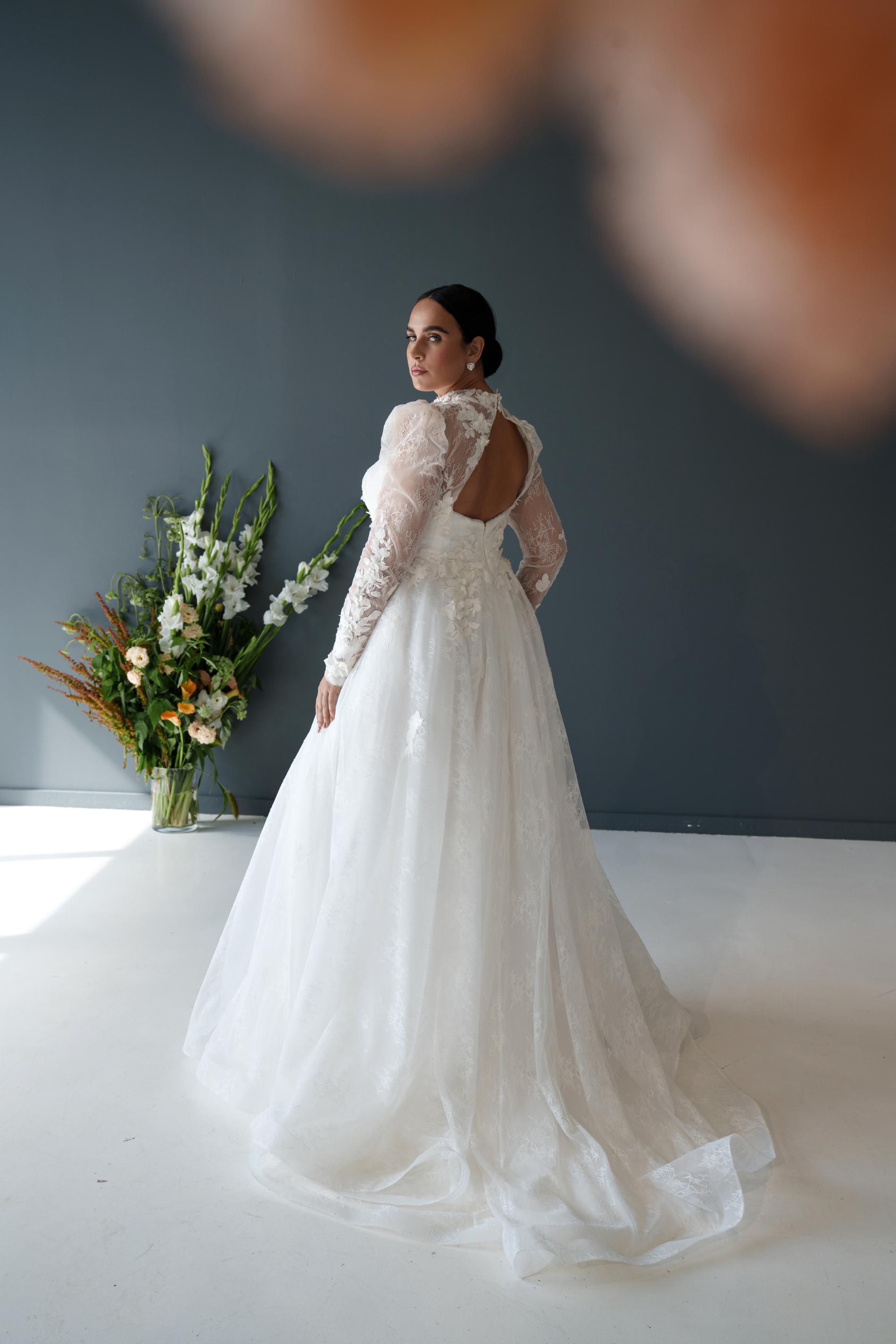 Свадебное платье выполнено из прозрачного кружева с длинными рукавами, украшенными цветочными аппликациями. Корсет платья с выраженным сердцевидным вырезом под слоем кружева подчеркивает талию и грудь. Юбка объемная, многослойная, с легкой драпировкой и кружевными элементами. Высокий воротник и пышные рукава добавляют образу утончённости и классической элегантности.