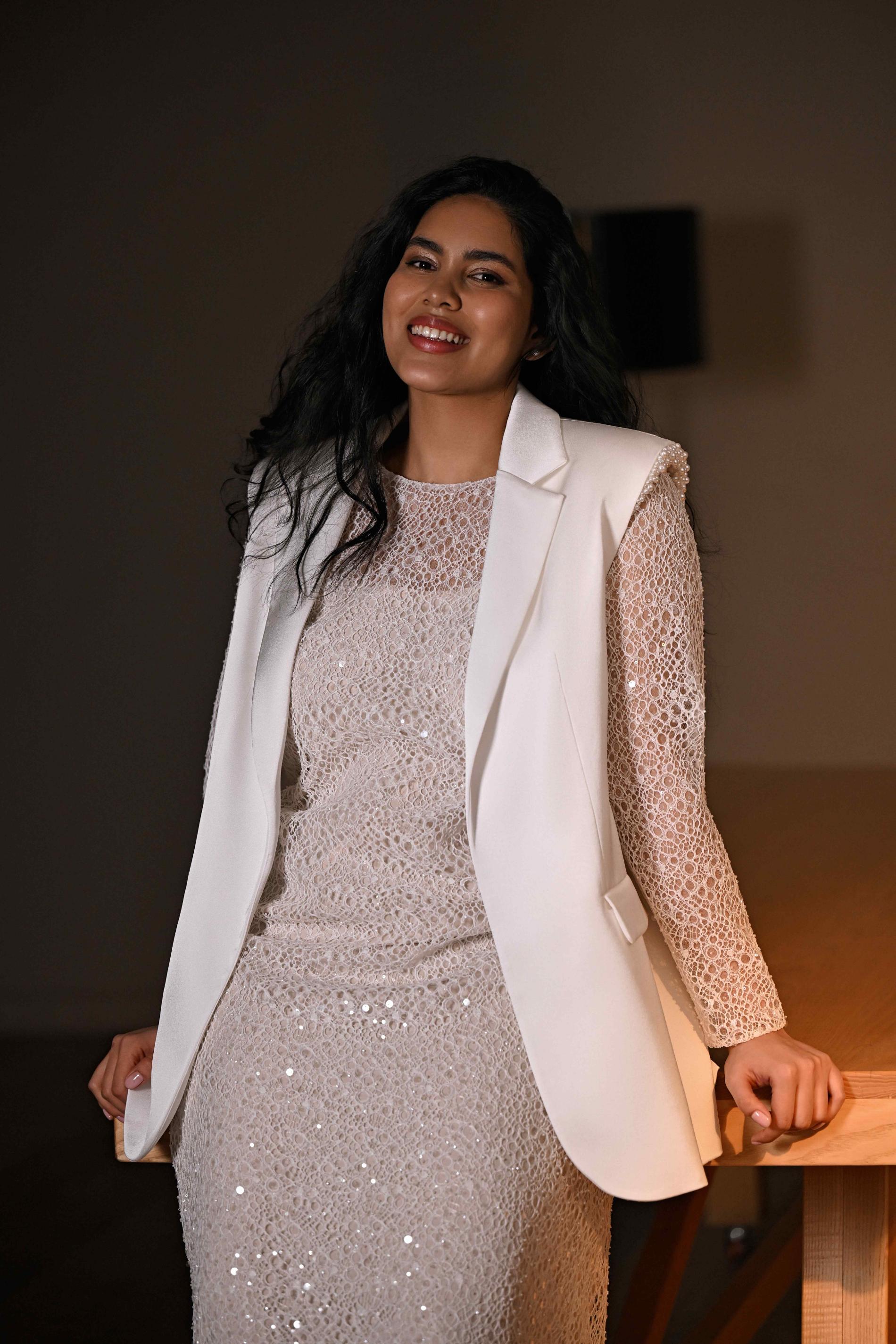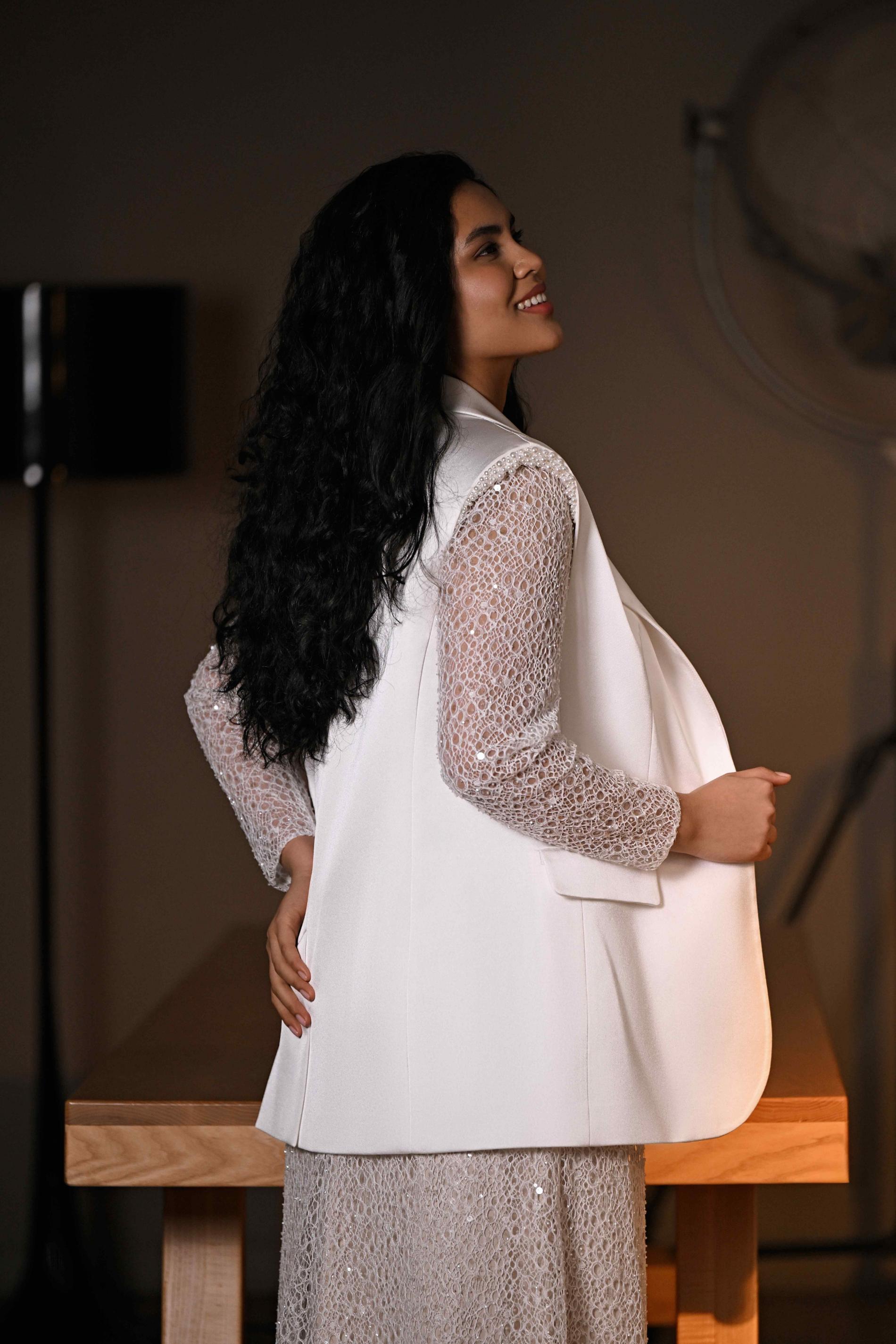 Свадебное платье прямого силуэта выполнено из светлой фактурной ткани, украшенной деликатными пайетками — они придают наряду утончённое мерцание. Длинные прозрачные рукава и закрытый круглый вырез подчеркивают элегантность и простоту. Образ эффектно дополнен удлинённым белым жакетом свободного кроя: он носится поверх платья, добавляя нотку деловой элегантности и свежий городской стиль