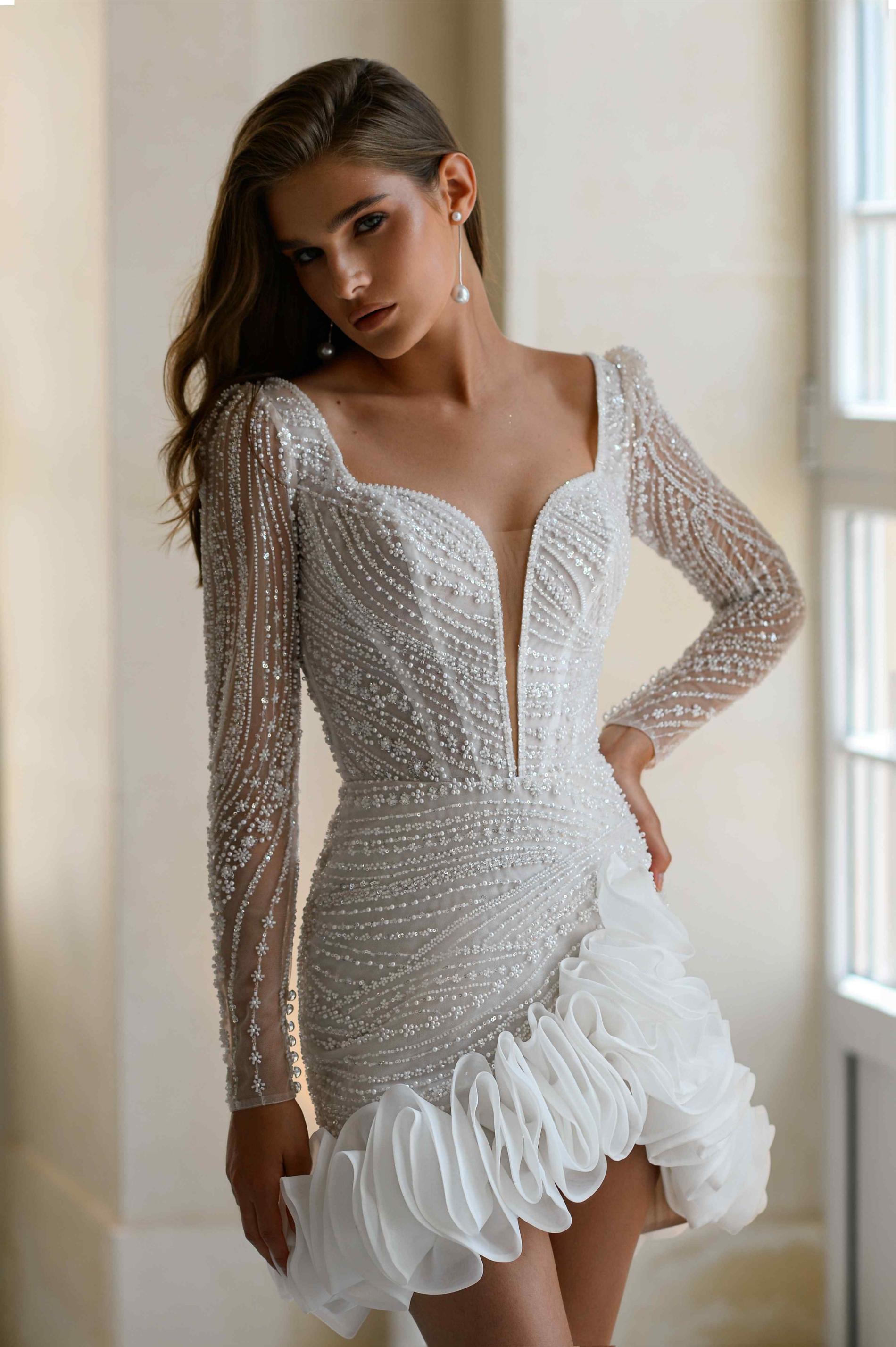 Свадебное мини-платье прилегающего кроя, полностью расшитое жемчугом и бисером. Лиф с глубоким V-образным вырезом, длинные прозрачные рукава украшены геометрическим узором из мелких бусин. Юбка драпирована, а по краю идет эффектная объемная рюша.