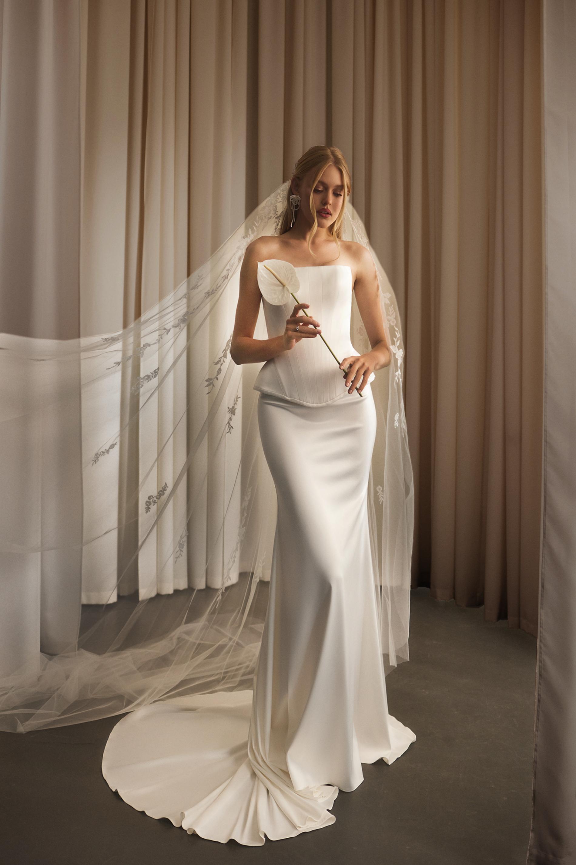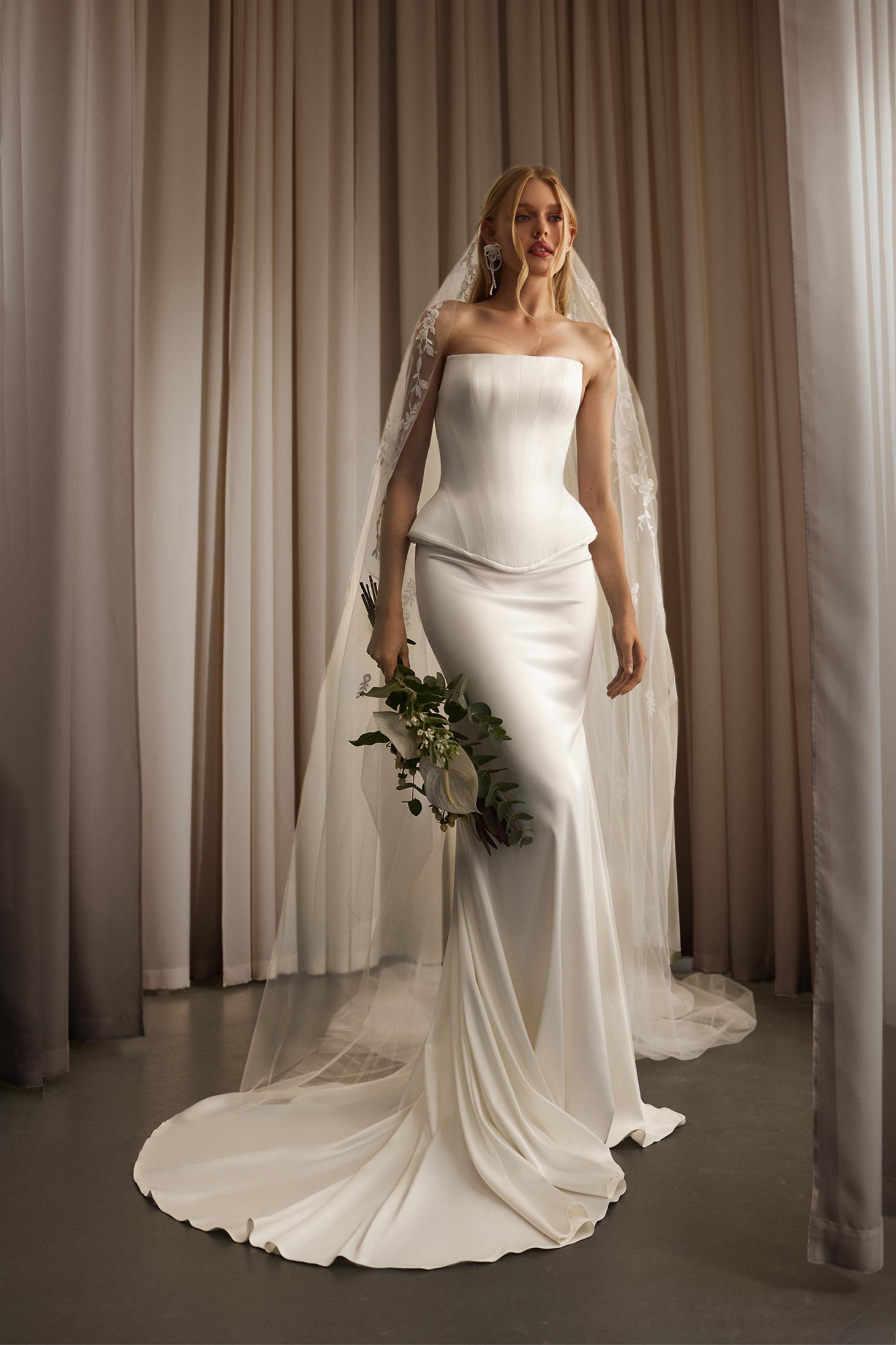 Свадебное платье выполнено из гладкой, струящейся белой ткани с сатиновым блеском. Верх платья — корсет без бретелей, выделяющий талию и выполненный с лёгким фигурным расширением по линии бедер. Юбка прямая, удлиненная, с аккуратным шлейфом, который элегантно ложится по полу. Минималистичный дизайн и чёткий силуэт придают наряду современный и элегантный вид.