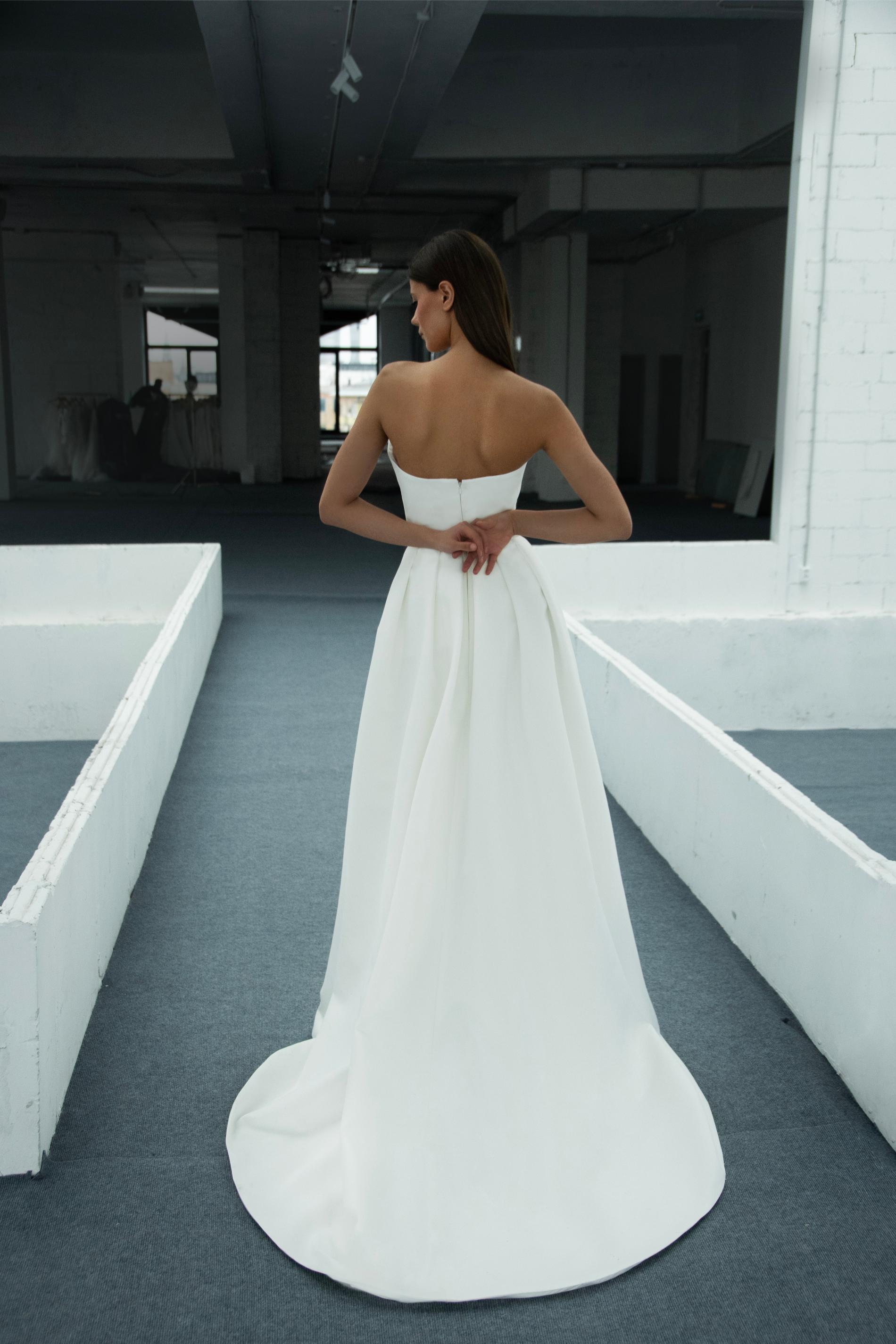 Свадебное платье выполнено в современном стиле с асимметричным драпированным лифом на одном плече. Верх плотно прилегает к фигуре и подчеркивает талию, изящно переходя в объемную юбку. Центральная часть юбки украшена широкой вставкой из кружевного полотна с цветочным узором, создающей эффект многослойности и легкости. Такой фасон сочетает графичность белого материала и воздушность кружева, делая образ ультрасовременным и стильным.