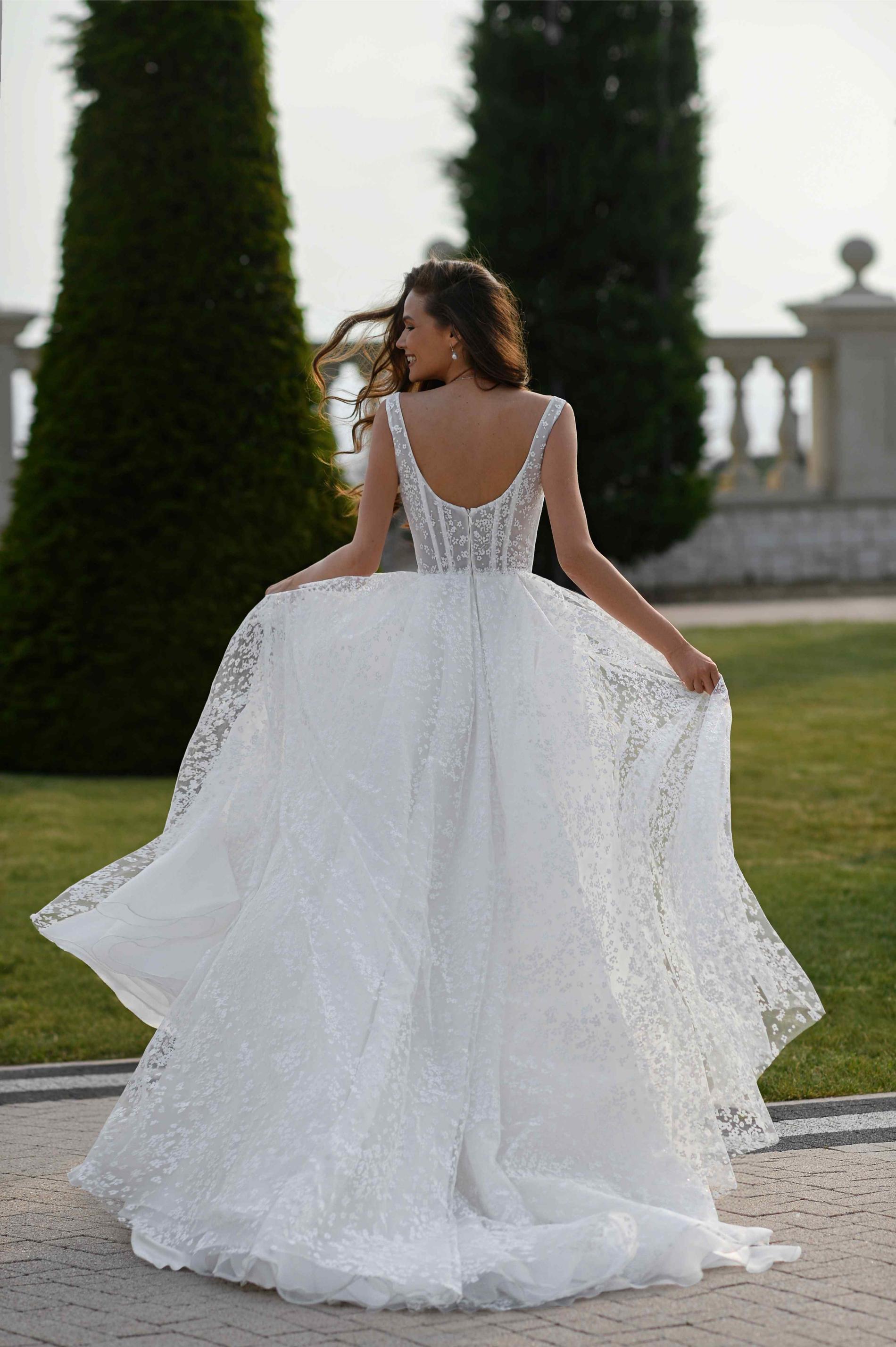 Свадебное платье пышное с широкими плечами и корсетным верхом, украшенным вертикальной вышивкой и сияющими деталями. Главный акцент — объёмная юбка из нескольких слоёв тюля с нежным узором и высоким разрезом.