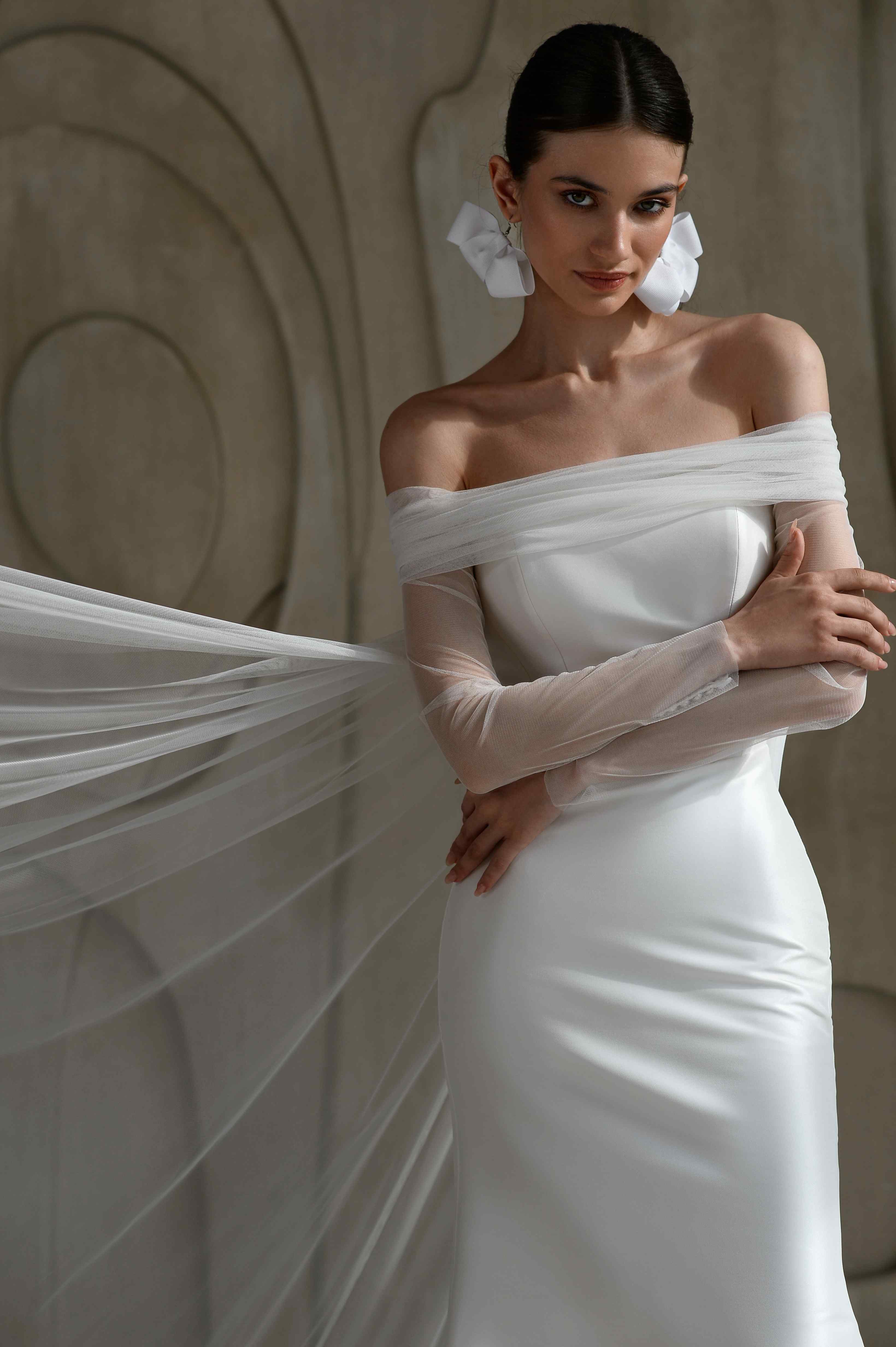 Свадебное платье-русалка оттенка слоновой кости из плотной атласной ткани. Плечи открыты благодаря широким драпированным складкам, образующим элегантную линию выреза. Сердцевидный корсет подчеркивает талию, а длинные прозрачные перчатки дополнены воздушной фатой, пристёгнутой к рукавам — создаётся выразительный и утончённый силуэт, элегантный и современный.