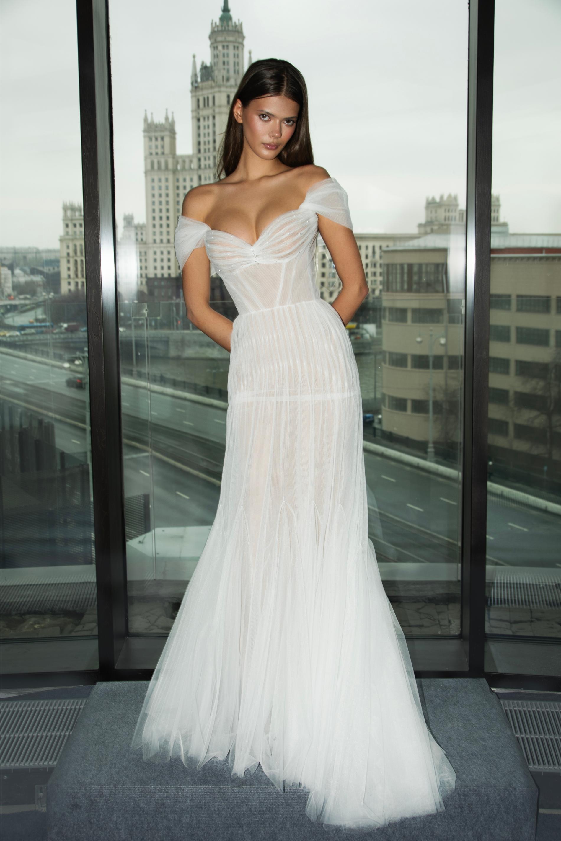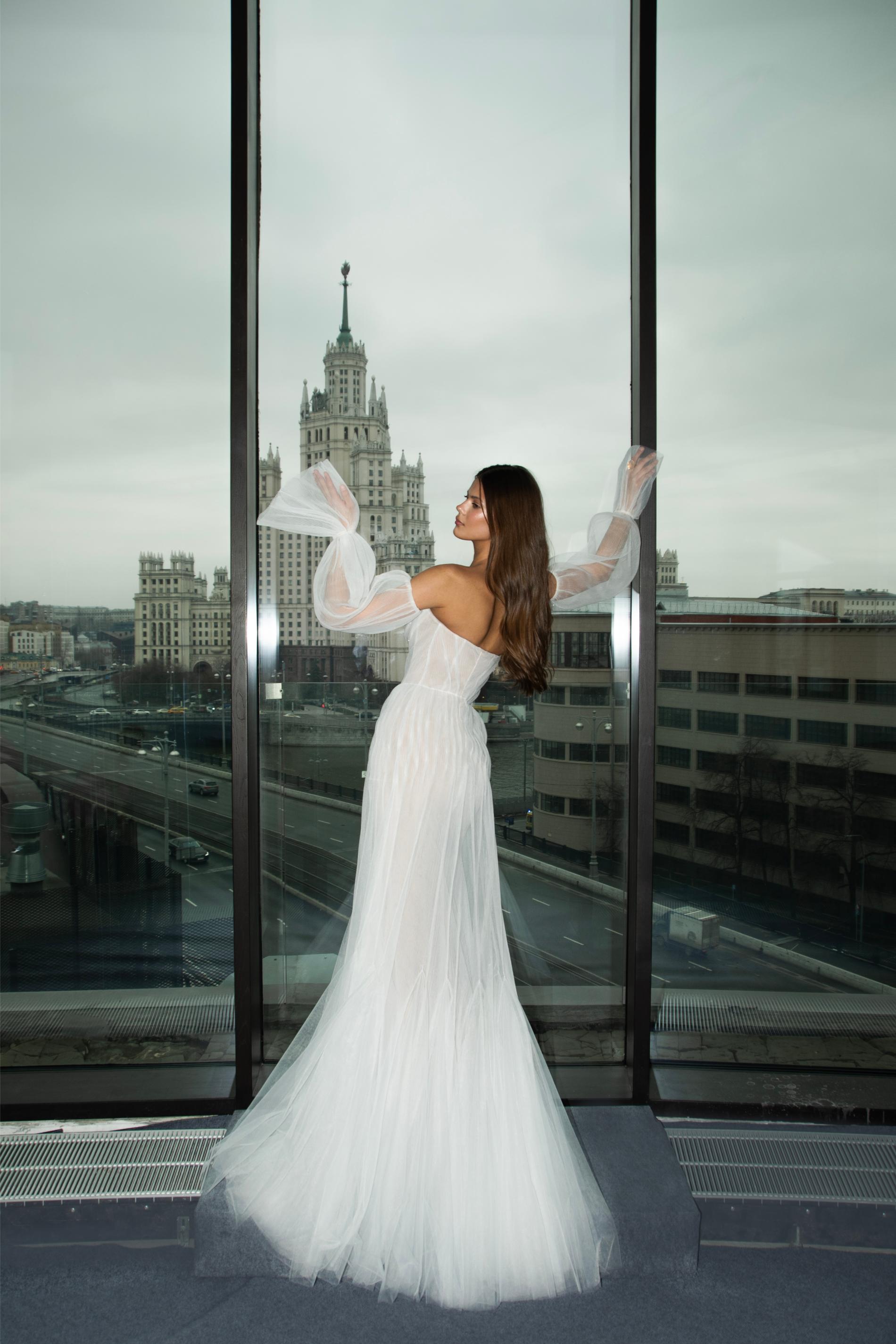 Свадебное платье выполнено из легкой полупрозрачной ткани с эффектом воздушного облака. Лиф на корсете с сердцевидным вырезом украшен мягкими вертикальными складками и декорирован драпировкой. Платье дополнено длинными прозрачными рукавами, спущенными с плеч и собранными на запястьях. Юбка прямая, с объемным шлейфом, элегантно ложится по полу и подчеркивает женственный силуэт.