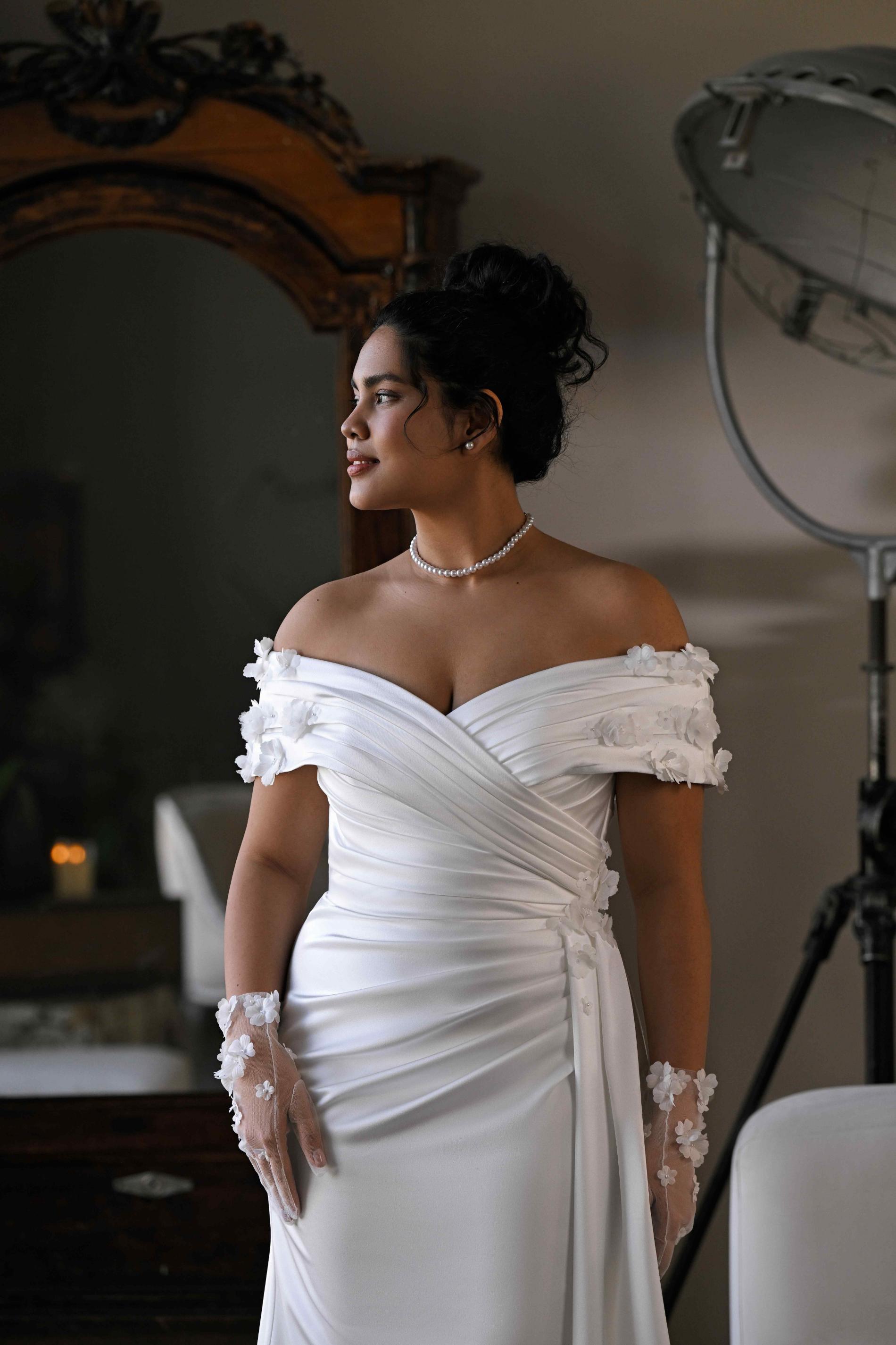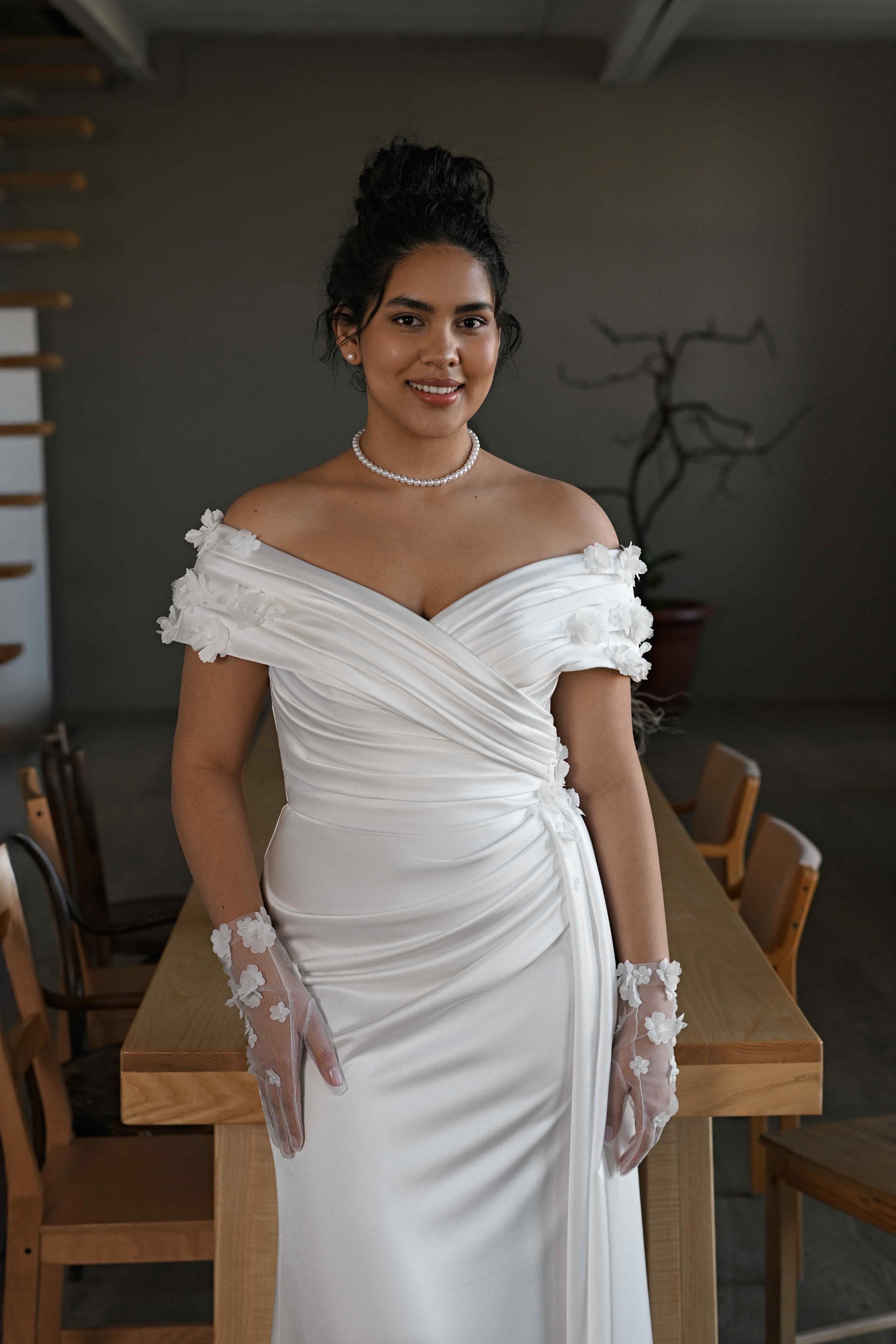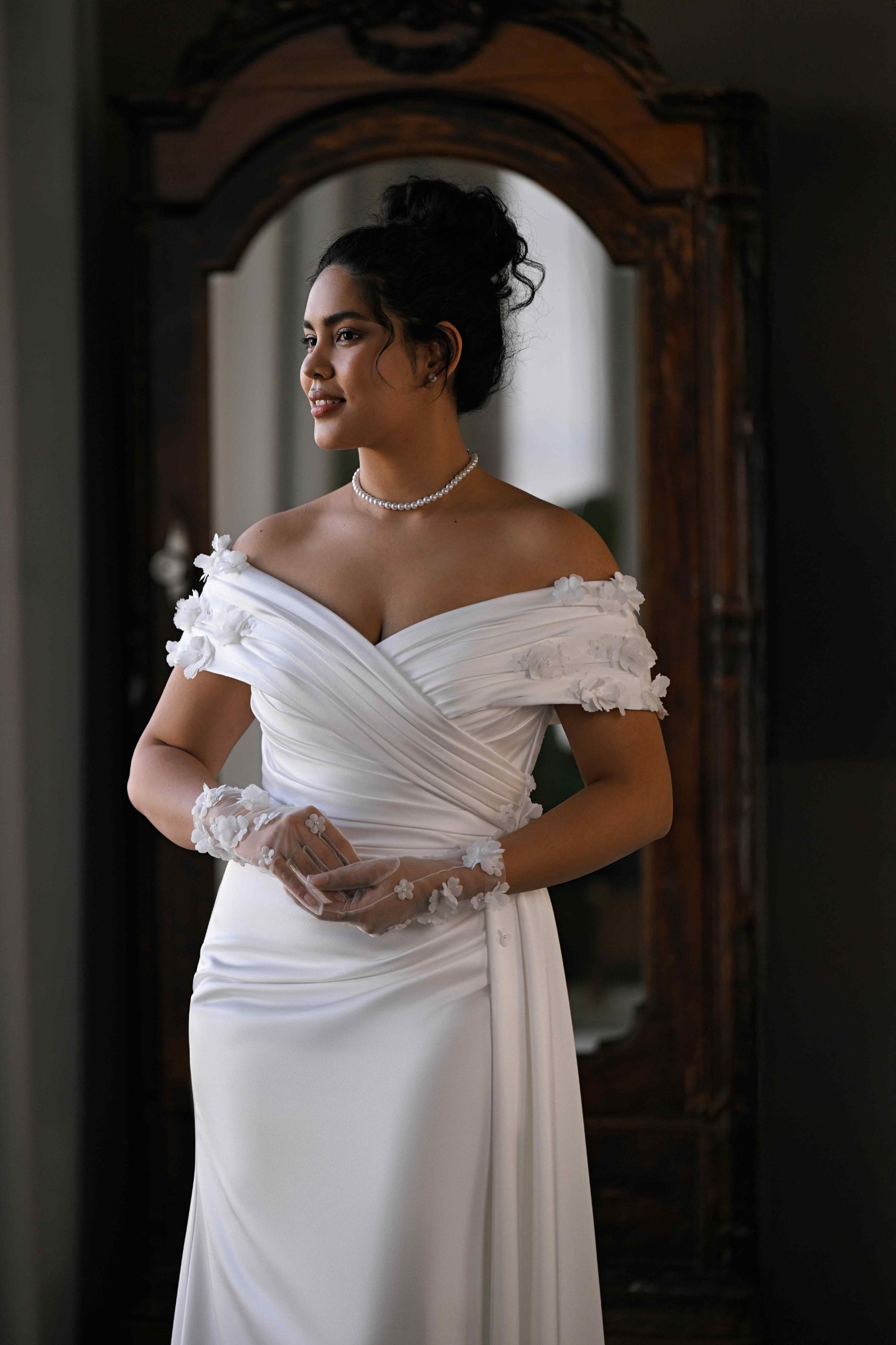 Свадебное платье приталенного силуэта с открытыми плечами, украшенными объемными тканевыми цветами. Лиф выполнен с драпировкой, красиво подчеркивает форму груди и талию. Юбка мягко драпируется по фигуре, а акцентные ажурные перчатки с цветочной аппликацией добавляют нотку винтажной романтики.