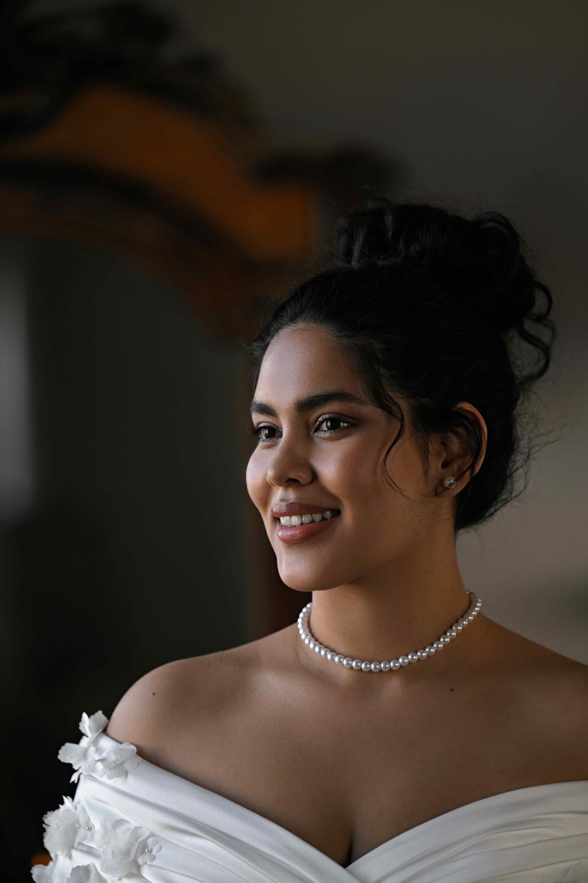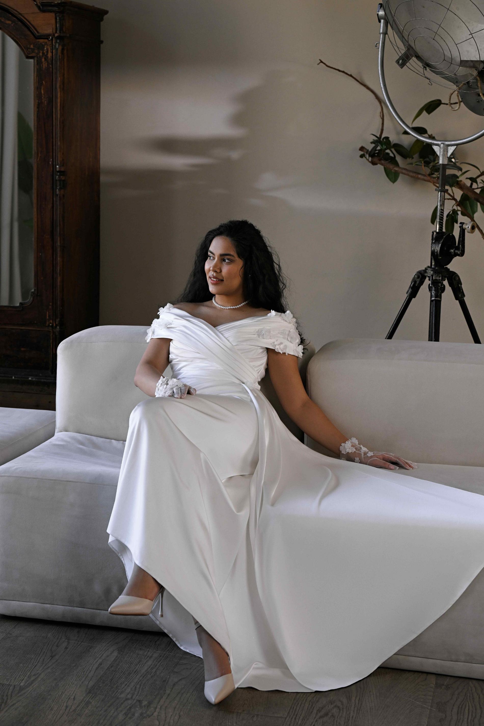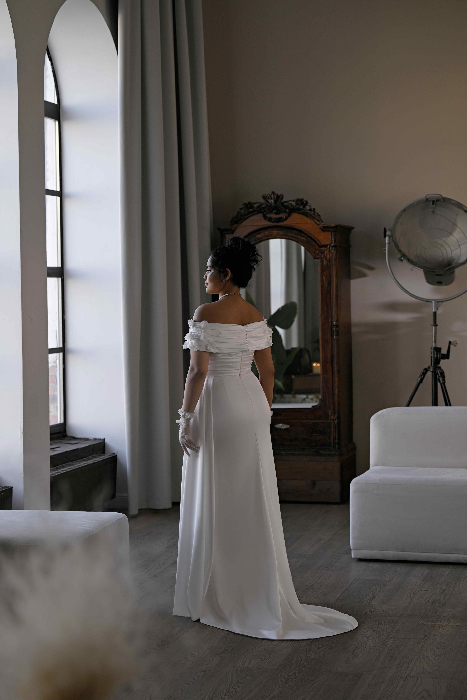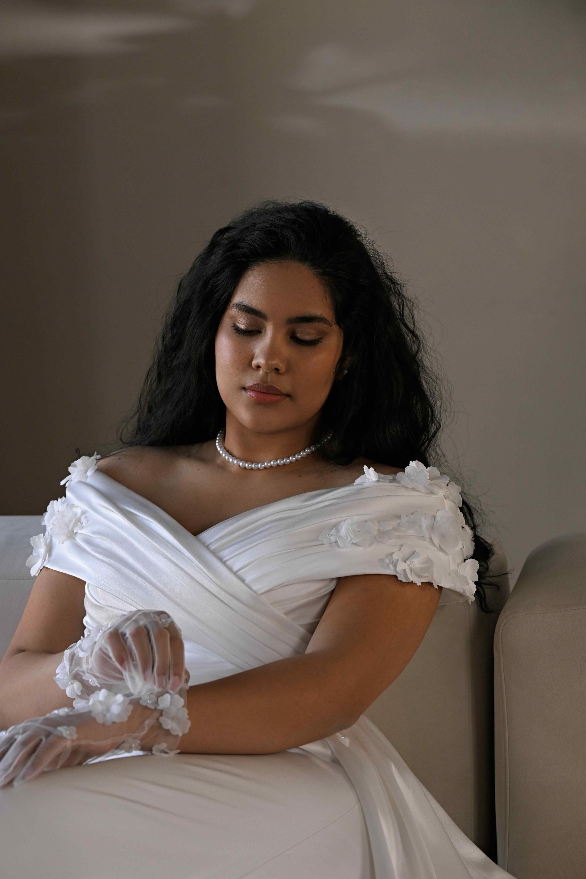 Свадебное платье приталенного силуэта с открытыми плечами, украшенными объемными тканевыми цветами. Лиф выполнен с драпировкой, красиво подчеркивает форму груди и талию. Юбка мягко драпируется по фигуре, а акцентные ажурные перчатки с цветочной аппликацией добавляют нотку винтажной романтики.