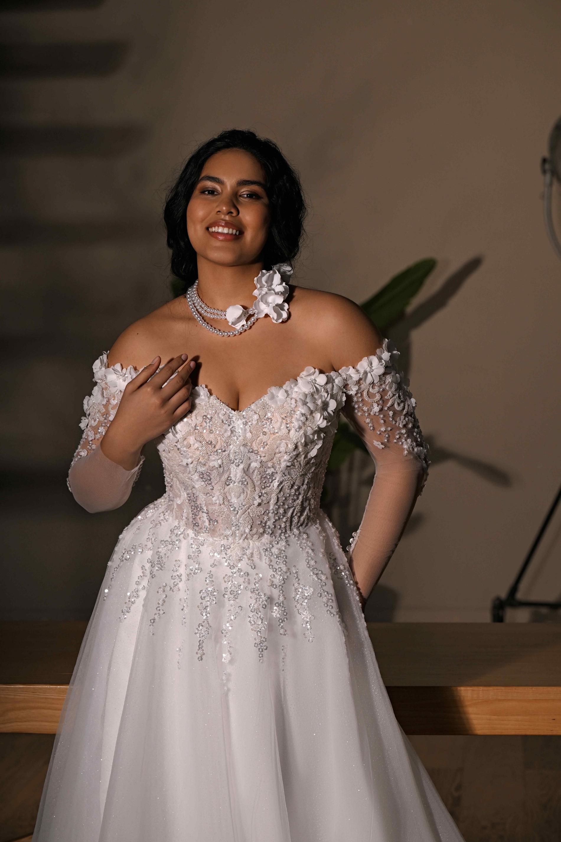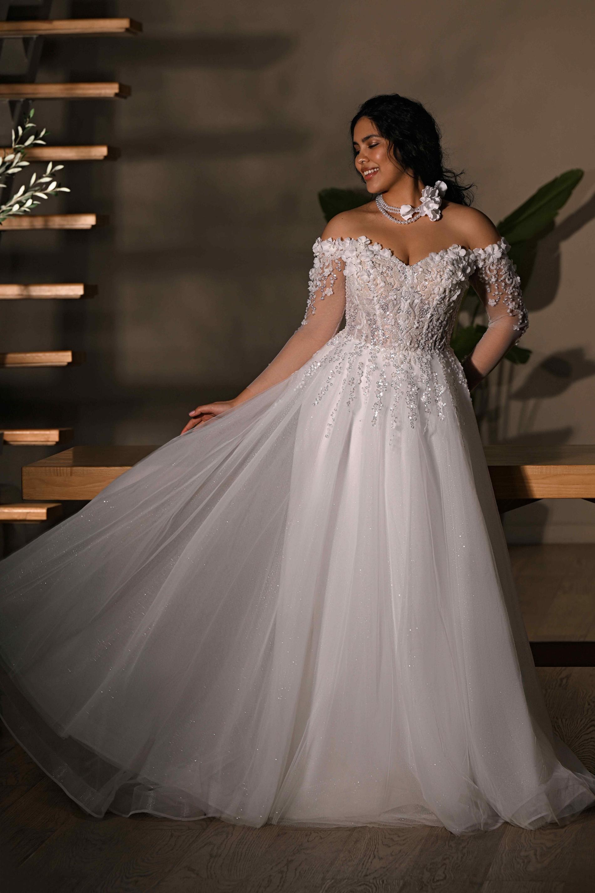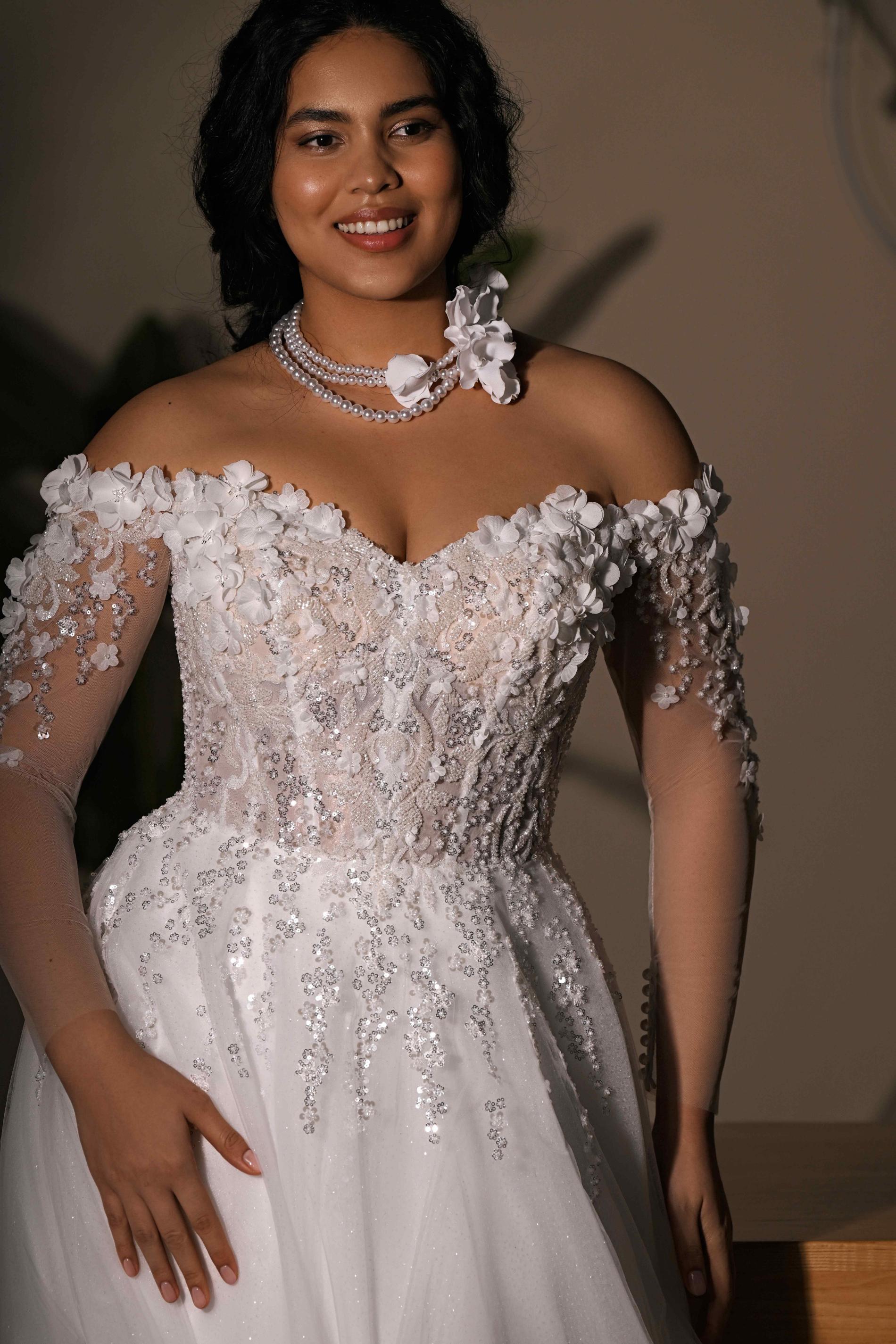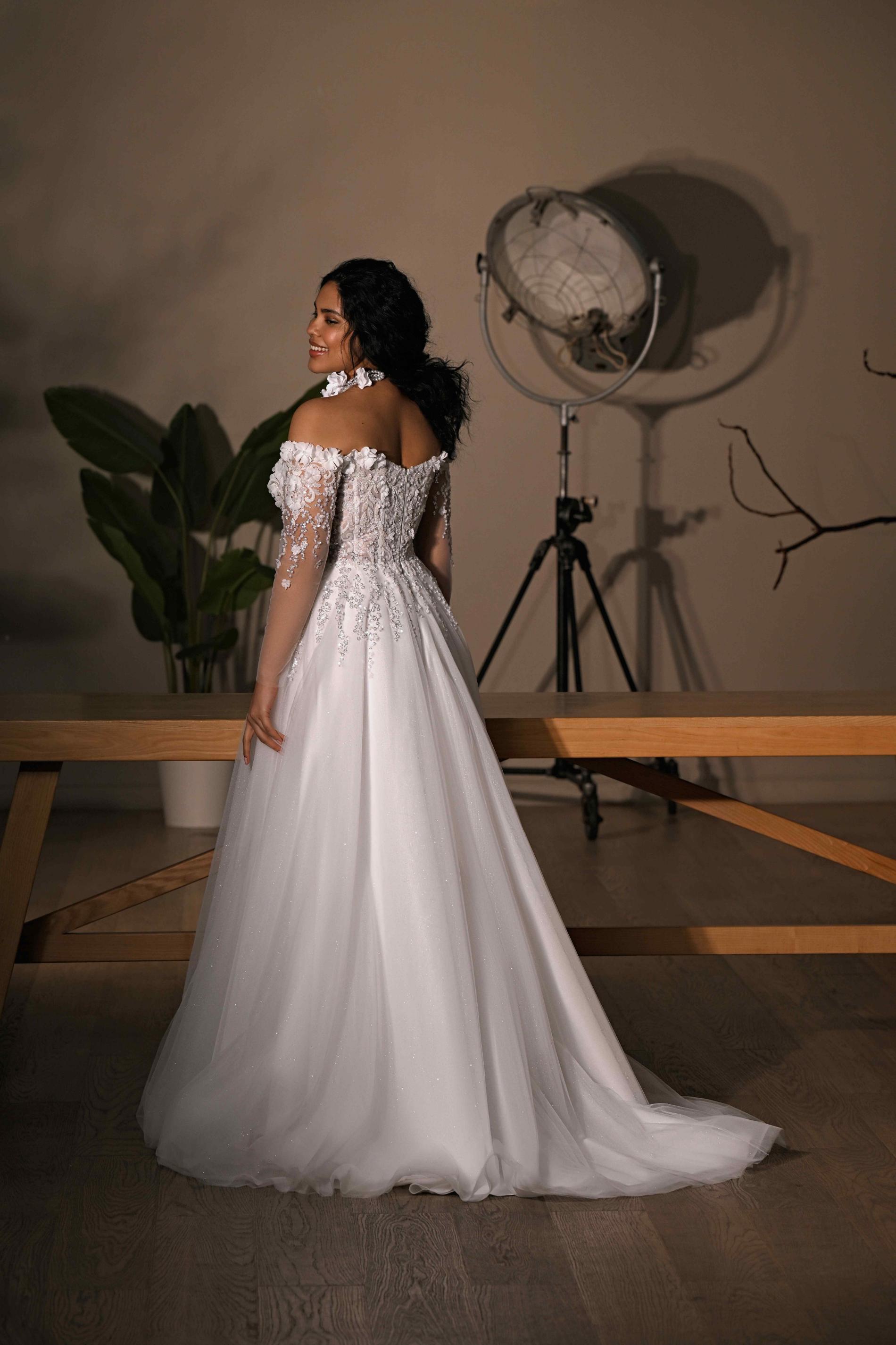 Свадебное платье А-силуэта с пышной юбкой, выполненное из легкой ткани и украшенное изысканной вышивкой и пайетками. Корсетный лиф оформлен в технике «голый эффект», украшен объемными 3D-цветами, которые акцентируют линию плеч и декольте. Длинные прозрачные рукава с пайетками дополняют основу, добавляя нежности и легкости образу. Детали из кружева и блеск делают наряд по-настоящему праздничным.