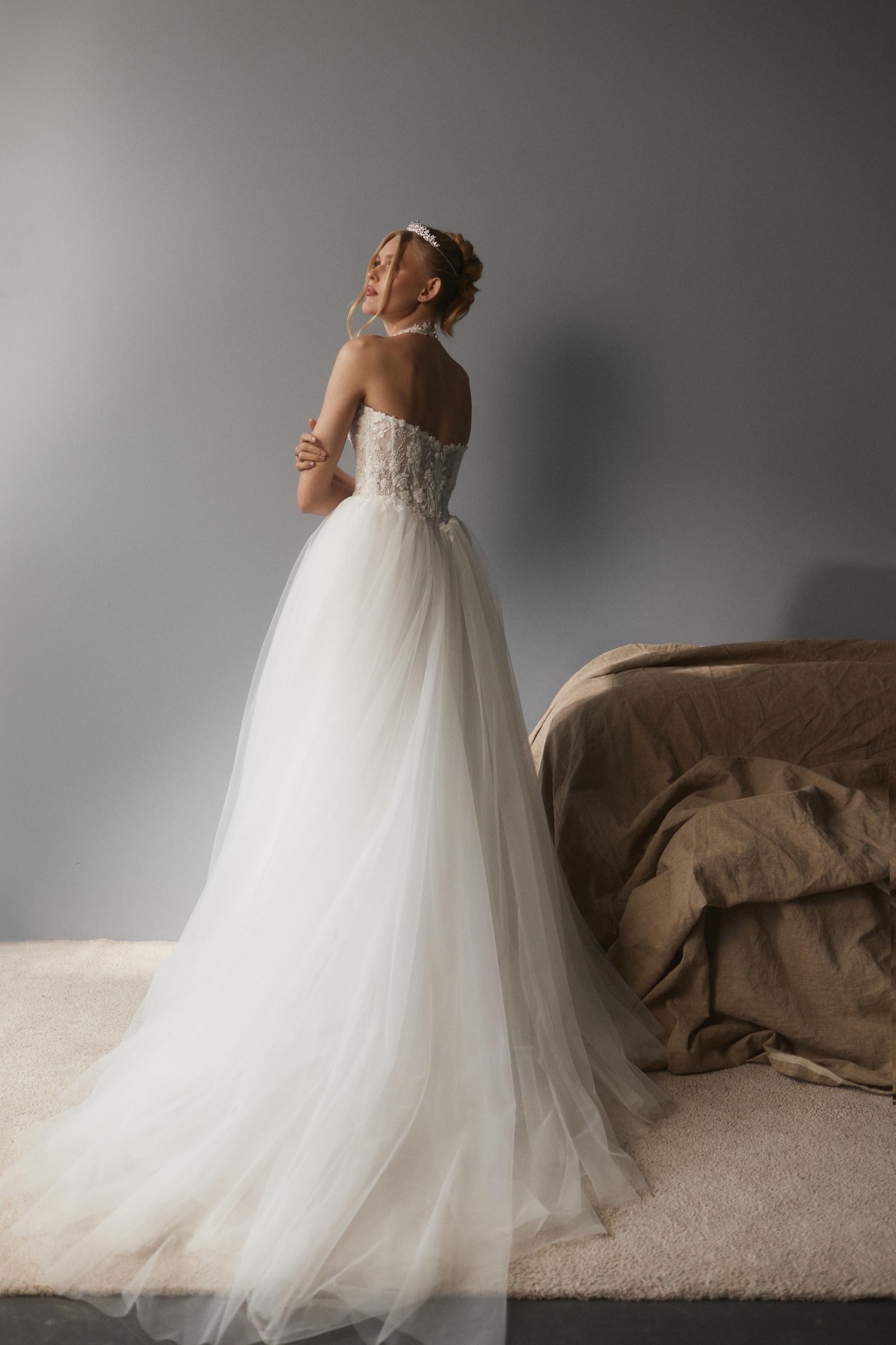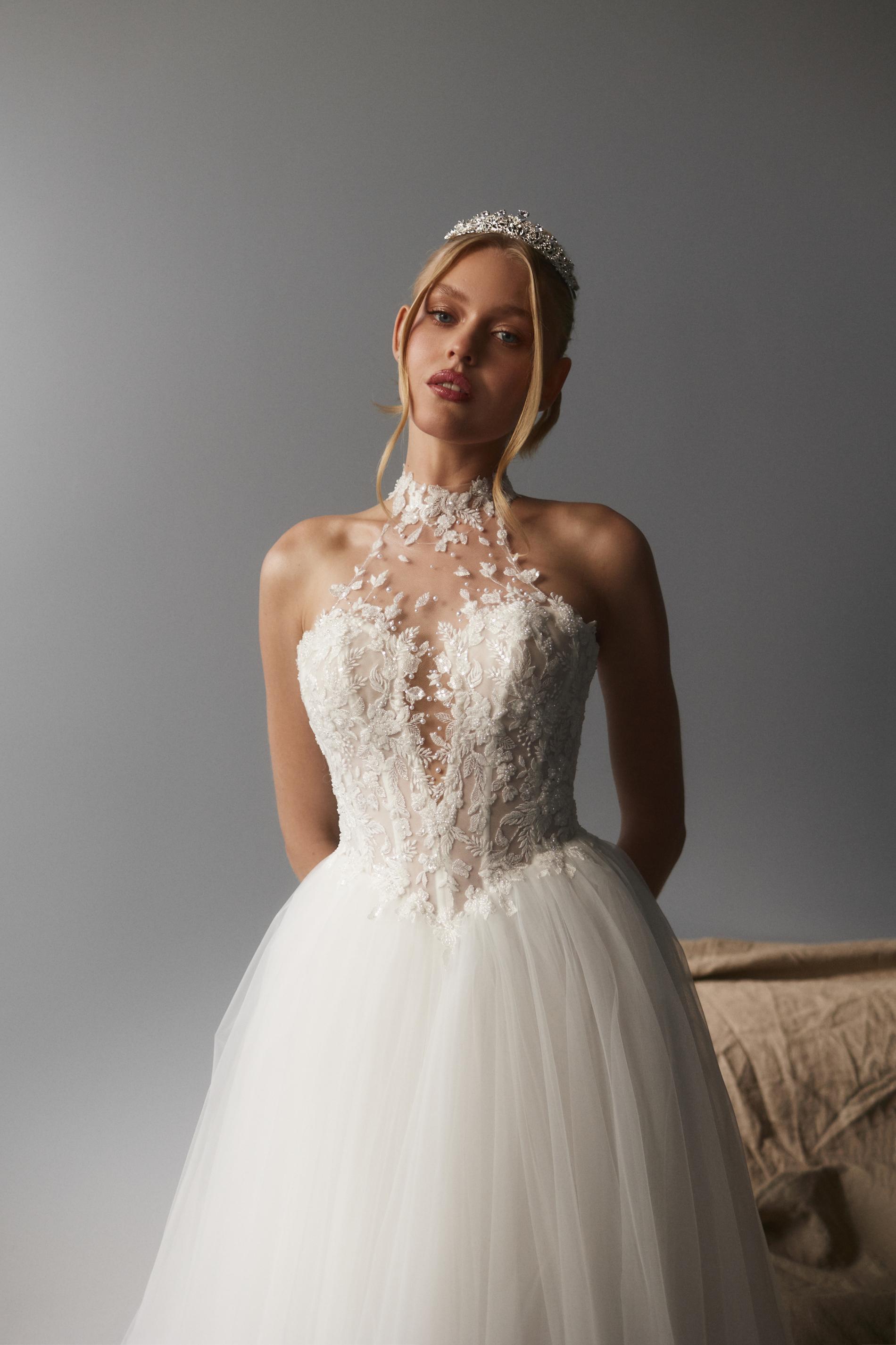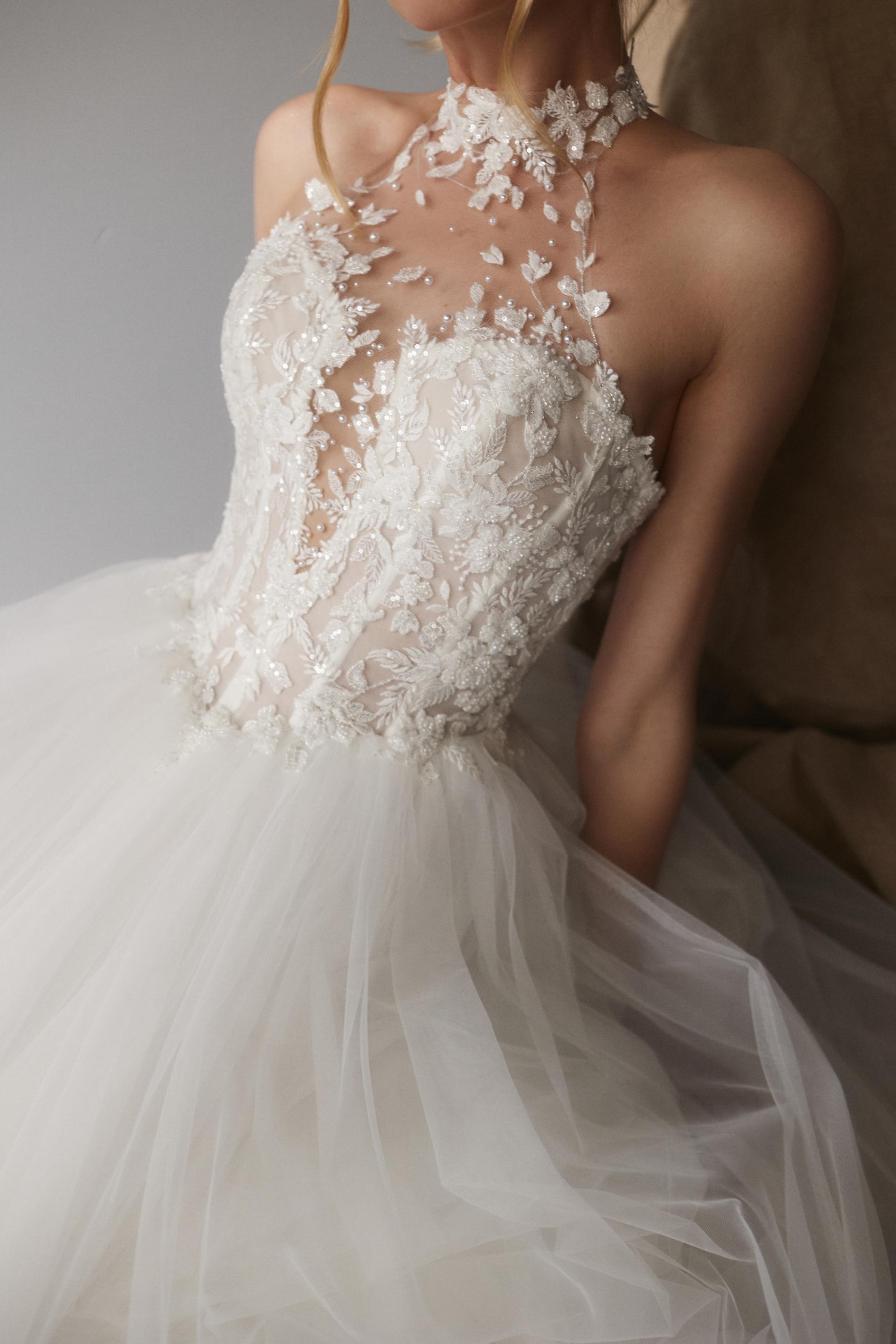 Свадебное платье выполнено из легкого полупрозрачного материала, расшито объемной флористической вышивкой белого цвета. Лиф оформлен высоким воротником на прозрачной сетке и глубоким фигурным вырезом, плавно переходящим к открытому лифу. Основу платья составляет корсет с эффектом невесомости, украшенный изящными узорами. Юбка длинная, пышная, многослойная и изготовлена из мягкого фатина, создающего воздушный силуэт.