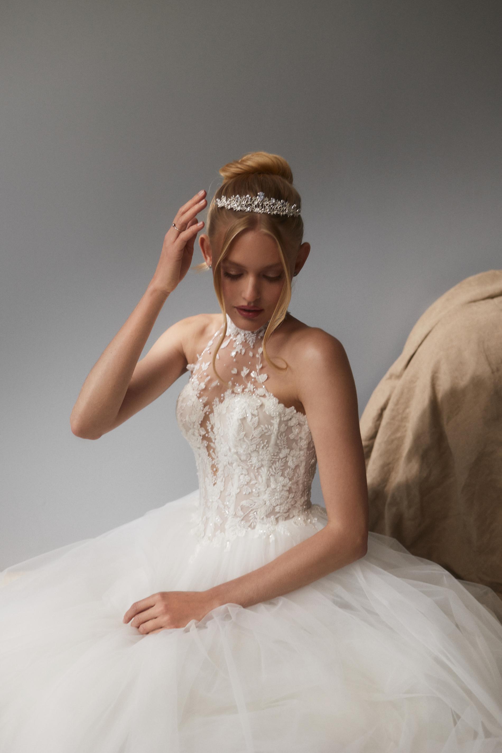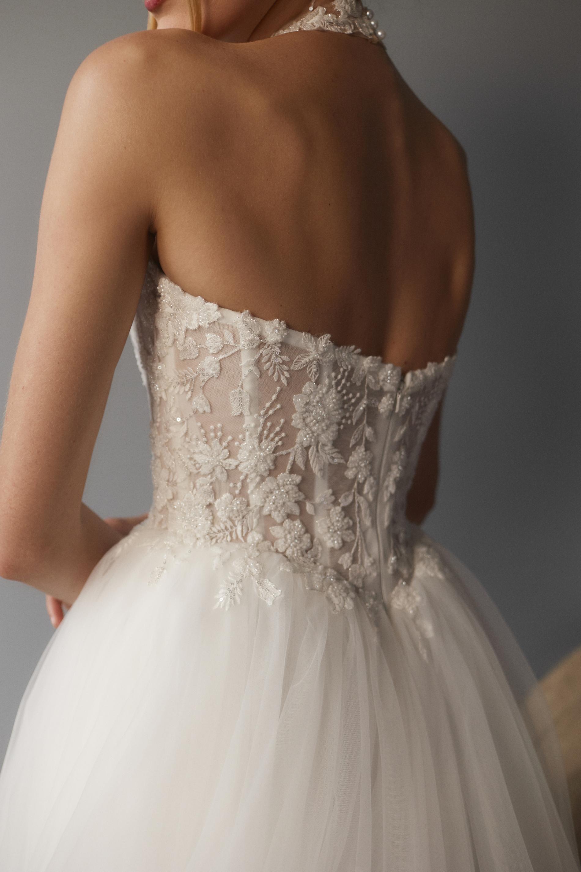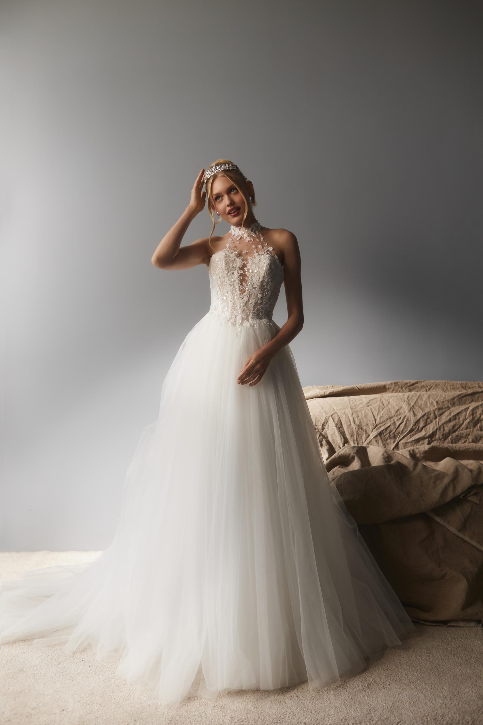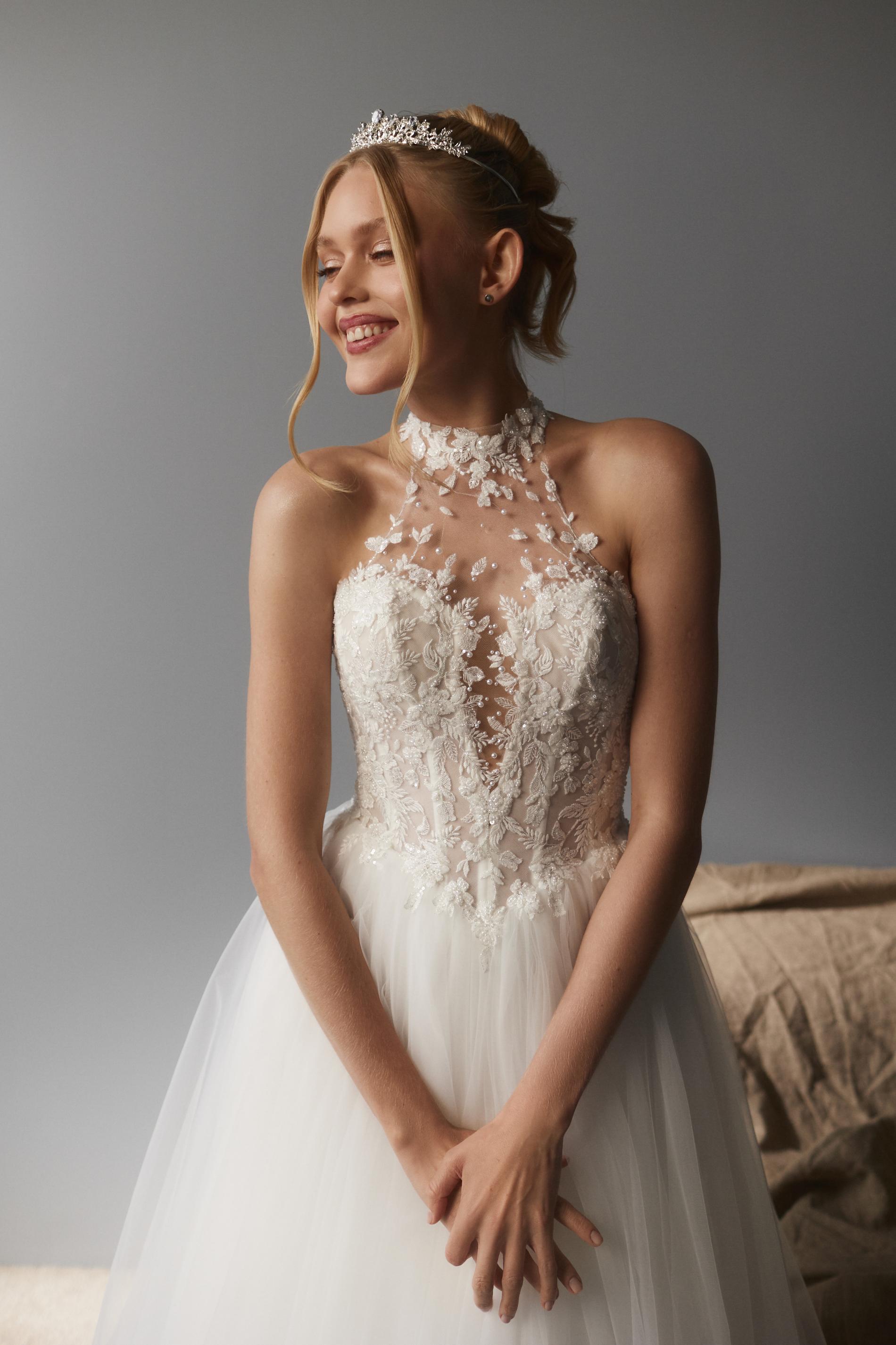Свадебное платье выполнено из легкого полупрозрачного материала, расшито объемной флористической вышивкой белого цвета. Лиф оформлен высоким воротником на прозрачной сетке и глубоким фигурным вырезом, плавно переходящим к открытому лифу. Основу платья составляет корсет с эффектом невесомости, украшенный изящными узорами. Юбка длинная, пышная, многослойная и изготовлена из мягкого фатина, создающего воздушный силуэт.