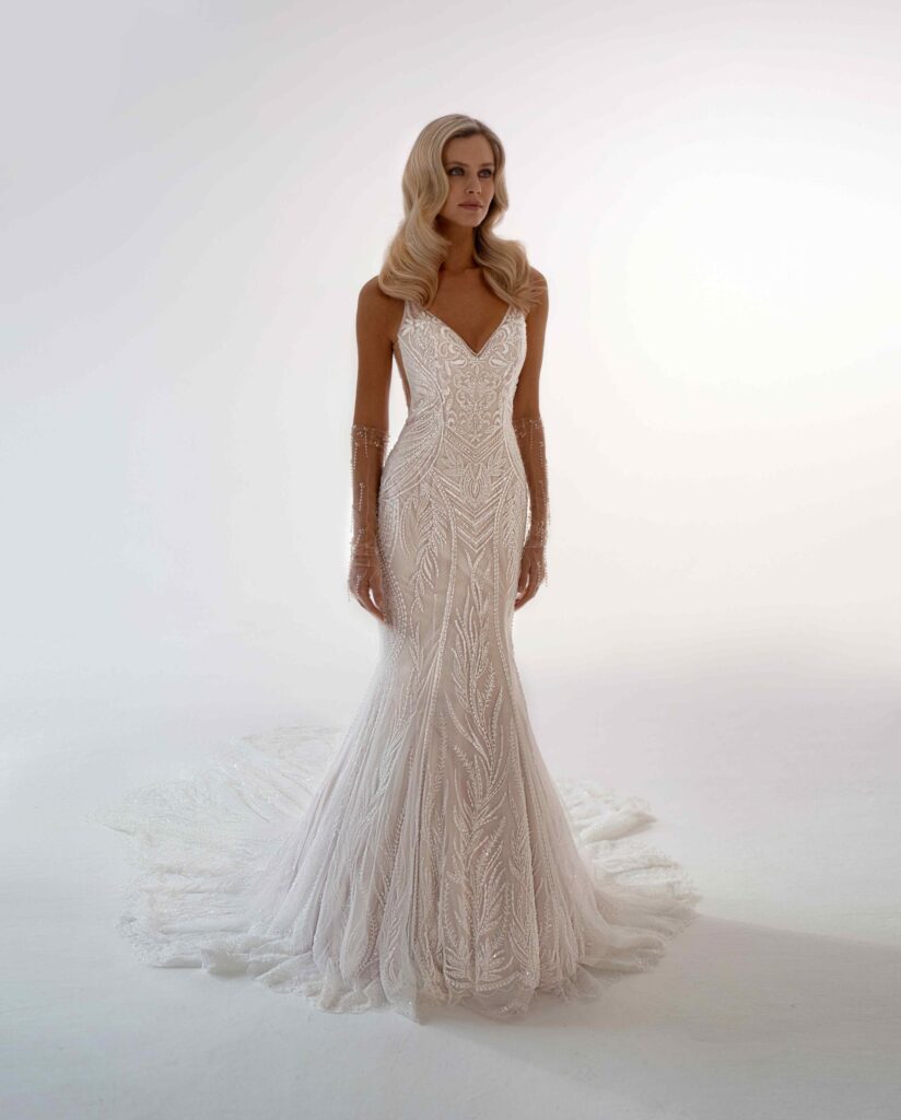 Свадебное платье приталенного силуэта, выполненное из переливающейся ткани с мягким глиттерным блеском. Лиф с глубоким сердцевидным вырезом и тонкими декоративными бретелями, украшенными камнями. Корсет с прозрачными вставками элегантно подчеркивает талию, а драпировка в области бедер переходит в высокий разрез на юбке, делая образ по-настоящему эффектным и современным.