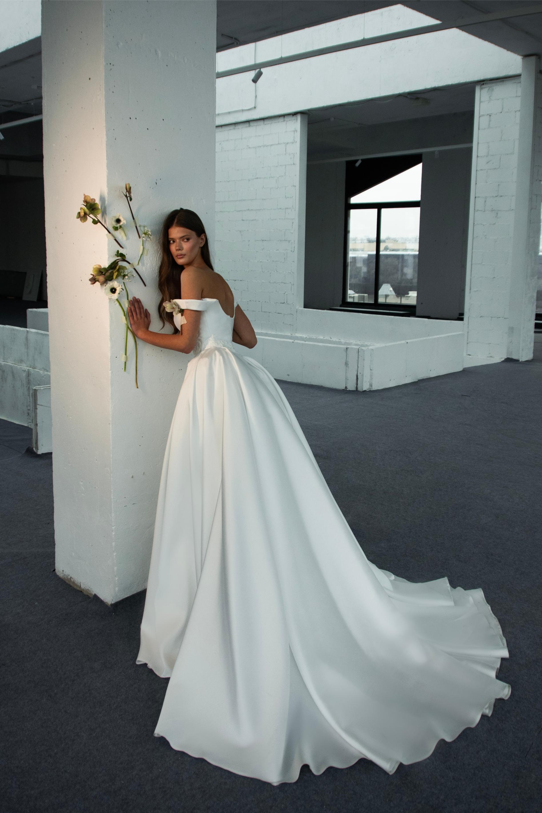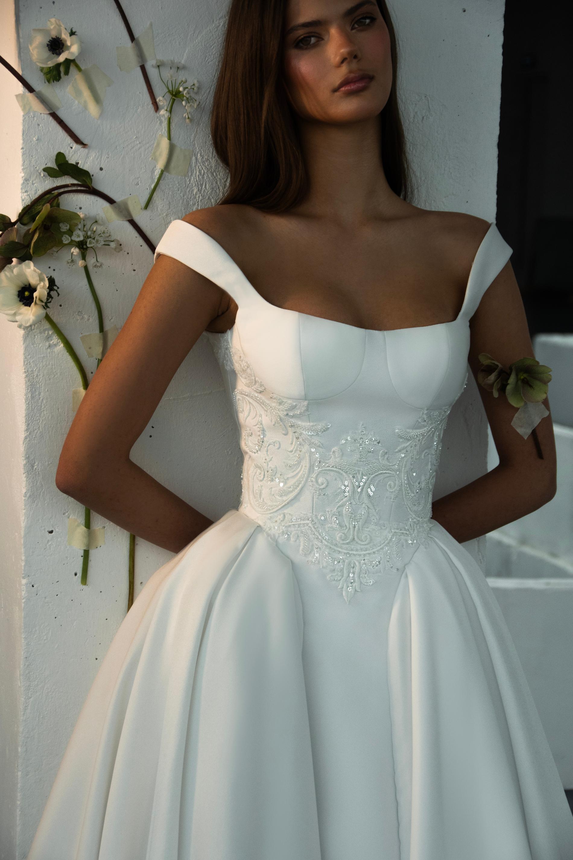 Свадебное платье выполнено из плотного белого атласа, создающего ярко выраженный объем и эффект королевского наряда. Корсетный лиф с глубоким декольте украшен вышивкой, а широкие спущенные бретели элегантно подчеркивают плечи. Юбка пышная, расклешенная, с мягкими складками и плавным удлинением к полу.