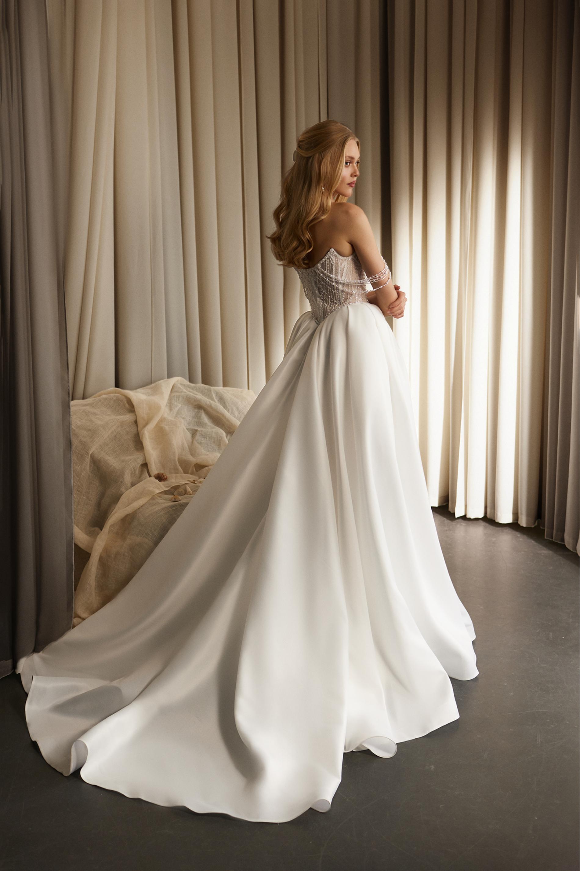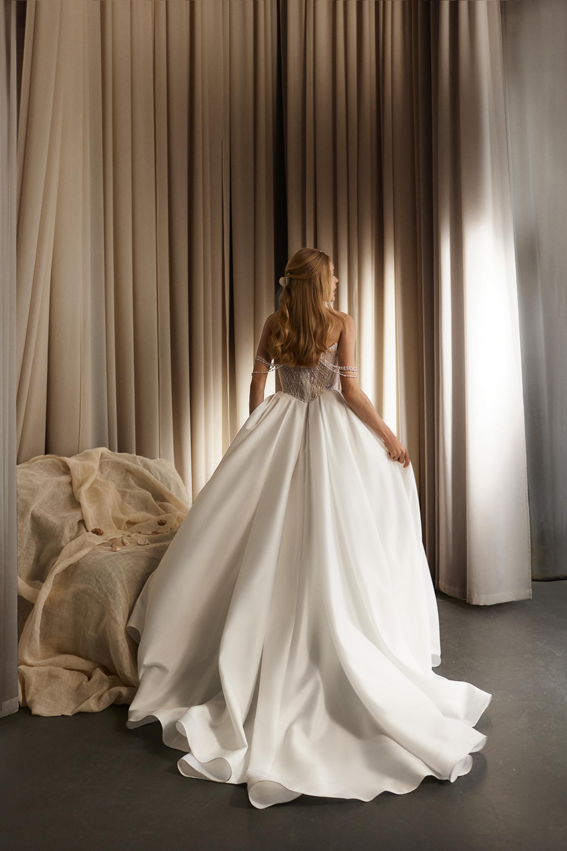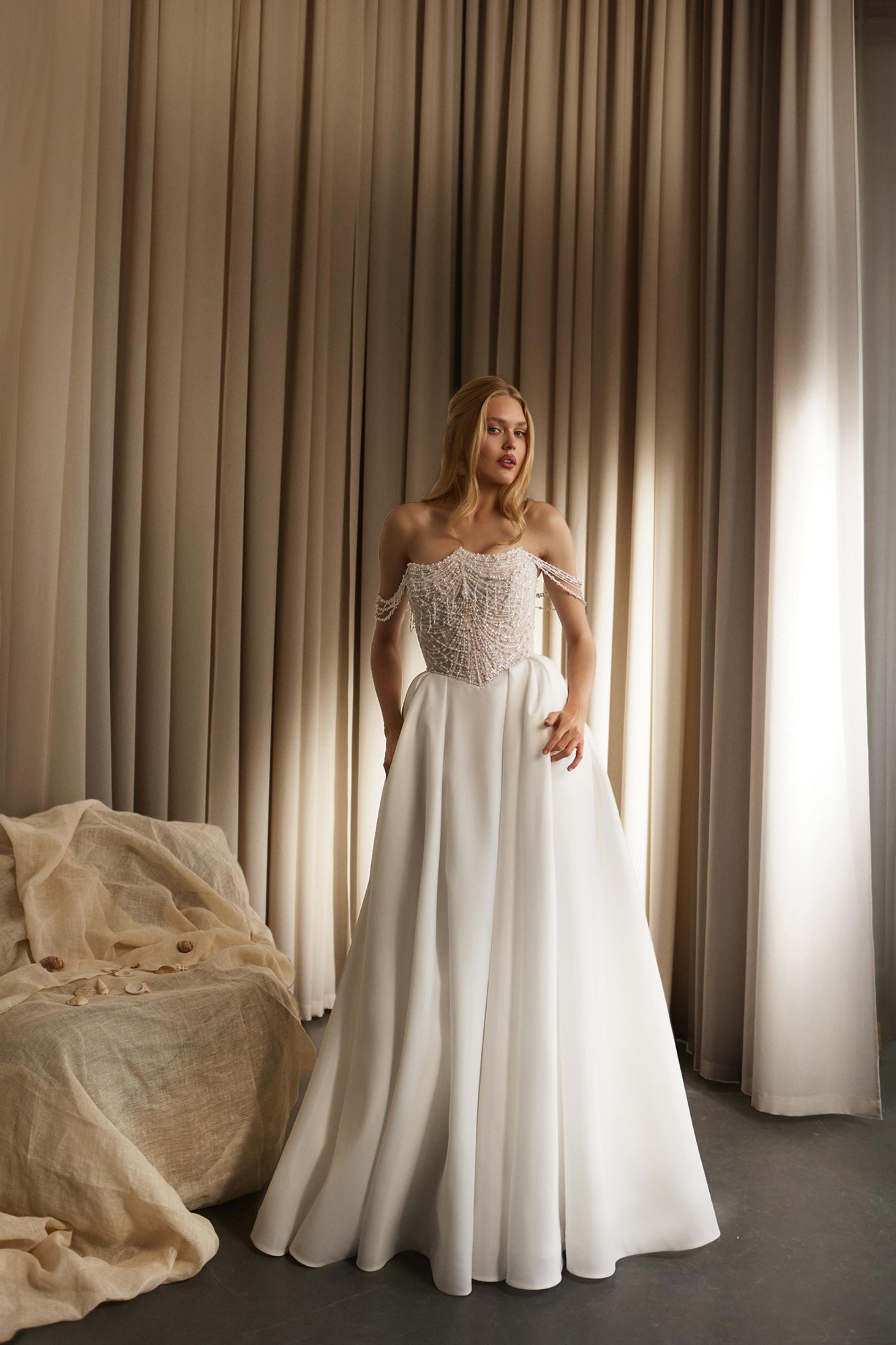 Свадебное платье имеет корсет с открытыми плечами и широким фигурным вырезом, украшенный сложной бисерной вышивкой. Бретели декорированы мягкими жемчужными нитями, элегантно спадающими на руки. Юбка выполнена из плотной гладкой ткани, отличается объемом и классическим фасоном в пол. Контраст между фактурным верхом и лаконичной юбкой делает образ особенно выразительным.