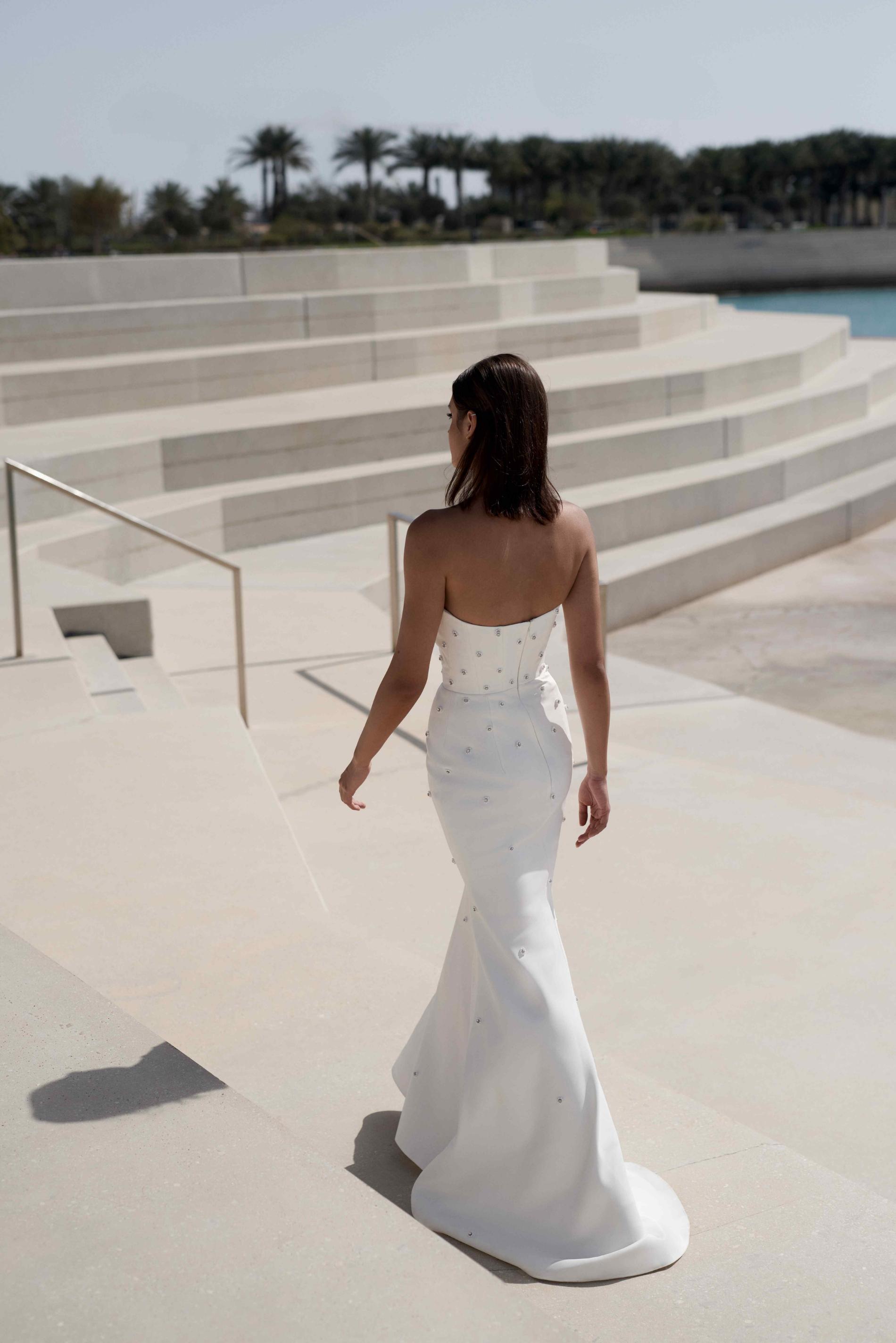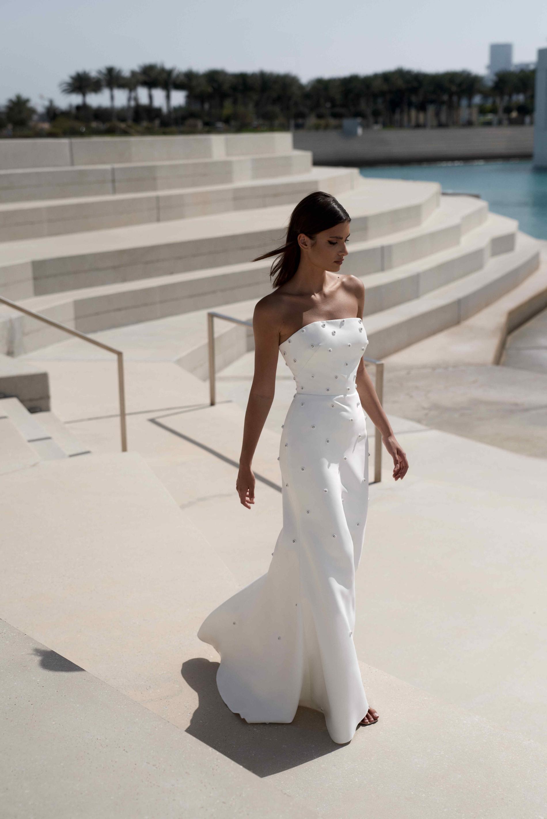 Свадебное платье силуэта русалка с открытыми плечами выполнено из матовой ткани и украшено миниатюрными жемчужинами по всей длине. Плавный расширяющийся низ и чистые линии создают сдержанный и изысканный образ