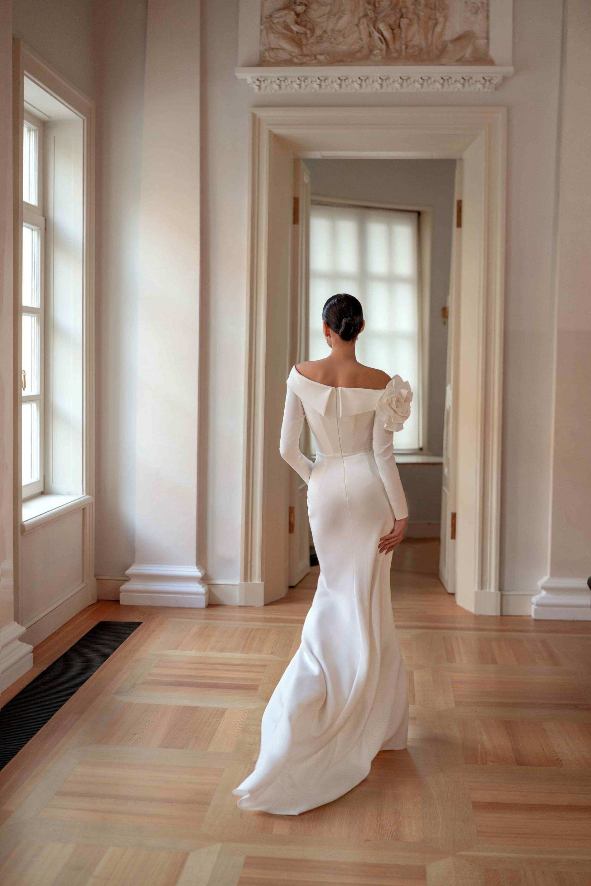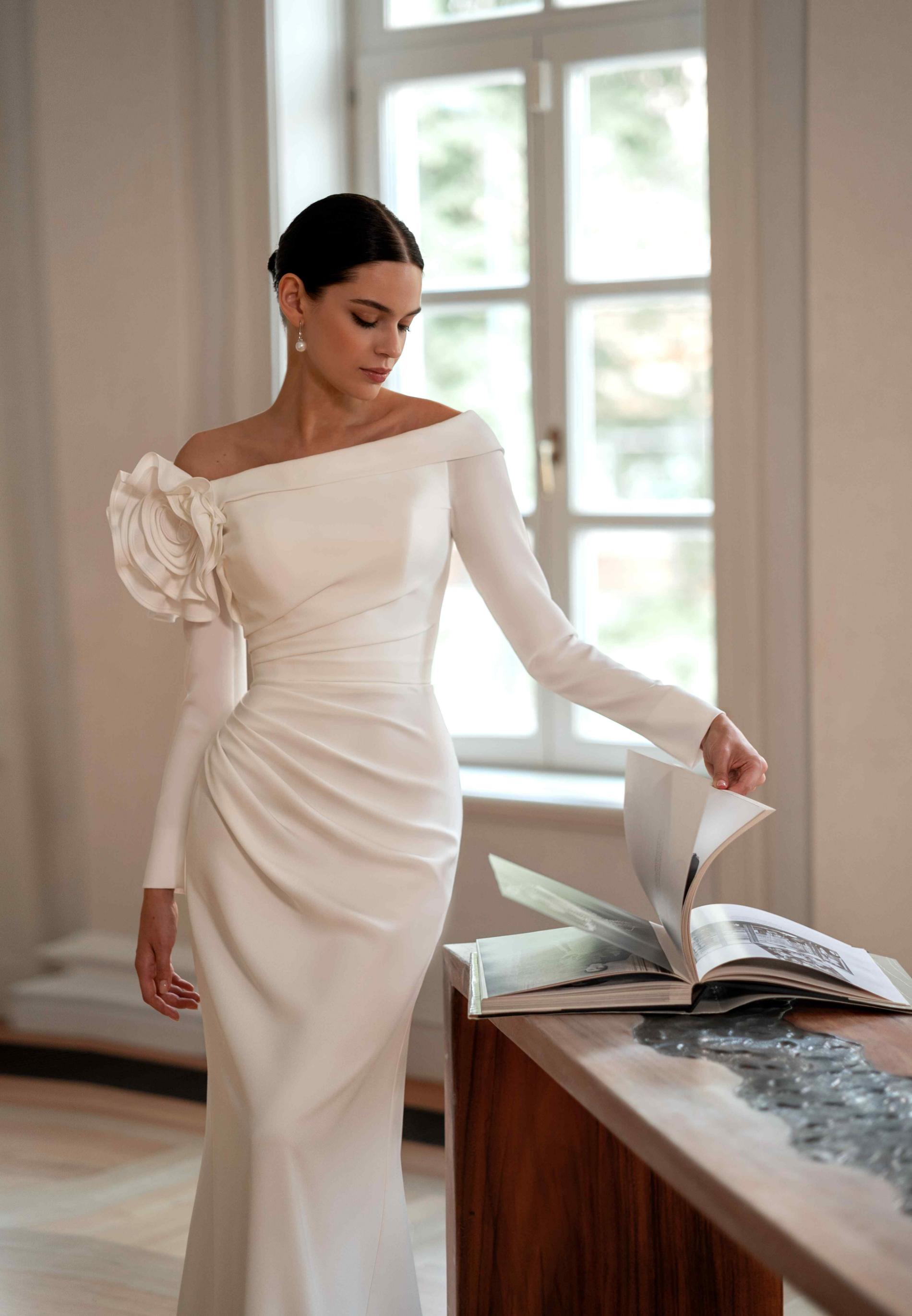 Свадебное платье прямого кроя, выполненное из гладкой ткани, с асимметричным открытым плечом и длинным рукавом. На плече украшение в виде объемной текстильной розы, а мягкая драпировка подчеркивает талию. Минималистичный дизайн придает образу современность и изысканность.