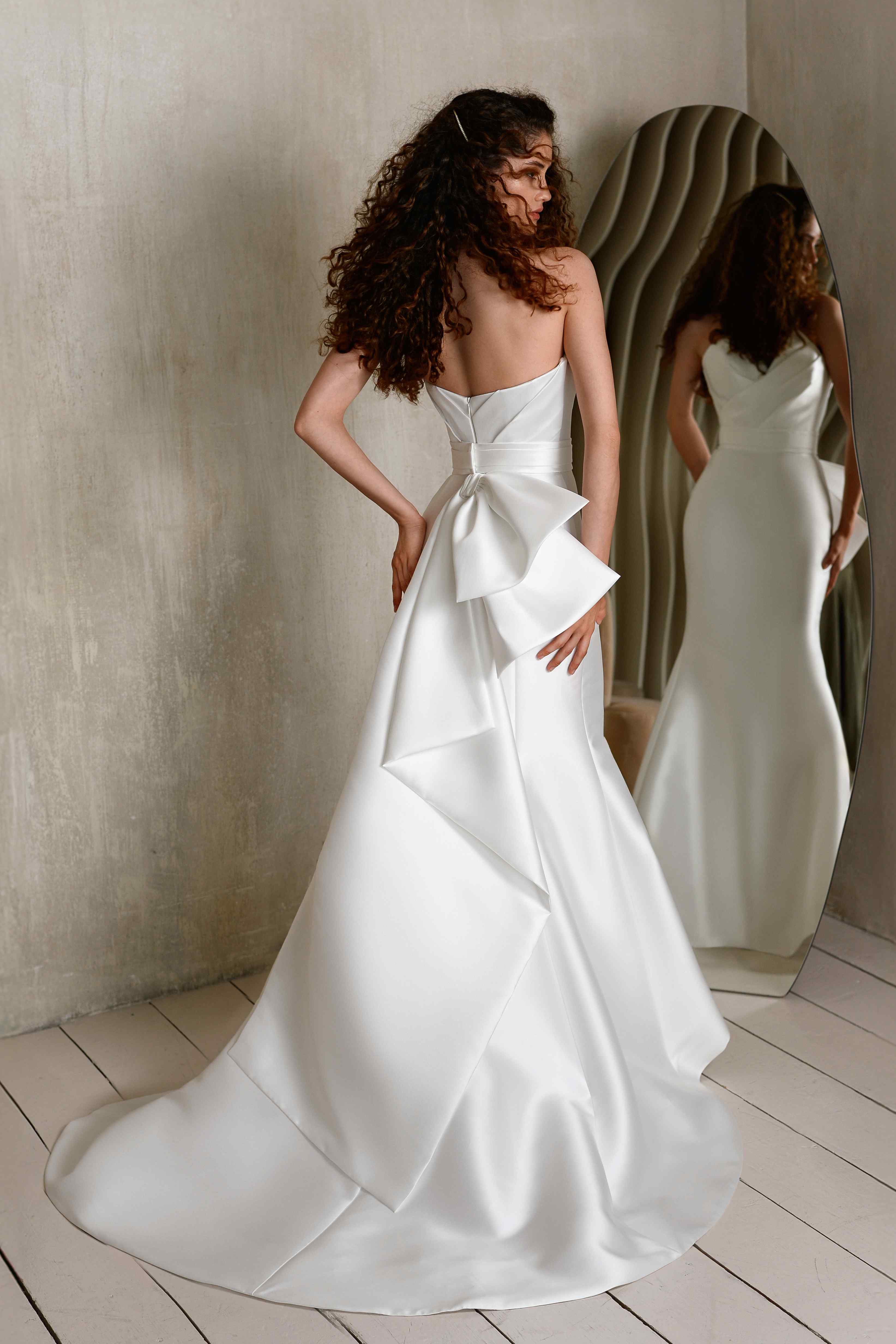 Свадебное платье в стиле «новая классика» — приталенное, с открытыми плечами и драпированной линией лифа. Гладкая атласная ткань красиво отражает свет, формируя сдержанно-торжественный образ. На талии — асимметричная конструкция, а сзади — большой декоративный бант, который добавляет романтики и объёма. Образ прекрасно дополняет фиалковый шлейф и современный аксессуар на шее.