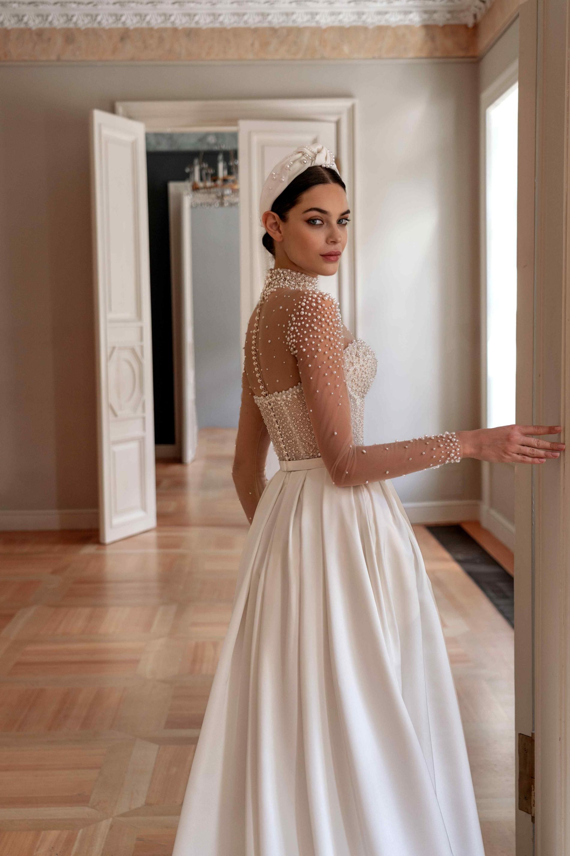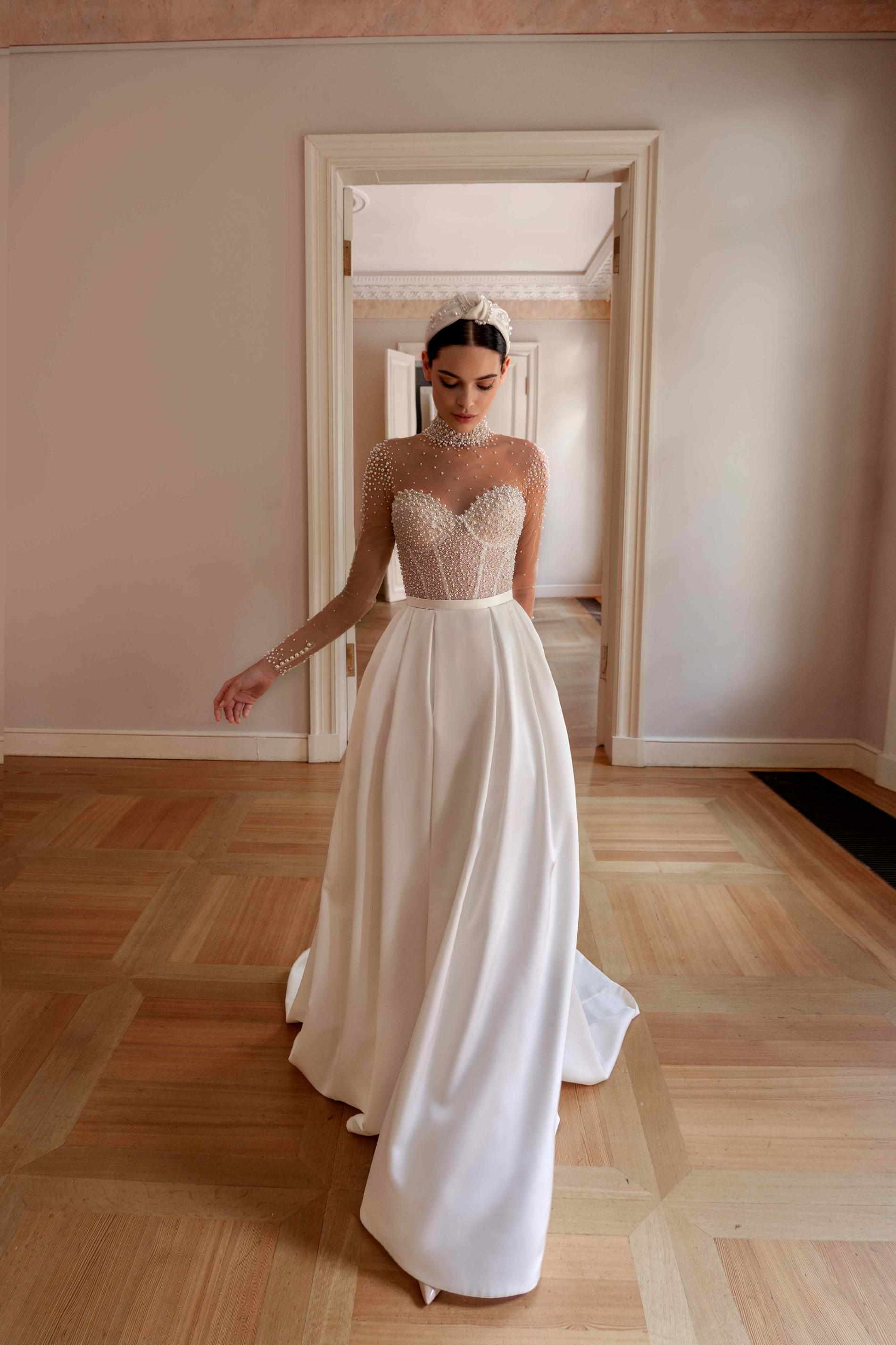 Свадебное платье классического А-силуэта с роскошной длинной юбкой из гладкой плотной ткани. Верх выполнен из прозрачной сетки, расшитой мерцающими бусинами и жемчужинами, формирующими изящный корсет с фигурной линией декольте. Высокий воротник и длинные рукава создают ощущение торжественности и утончённости образа.