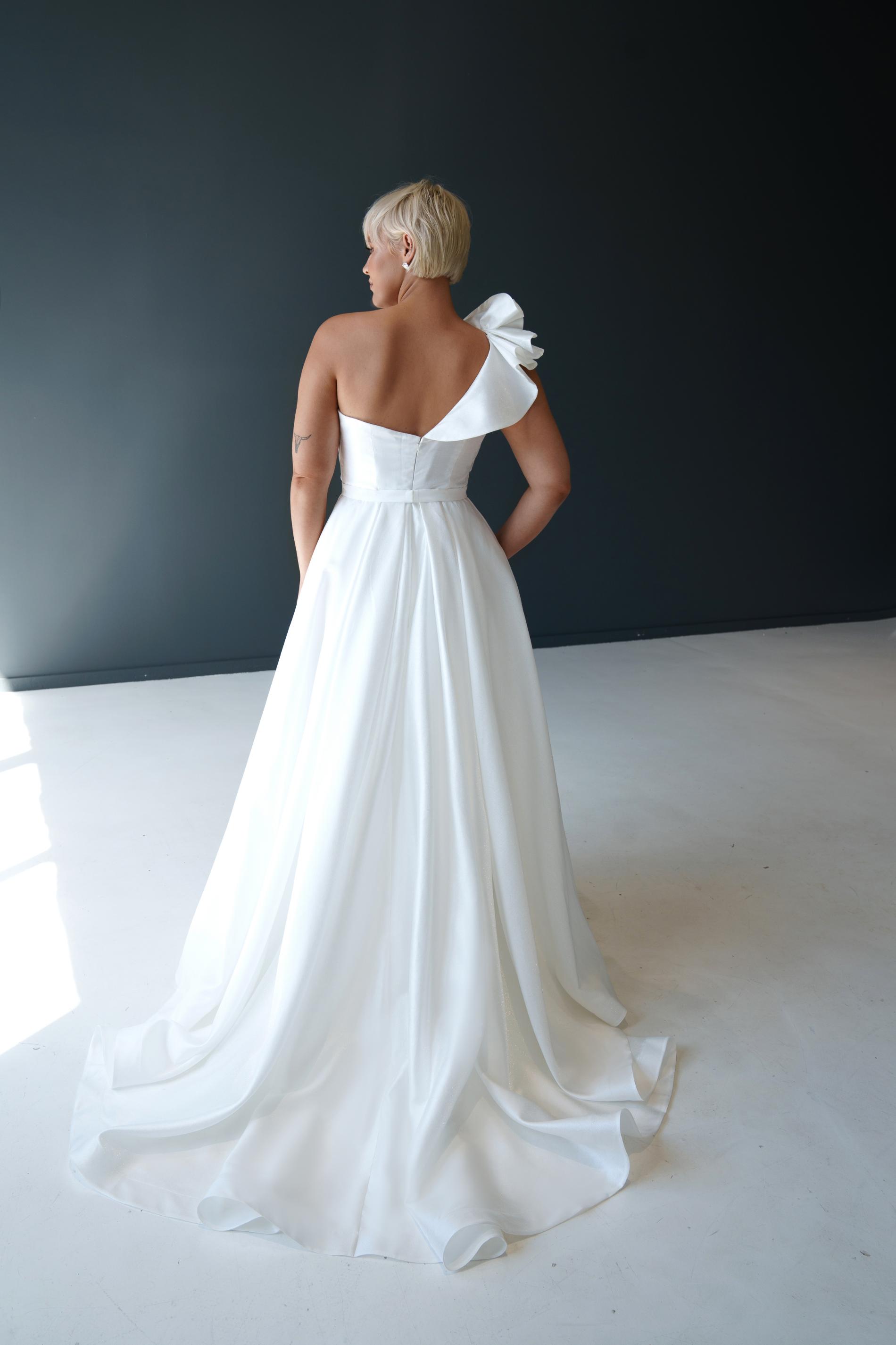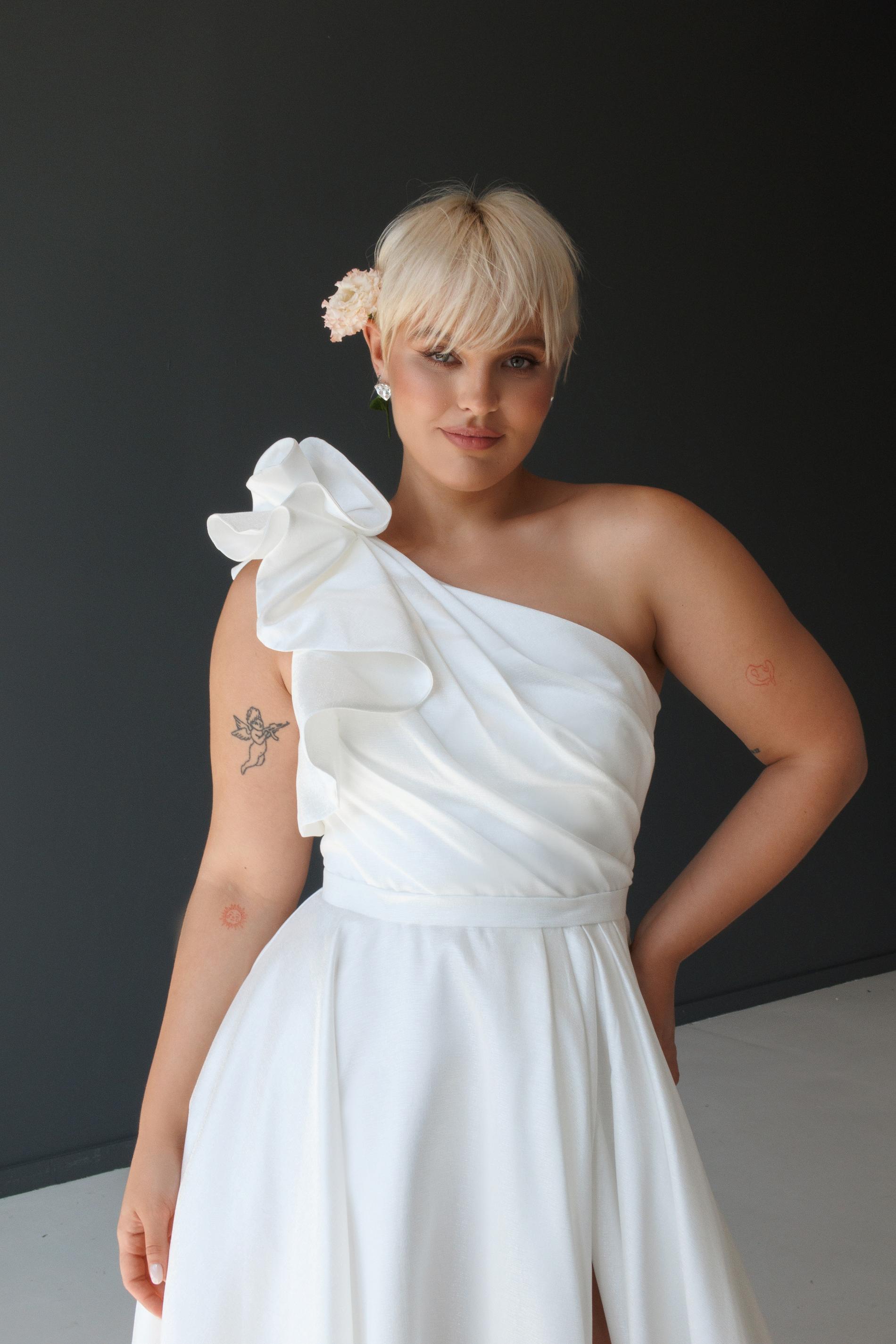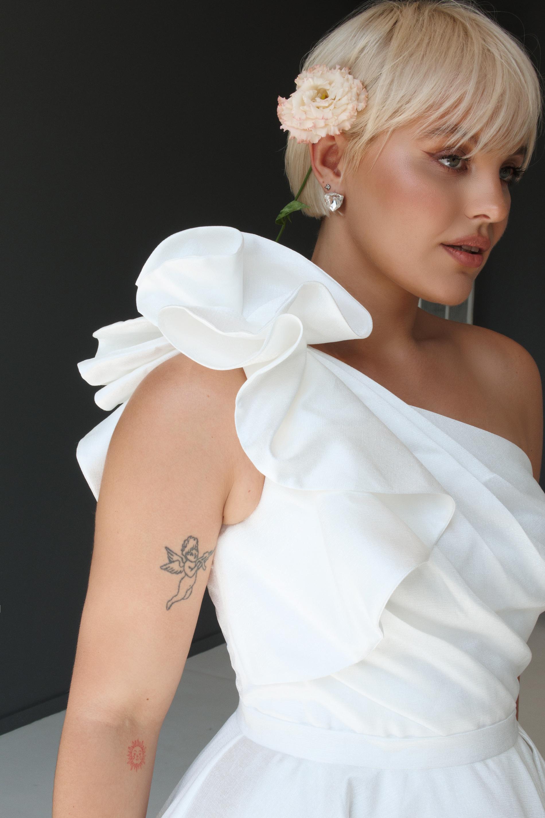 Свадебное платье изготовлено из гладкой белой ткани и отличается асимметричным кроем с одним плечом и объемным рюшем. Талия подчеркнута узким поясом, а юбка выполнена свободной и струящейся. Особенность модели — высокий разрез на ноге, который придаёт образу кокетливость и элегантность. Минималистичный дизайн платья гармонично сочетается с выразительным акцентом на юбке.