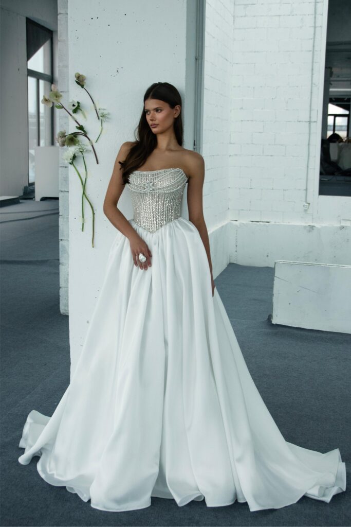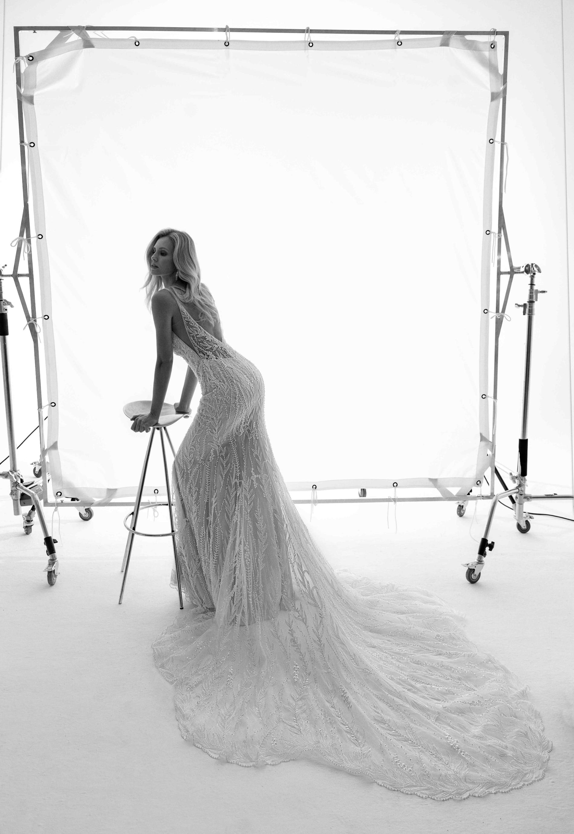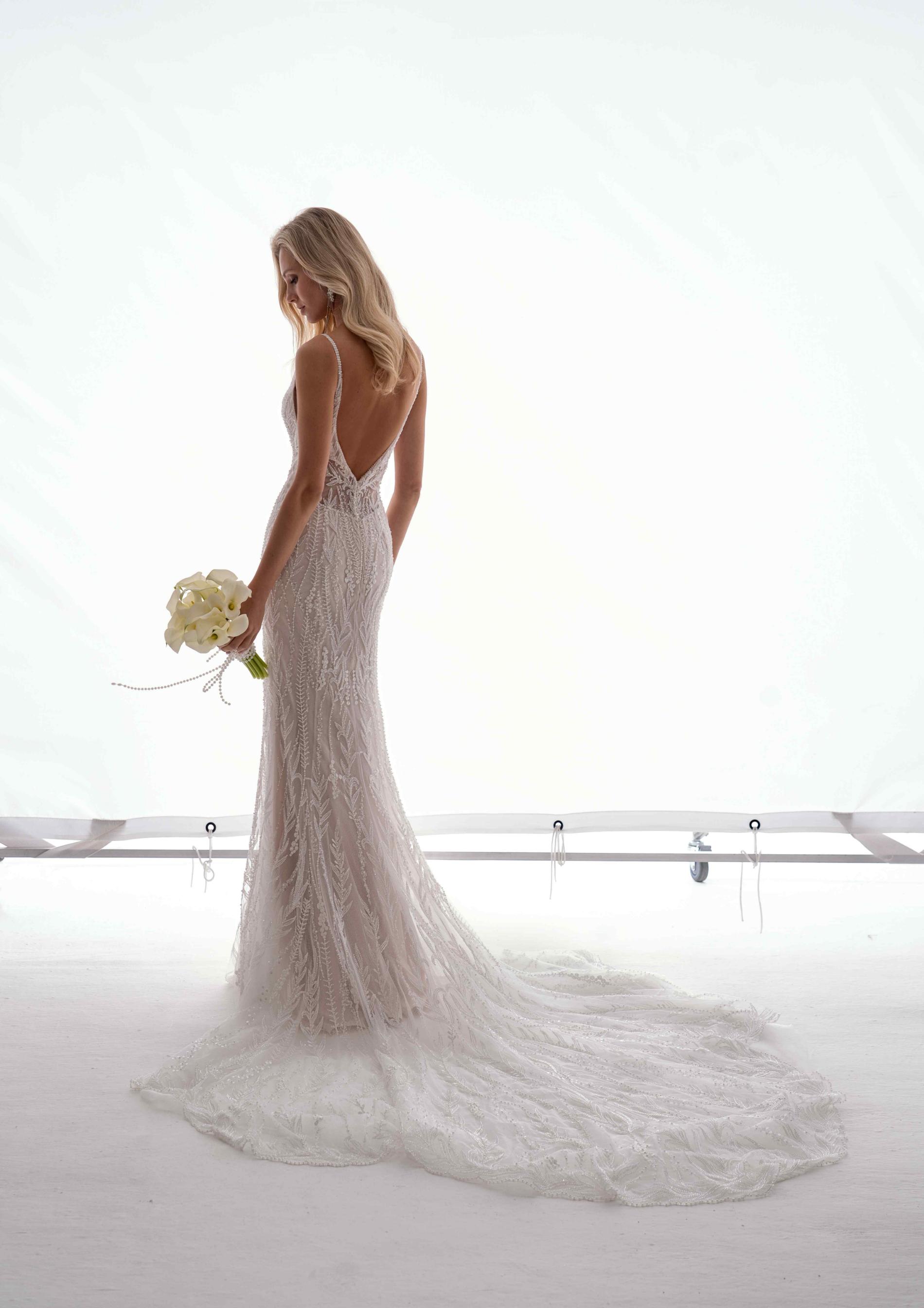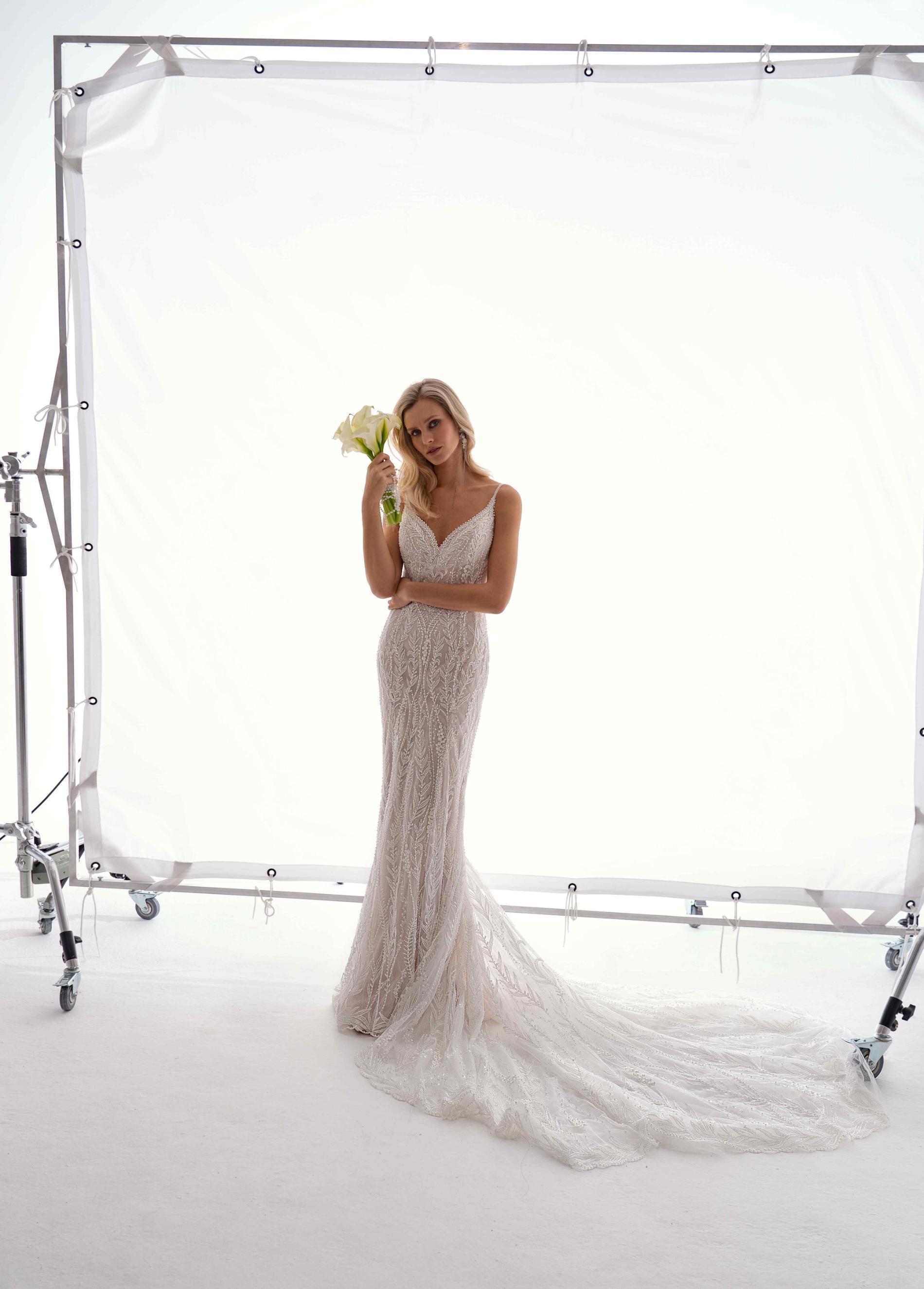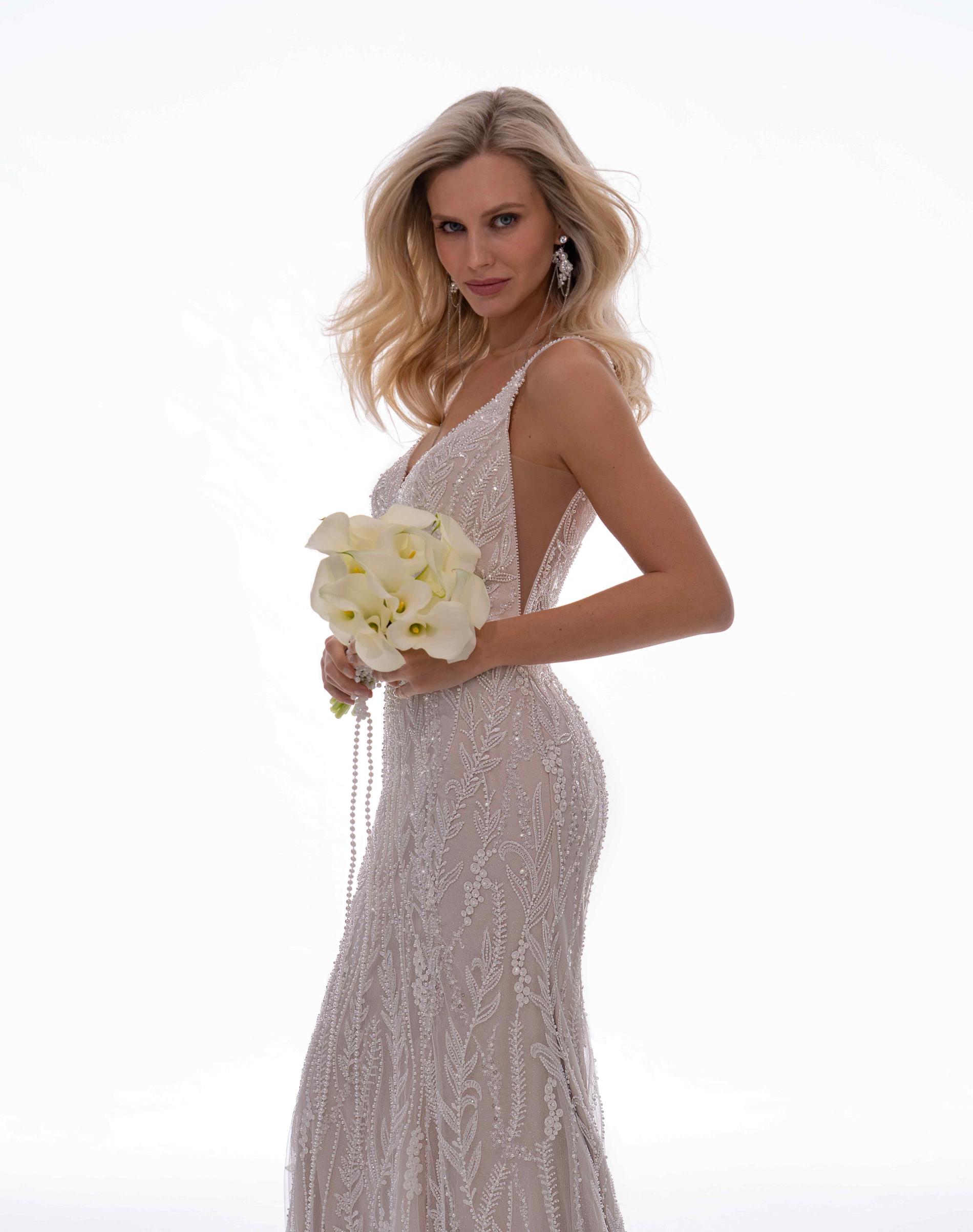 Свадебное платье цвета нюд с глубоким декольте и длинным шлейфом, украшено блестящими аппликациями и вышивкой.