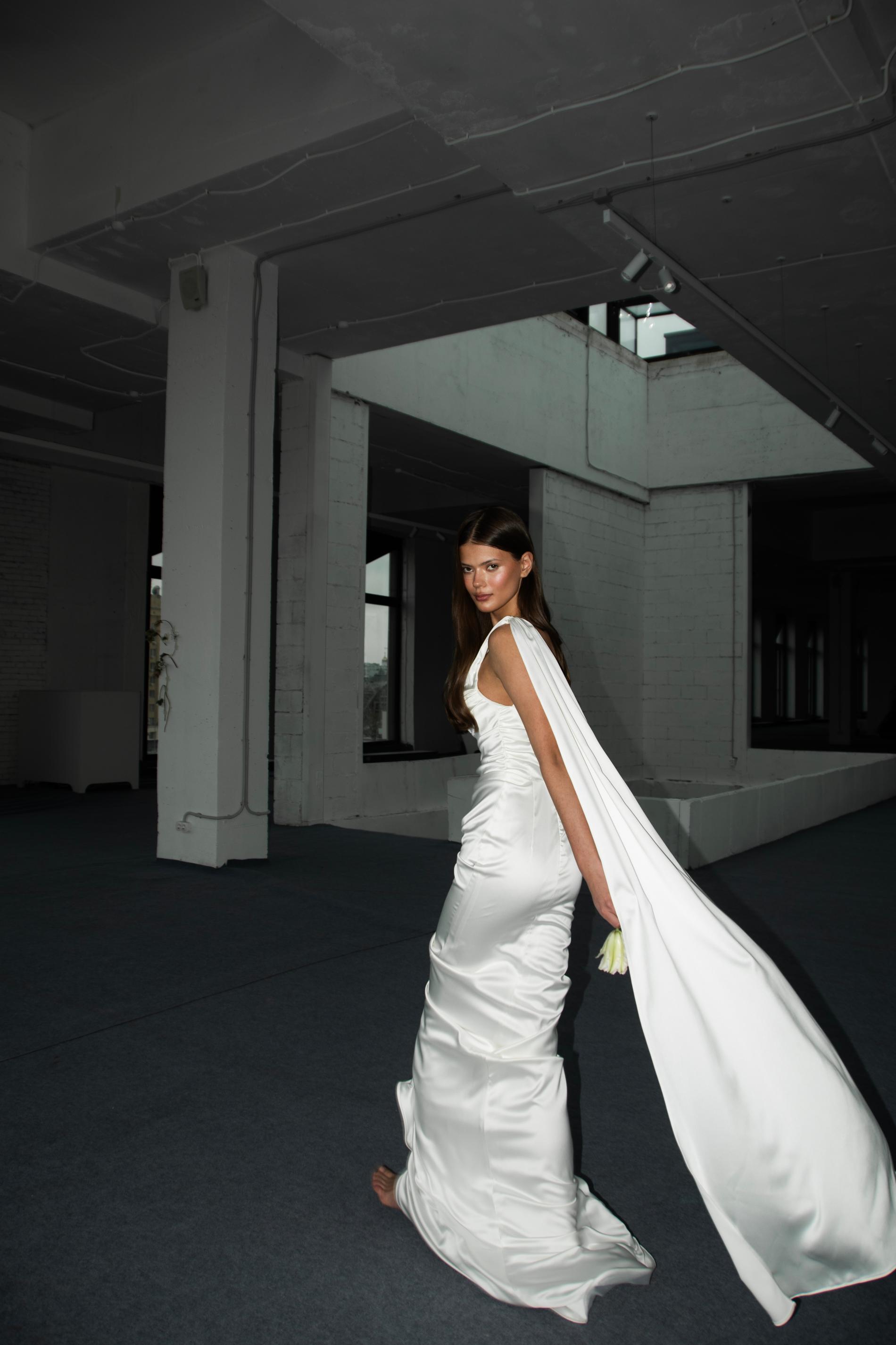 Свадебное платье выполнено из гладкой белой ткани с шелковистым блеском и драпировкой по диагонали лифа. Одна бретель переходит в длинную накидку-накидной шлейф, спускающуюся по спине и плавно ложащуюся на пол. Приталенный силуэт и мягкая драпировка ткани элегантно подчеркивают фигуру, создавая современный минималистичный образ.