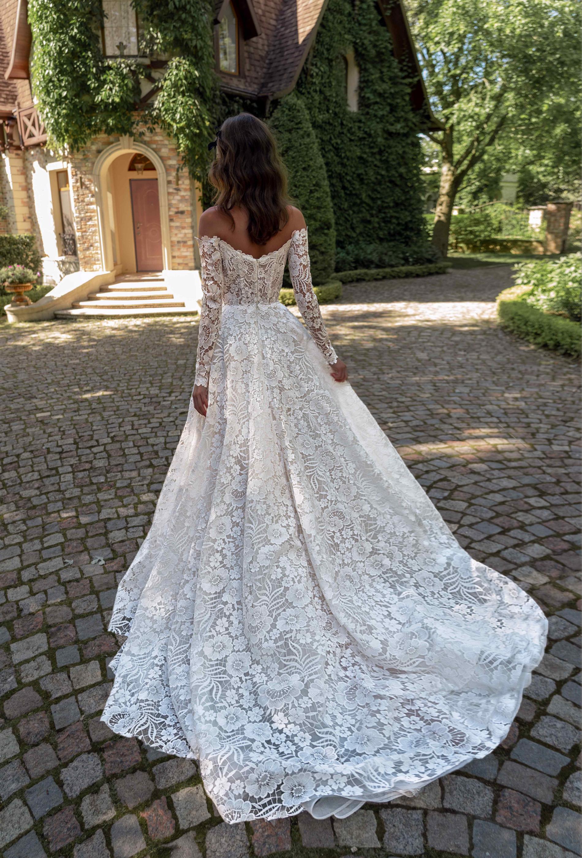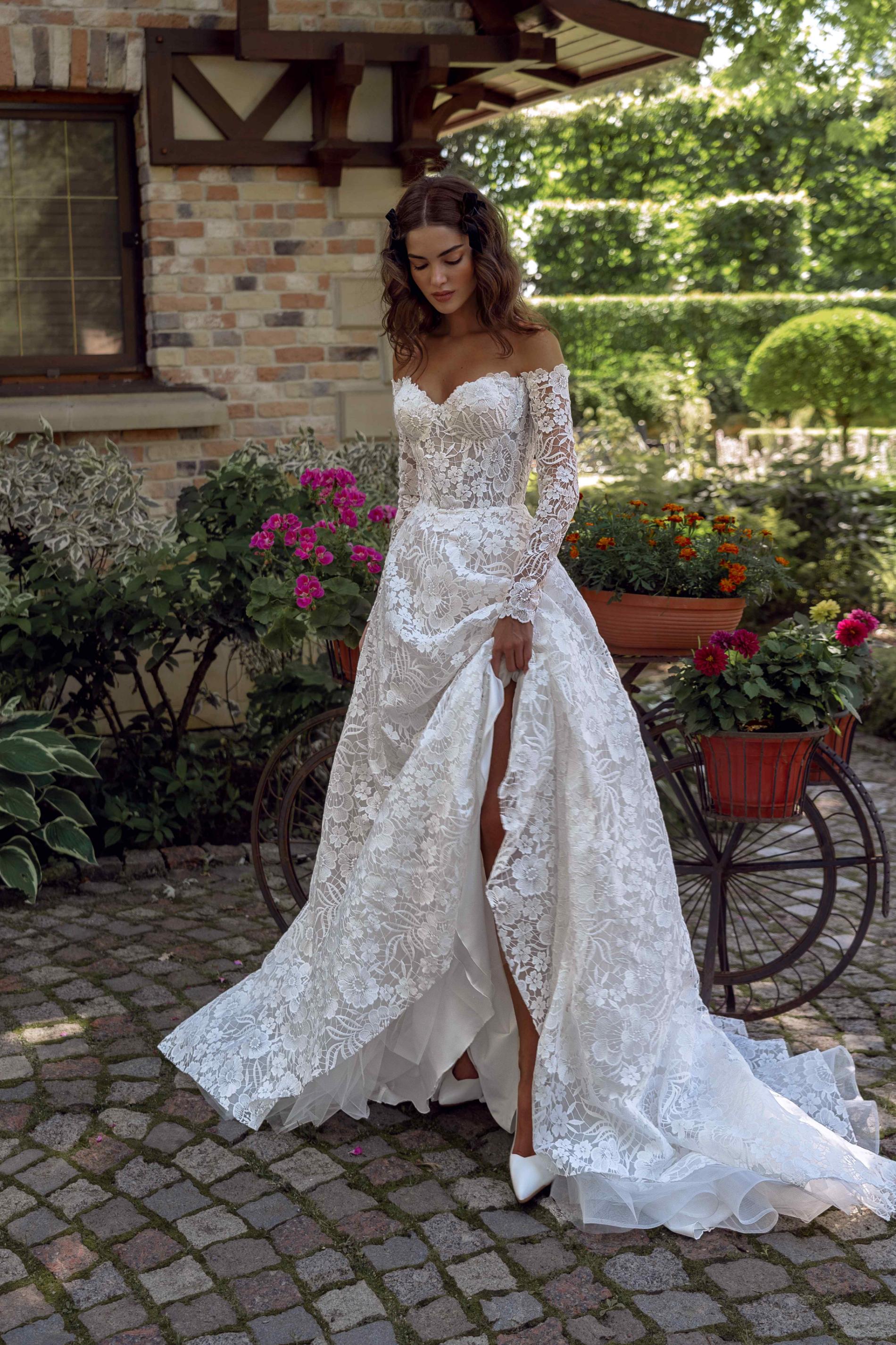 Свадебное платье — классическое кружевное с длинными рукавами, выполненное полностью из цветочного кружева. Образ дополняет длинная прозрачная фата, создавая атмосферу торжества и нежности.