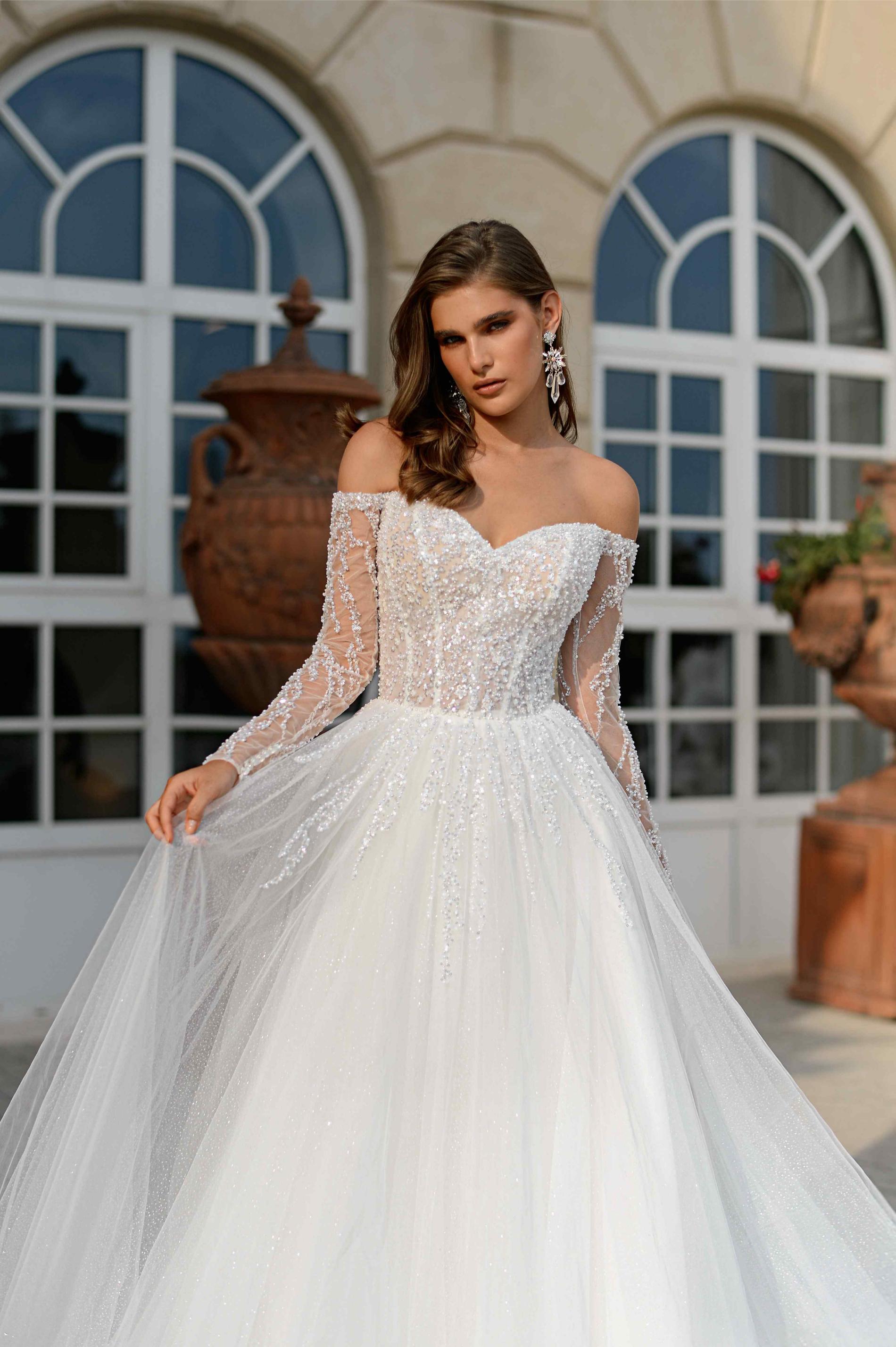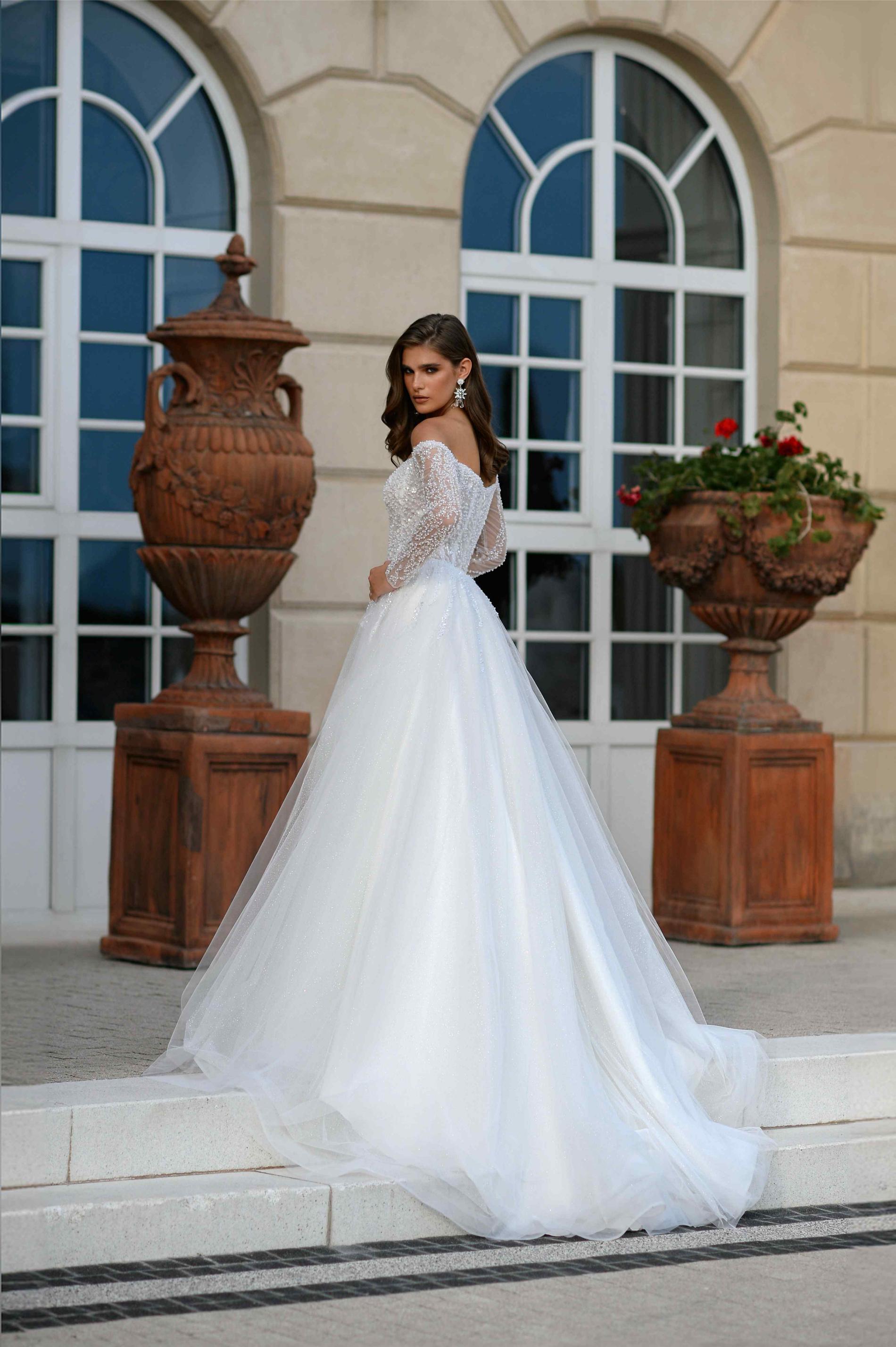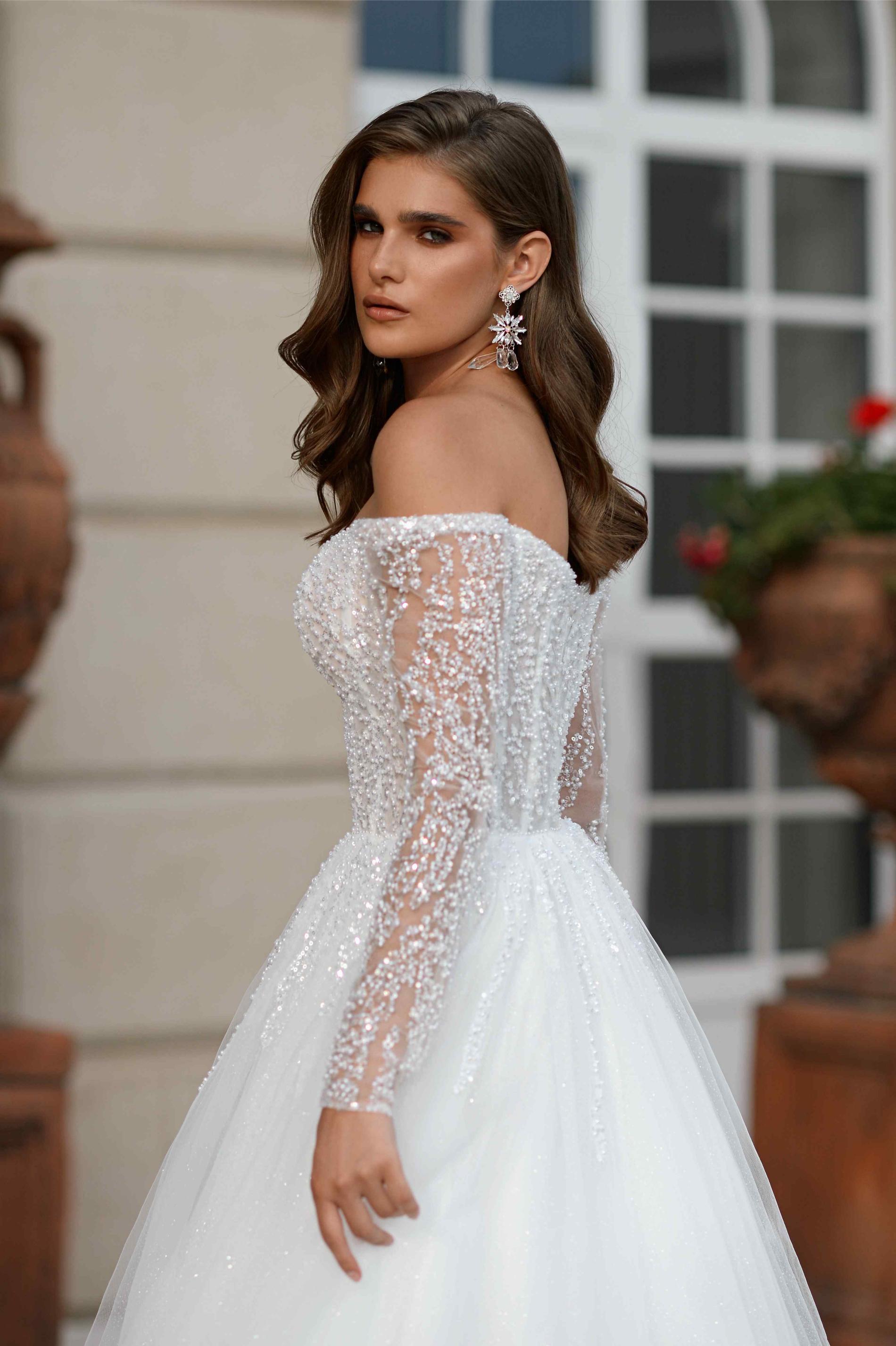 Свадебное платье с эффектом открытых плеч. Корсет оформлен в форме сердечка и расшит блестящими бусинами и пайетками, переходящими на прозрачные длинные рукава и верхнюю часть грудки. Основная часть — многослойная фатиновая юбка, создающая сказочный объём и лёгкость.