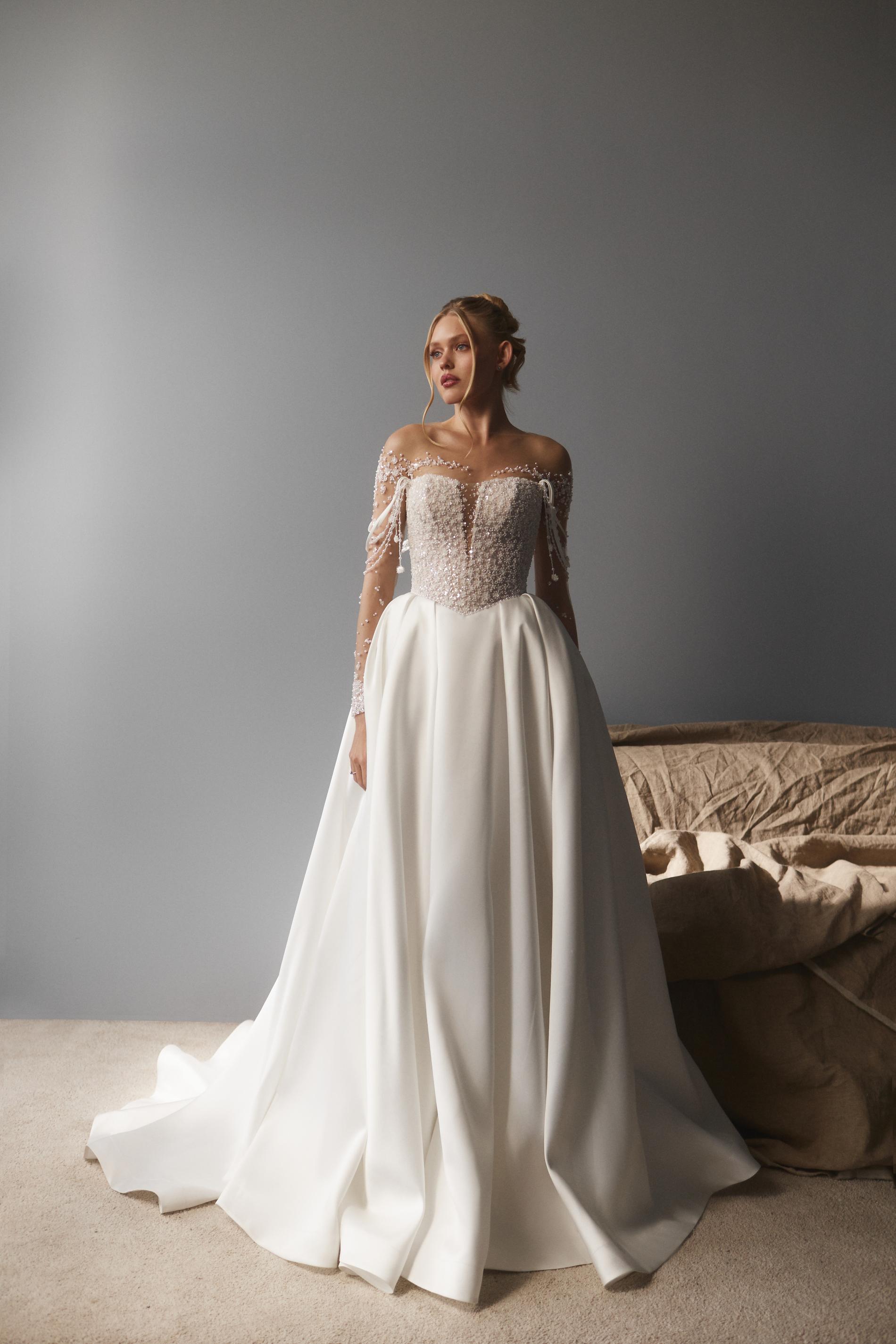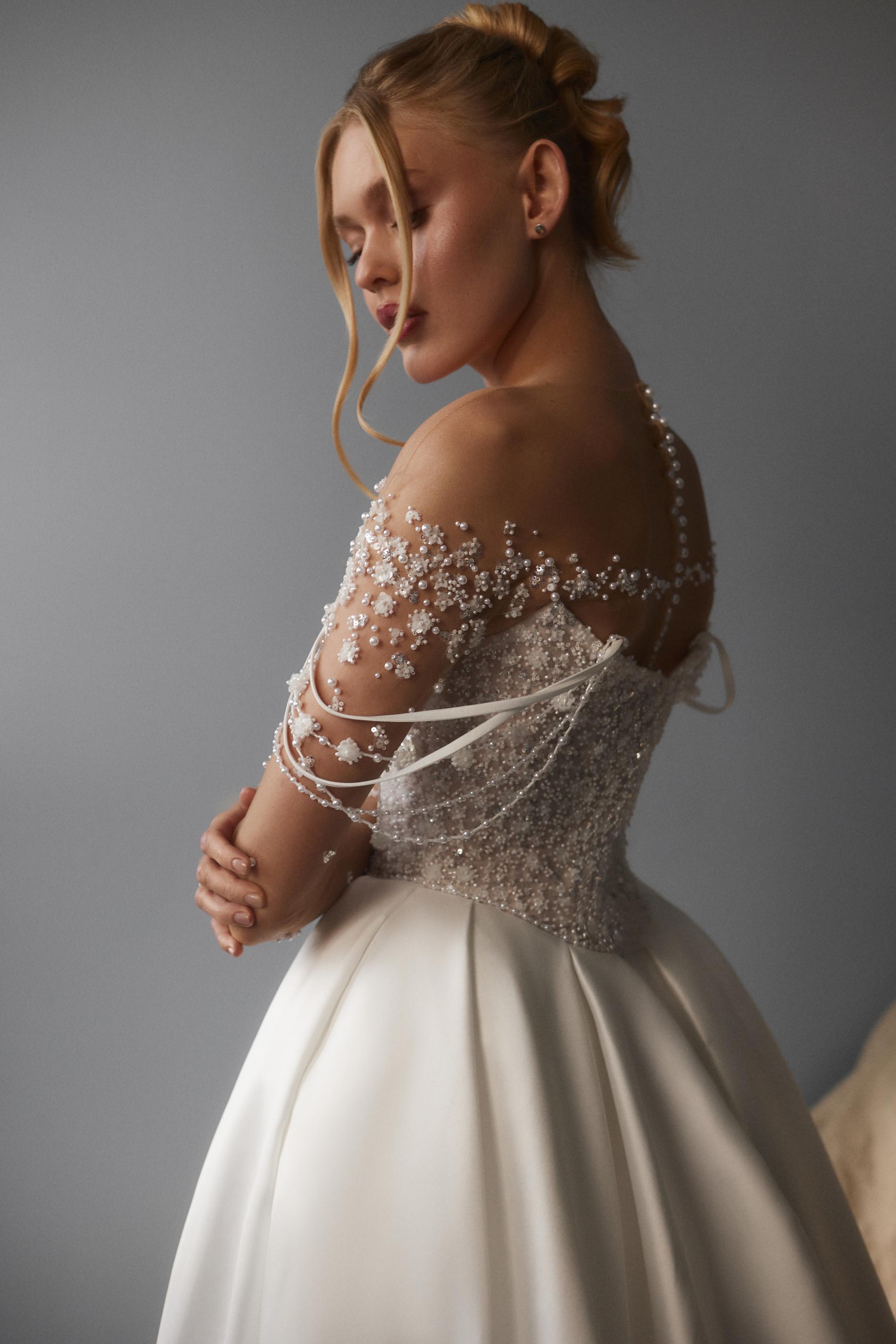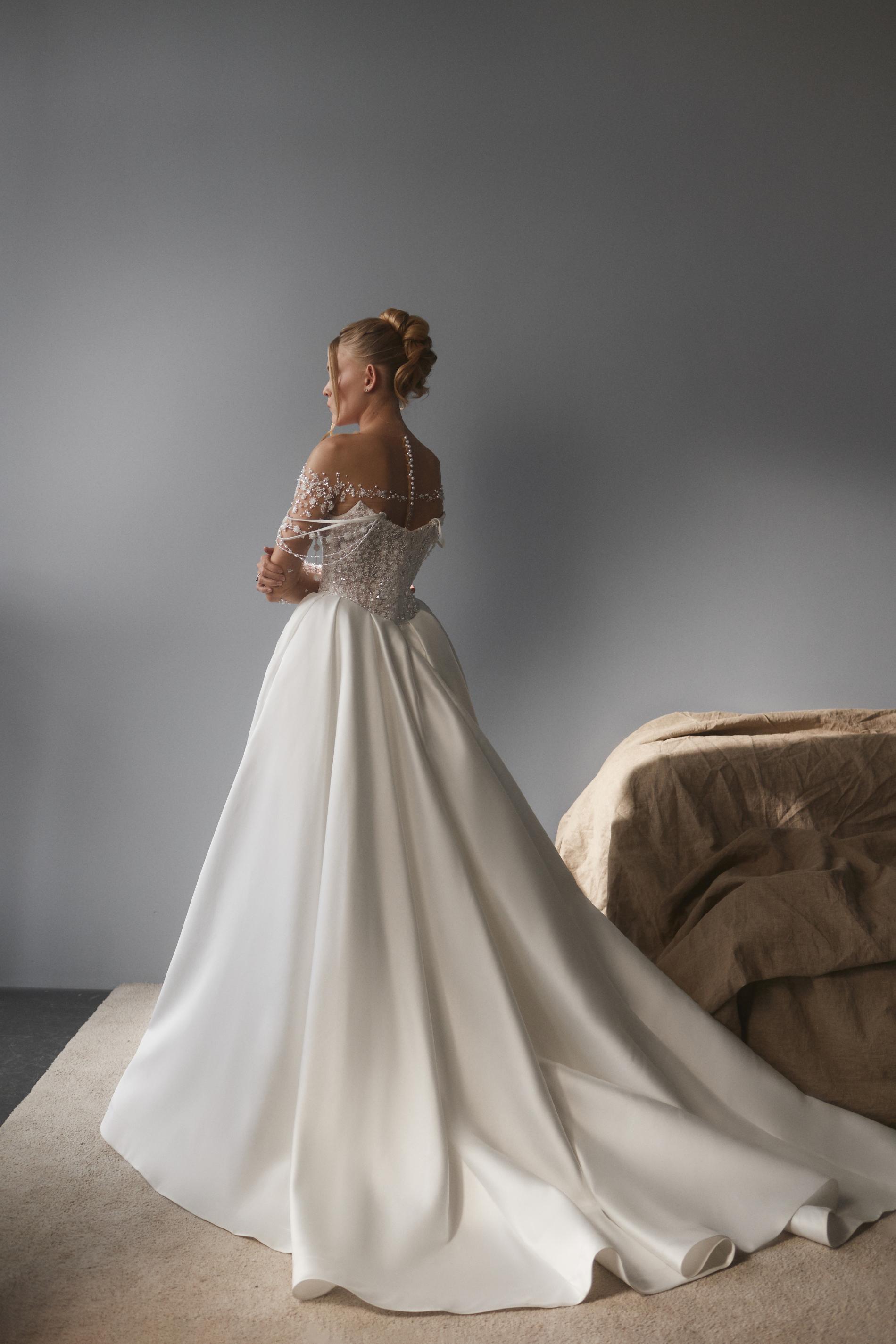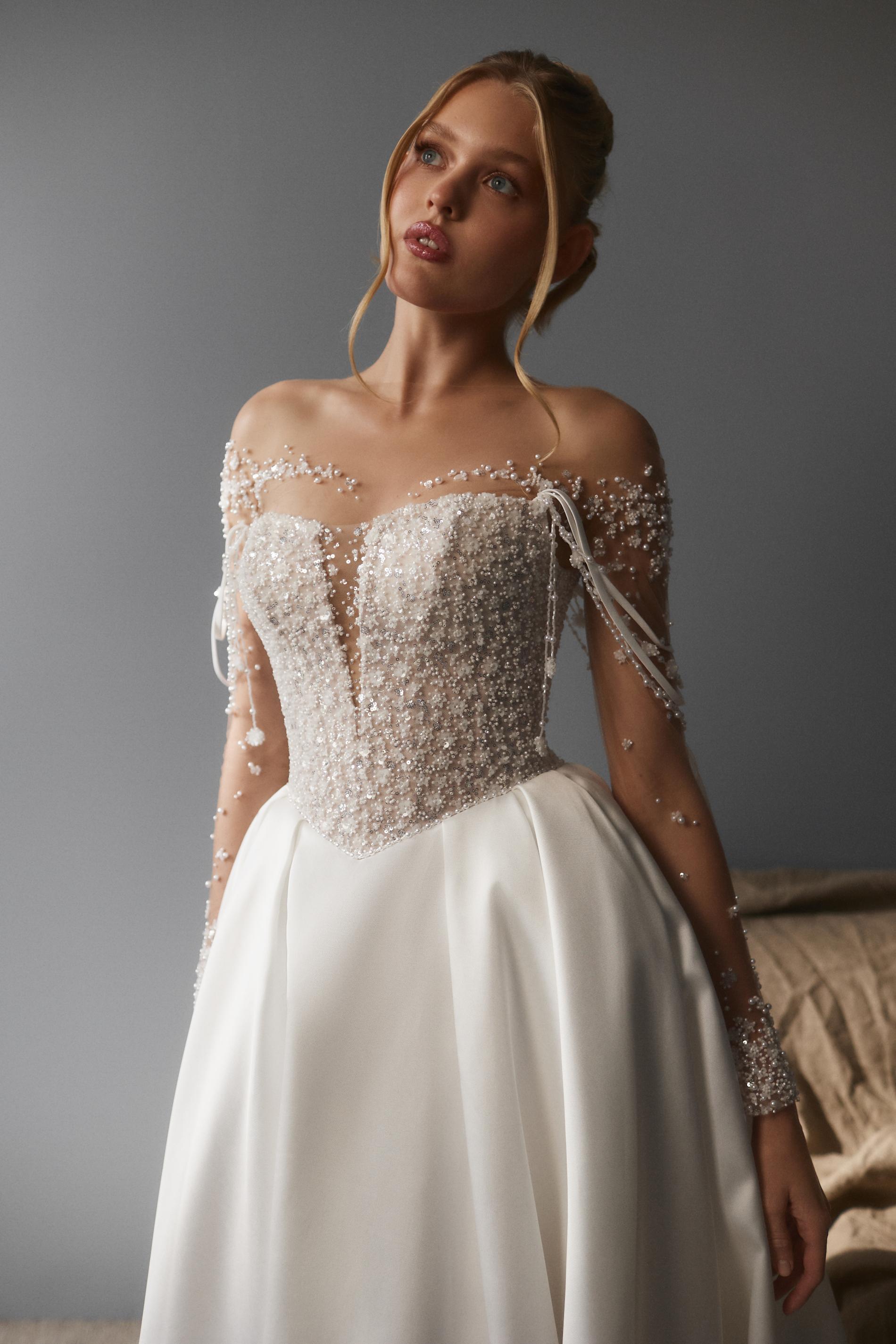 Свадебное платье украшено полупрозрачным корсетом с длинными рукавами и потрясающей вышивкой из бисера и маленьких цветочных элементов. Лиф оформлен глубоким декольте, а линия декольте и плеча акцентирована множеством рассыпных бусин. Рукава прилегающие, с изящными лентами и объемным декором по всей длине. Юбка из плотной гладкой ткани с легкими складками подчеркивает элегантность и объем силуэта.
