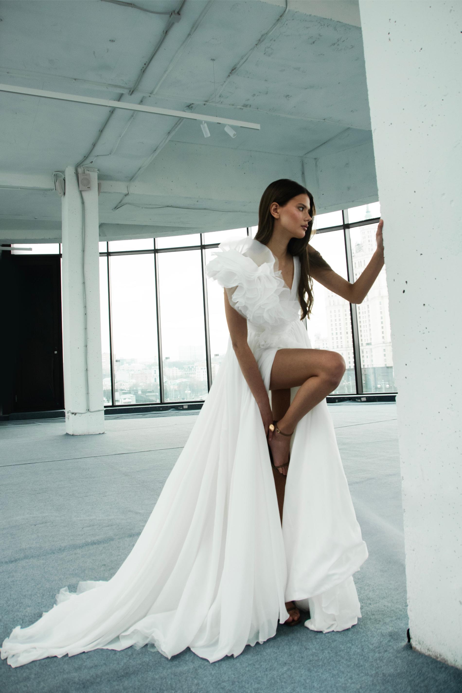 Свадебное платье отличается асимметричным верхом с крупным рельефным декором из мягких текстильных лепестков, который переходит по диагонали от плеча к талии. Линия декольте выполнена в V-образной форме, открывая одно плечо и придавая наряду скульптурный современный вид. Юбка из легкого шифона или фатина объемная, с мягкими складками, дополнена высоким разрезом на ноге.