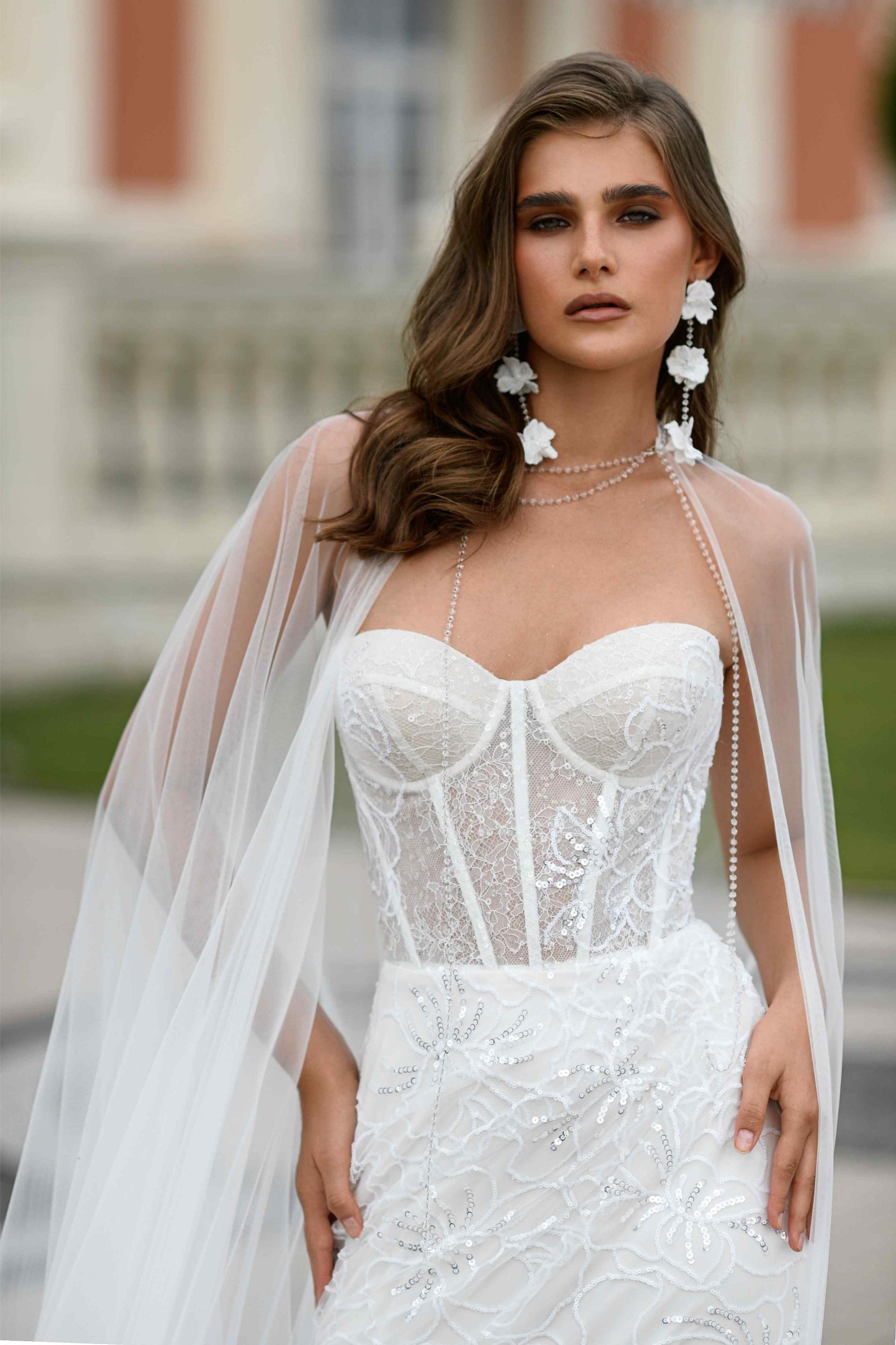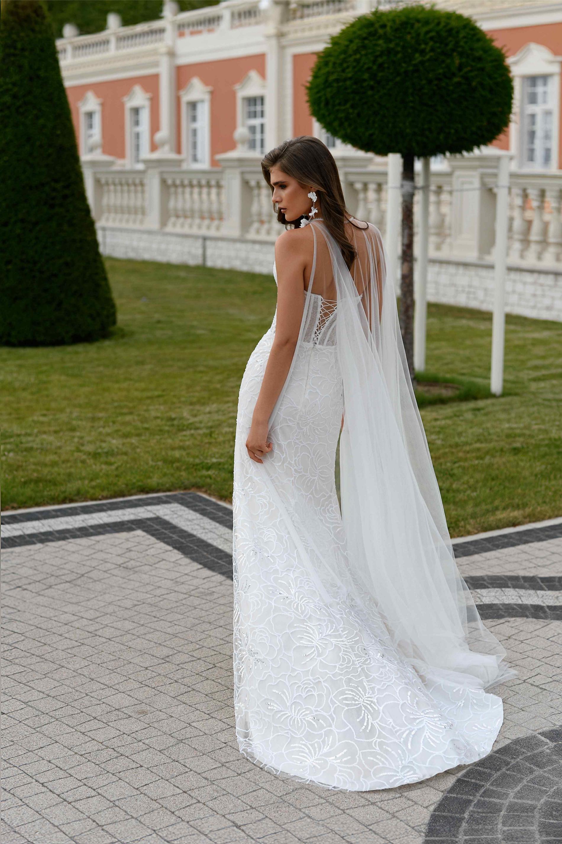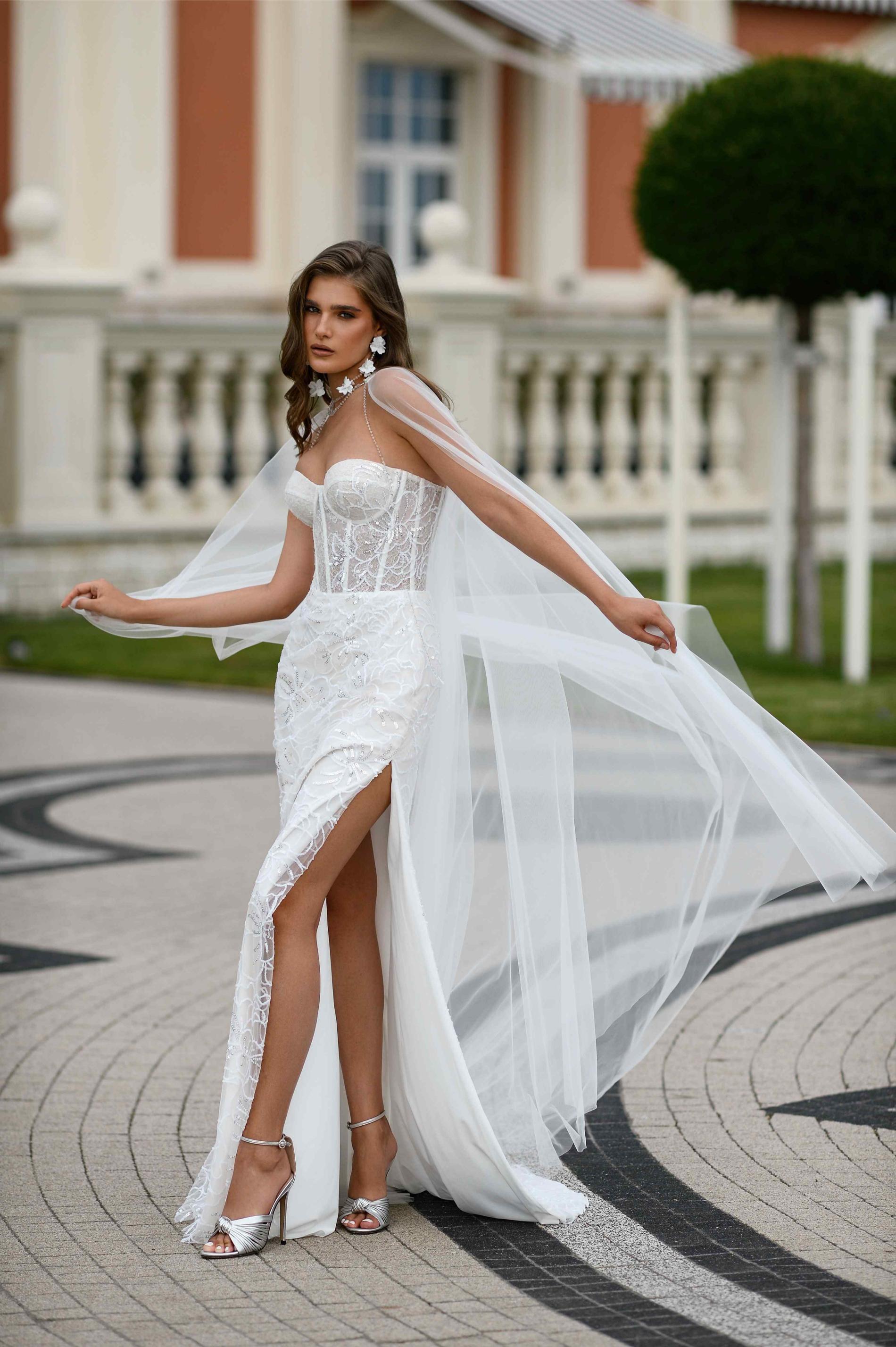 Свадебное платье в стиле «русалка» с корсетным лифом и открытыми плечами, выполненное из кружева и прозрачной сетки. Юбка с высоким разрезом и длинной фатиновой накидкой-шлейфом, которая красиво развевается на ветру. Наряд современный, грациозный и слегка дерзкий, идеально подчёркивает фигуру.
