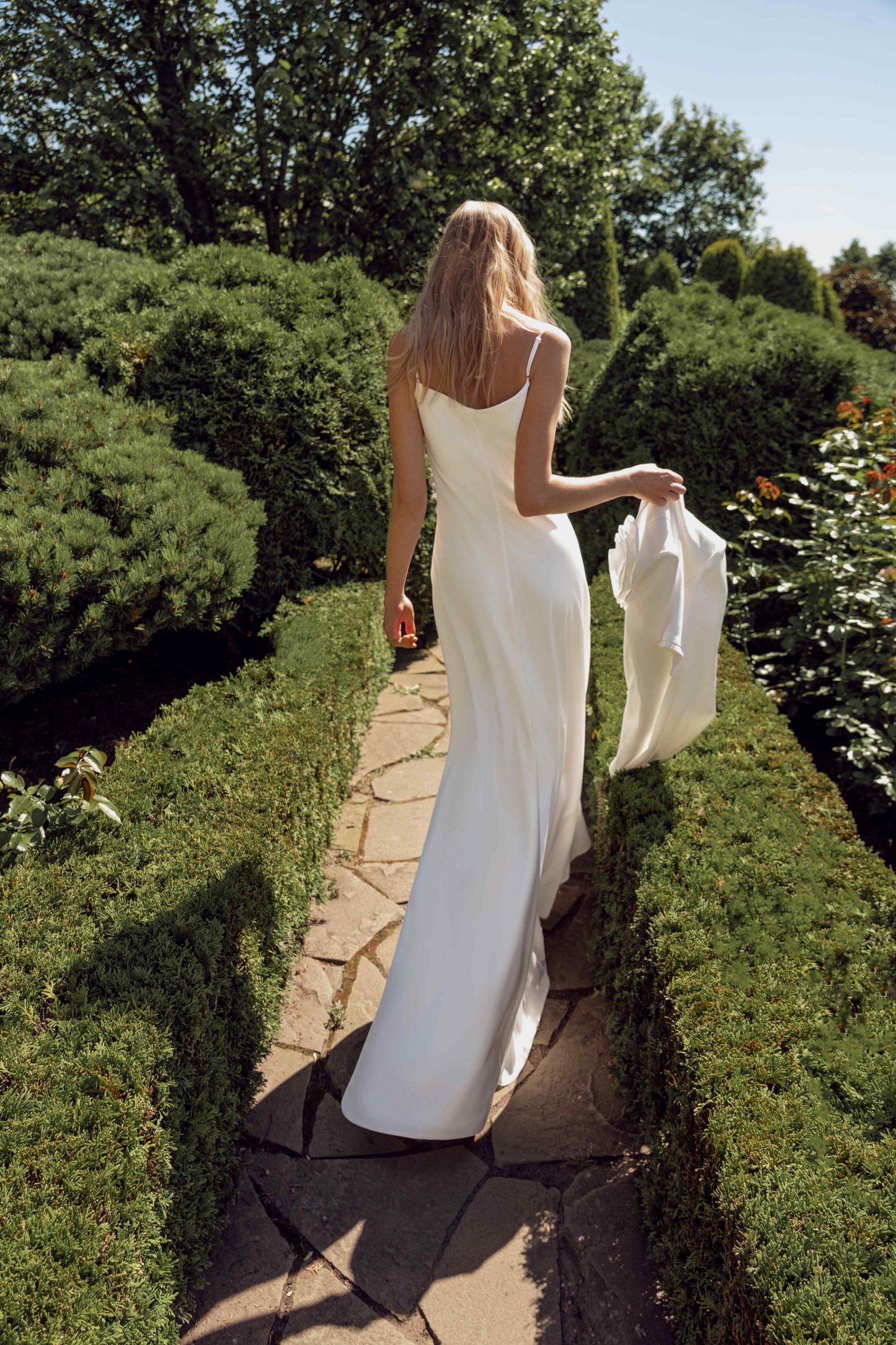 Свадебное платье выполнено в минималистичном стиле — это длинное, струящееся свадебное платье на тонких бретелях с V-образным вырезом и прямым свободным кроем. Ткань гладкая и слегка струящаяся, без декора, придаёт образу элегантность и лёгкость. Образ дополнен коротким жакетом на одной пуговице с акцентом в виде объемного тканевого цветка на плече, что придает наряду современность и индивидуальный шарм.