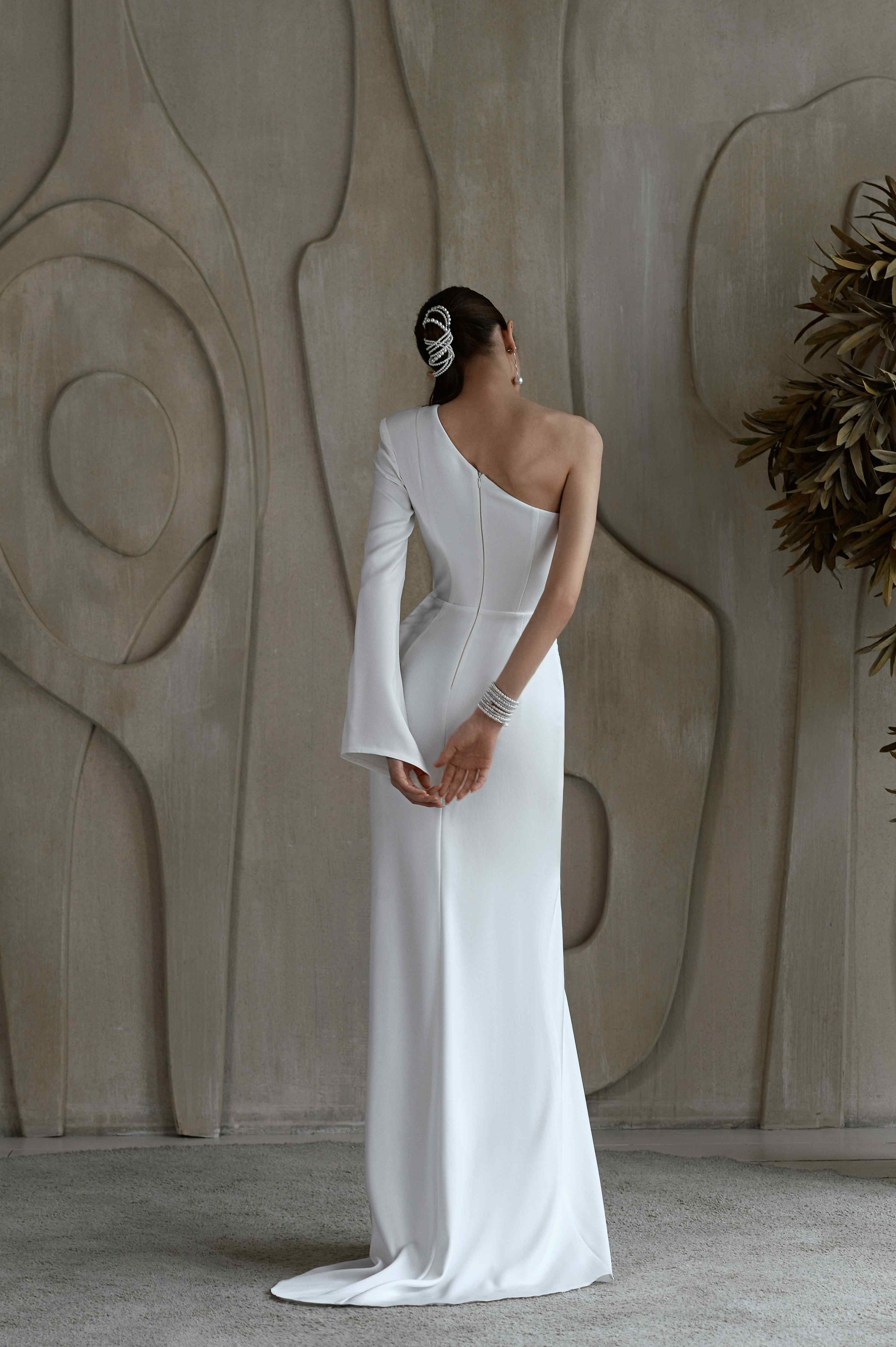Свадебное платье на одно плечо с длинным рукавом, глубоким V-образным вырезом и драпированной юбкой с разрезом. Ткань гладкая, образ дополняет массивный браслет и длинные серьги с жемчужинами.